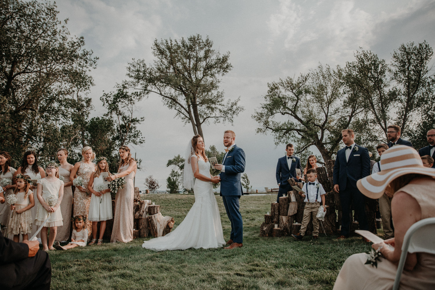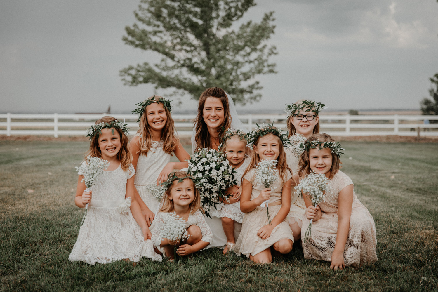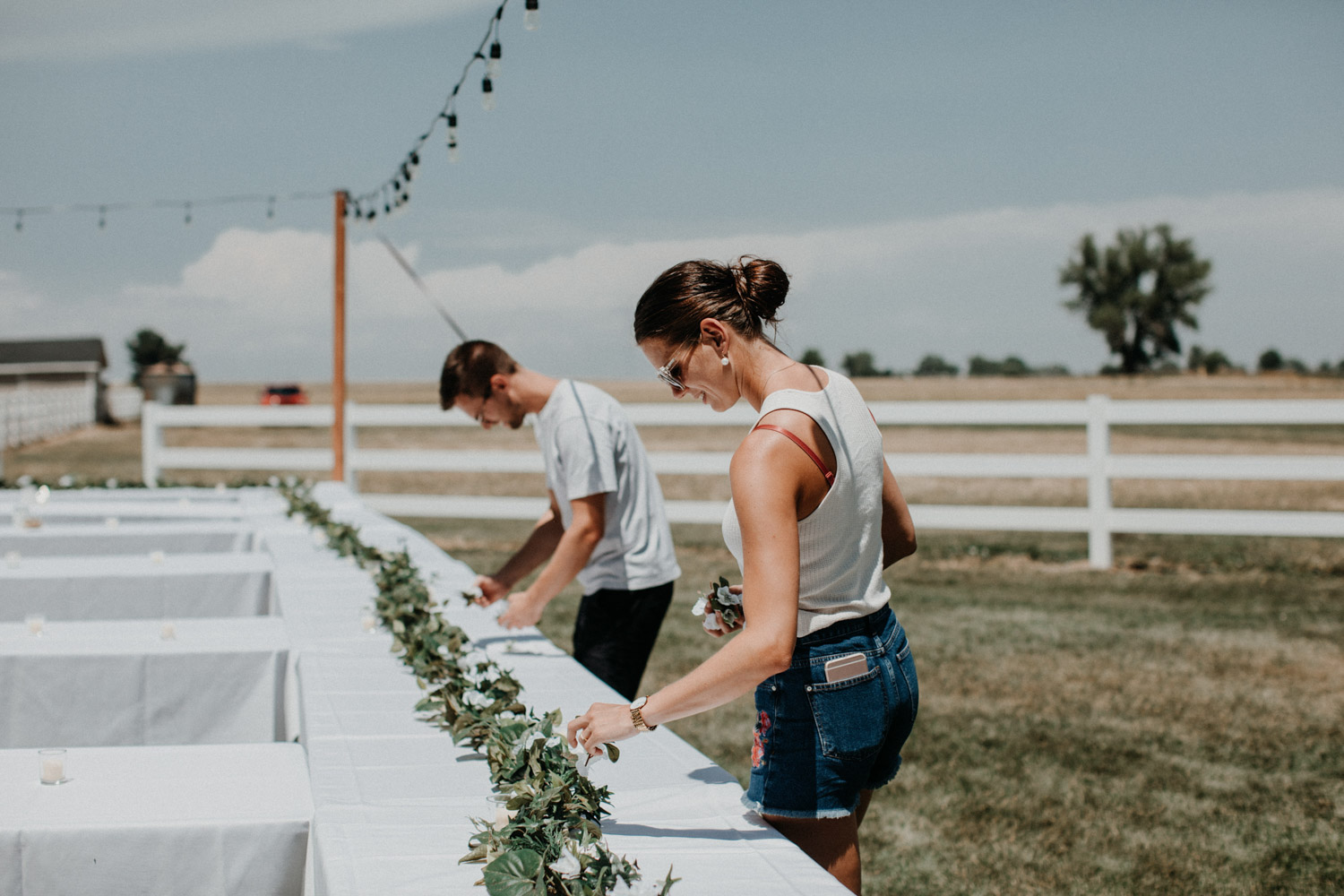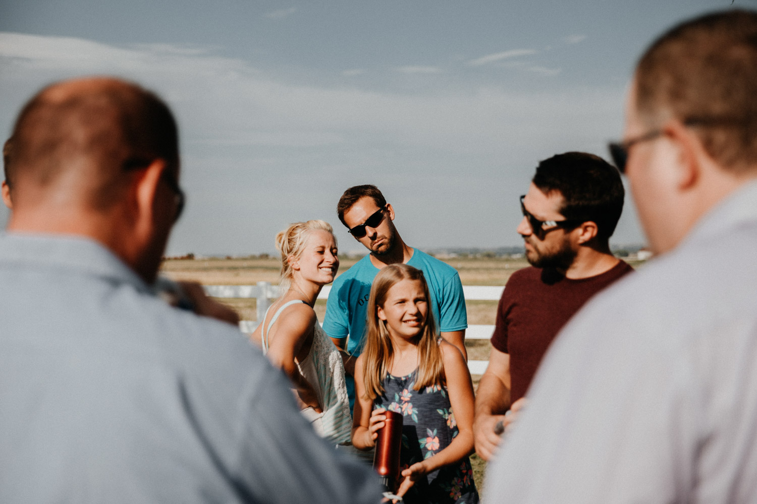 Es gibt Hochzeitsfotografen, man nennt sie “destination photographers”, deren Beruf ist es, jedes Wochenende in ein anderes Land zu einer sogenannten “destination wedding” zu reisen – also einer Hochzeit im Ausland, an einem besonders schönen Ort. Für viele kleinere Hochzeitsfotografen ist das der absolute Traum und sie arbeiten darauf hin, solche Buchungen zu bekommen. Auch ich würde dazu nicht nein sagen, trotzdem ist es für mich in meiner Situation nicht realistisch, das regelmässig zu machen, denn mein Hauptberuf ist ja ein anderer und ich kann es mir zeitlich nicht leisten, jedes Wochenende zu verreisen. Trotzdem ist es natürlich unglaublich reizvoll, und neben einer Hochzeit in der Toscana war auch eine Hochzeit in den USA schon lange ein kleiner Traum von mir. Andere Landschaften, andere Traditionen, andere Gebräuche – daraus entsteht eine andere Ästhetik, die man als Schweizer Hochzeitsfotografin nicht antrifft. Obwohl ich nicht seit 30 Jahren im Geschäft bin und noch keine 100 Hochzeiten fotografiert habe, freue ich mich immer, wenn ein Paar sich traut, seinen Tag etwas anders als all die anderen zu gestalten. Routine vernichtet zuverlässig die Kreativität, Abwechslung und neue Situationen hingegen fördern sie, und so habe ich mich wahnsinnig gefreut, als sich durch glückliche Umstände diese Möglichkeit für mich ergeben hat. Verhältnismässig kurzfristig haben wir das Ganze geplant, und durch viel guten und schlechten Stress in den Wochen davor konnte ich gar nicht zu viel darüber nachdenken. Irgendwann war der grosse Tag plötzlich da, und ich habe meine Koffer gepackt – zur Hälfte voll mit Kameras, Objektiven und Blitzen – und bin losgezogen. Nach knapp 11h Flug bin ich spät abends in Denver, Colorado gelandet und wurde von der zukünftigen Braut und 2 ihrer 11 Nichten und Neffen am Flughafen begrüsst. Keine 30min später fand ich mich schon zum ersten Mal in einem drive-through einer amerikanischen Fast-Food-Kette wieder – die Kinder, die so geduldig auf mich gewartet hatten sollten belohnt werden! 😀 Typisch amerikanisch – ich habe mich ebenso typisch schweizerisch der Zuckerbombe vorerst mal noch enthalten. Kurz später sind wir auf der Farm der sehr grossen Familie angekommen – mitten in Colorados Nirgendwo. Viel konnte ich in der Dunkelheit nicht erkennen, aber ich wurde herzlichst begrüsst und bin schon wenige Minuten später müde ins Bett gefallen. Lange hat der Spass nicht angehalten, Jetlag sei dank. Nachdem ich mich noch 6 Stunden wach im Bett gewälzt hatte, kam irgendwann Leben ins grosse Haus und ich hab nach und nach alle Familienmitglieder kennengelernt. Bis heute bin ich mir noch nicht bei allen sicher, von wem sie jetzt die Tochter oder der Bruder sind, aber die Herzlichkeit, mit der sie mich empfangen haben, ist ihnen allen gemein. So begann also eine Woche voll mit Vorbereitungen für den einen grossen Tag: Muffins backen (grob gesagt: eine Schicht Schokolade, eine Schicht Peanut Butter und darüber nochmal eine Schicht Schokolade), Deko auspacken und vorbereiten, Gastgeschenke verpacken, ein Besuch aller weiblichen Familienmitglieder bei der Maniküre, die Bachelorette-Party… Wir waren gut beschäftigt und die Tage vergingen wie im Flug. Am Tag vor der Hochzeit findet bei amerikanischen Hochzeiten traditionellerweise ein sogenanntes “rehearsal dinner” statt, eine Art Probedurchlauf. Die ganze Zeremonie wurde mit der gesamten “bridal party” (6 Brautjungfern, 6 Trauzeugen und jeweils ebensoviele Kinder, sprich 24 Personen) mehrmals durchexerziert, bis jedes Kind genau wusste, wann es wo stehen oder gehen soll.