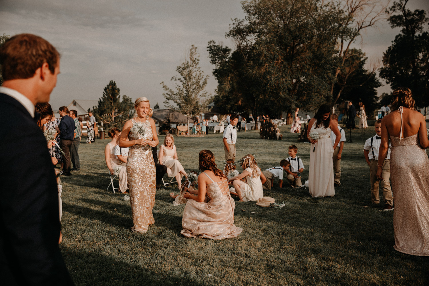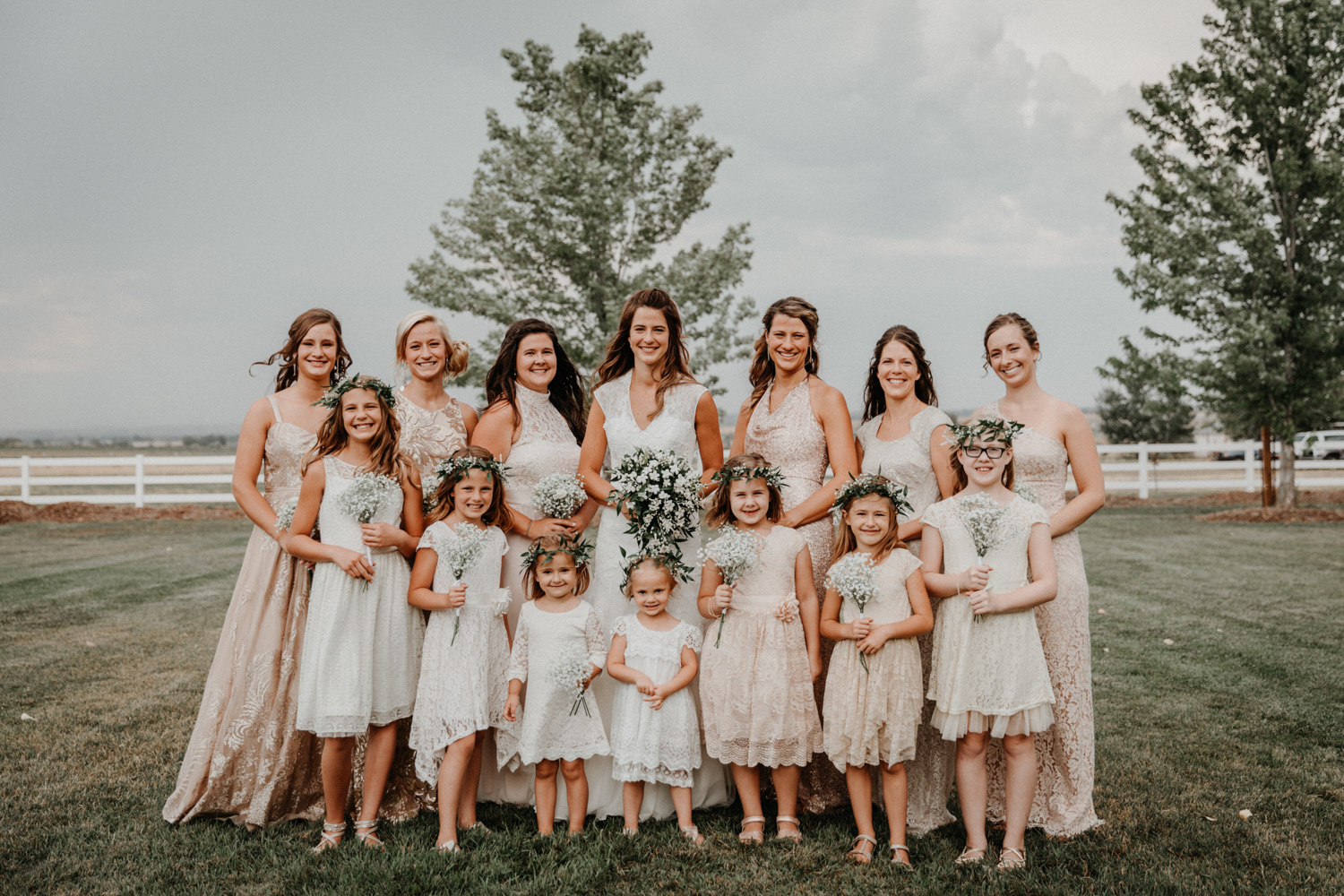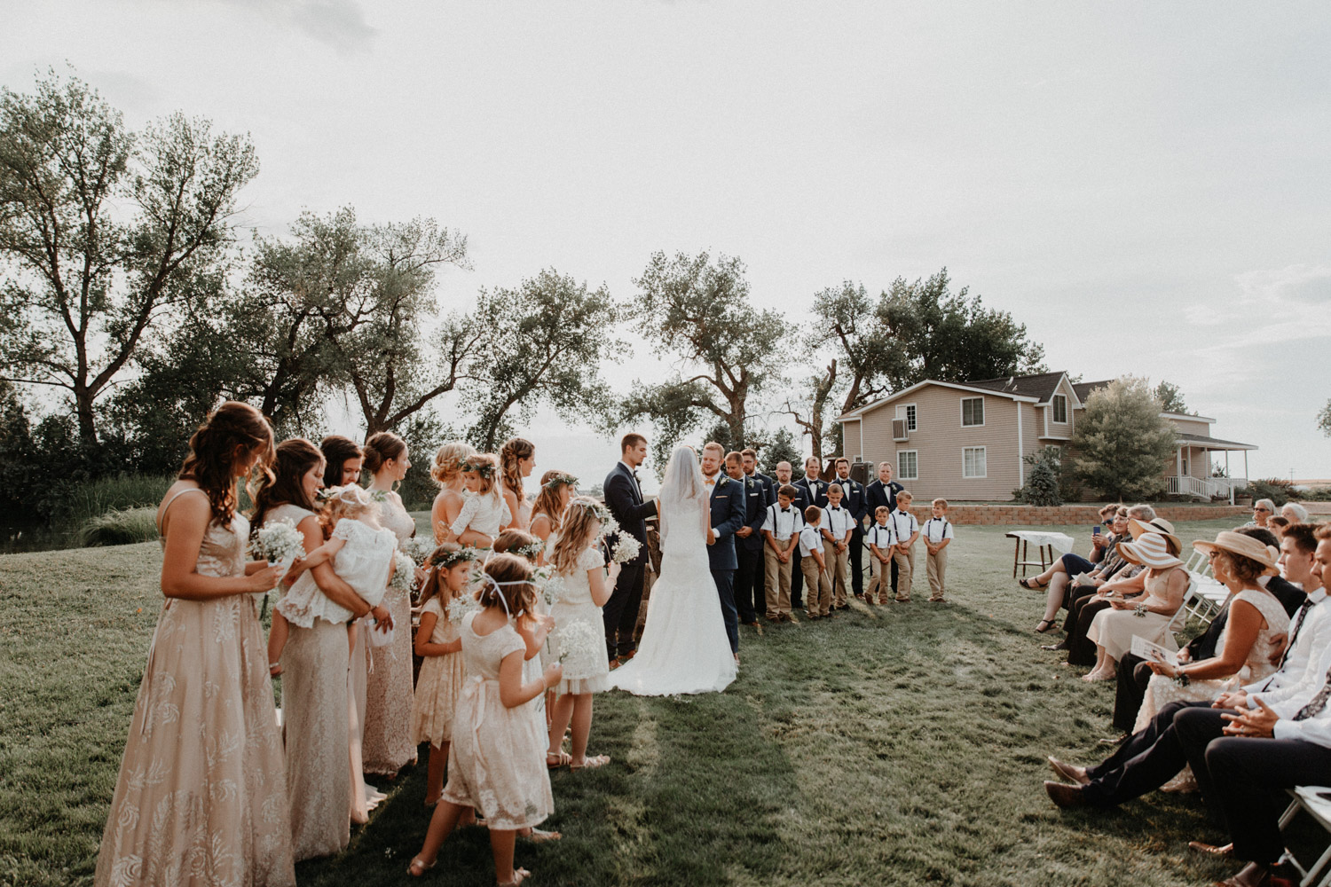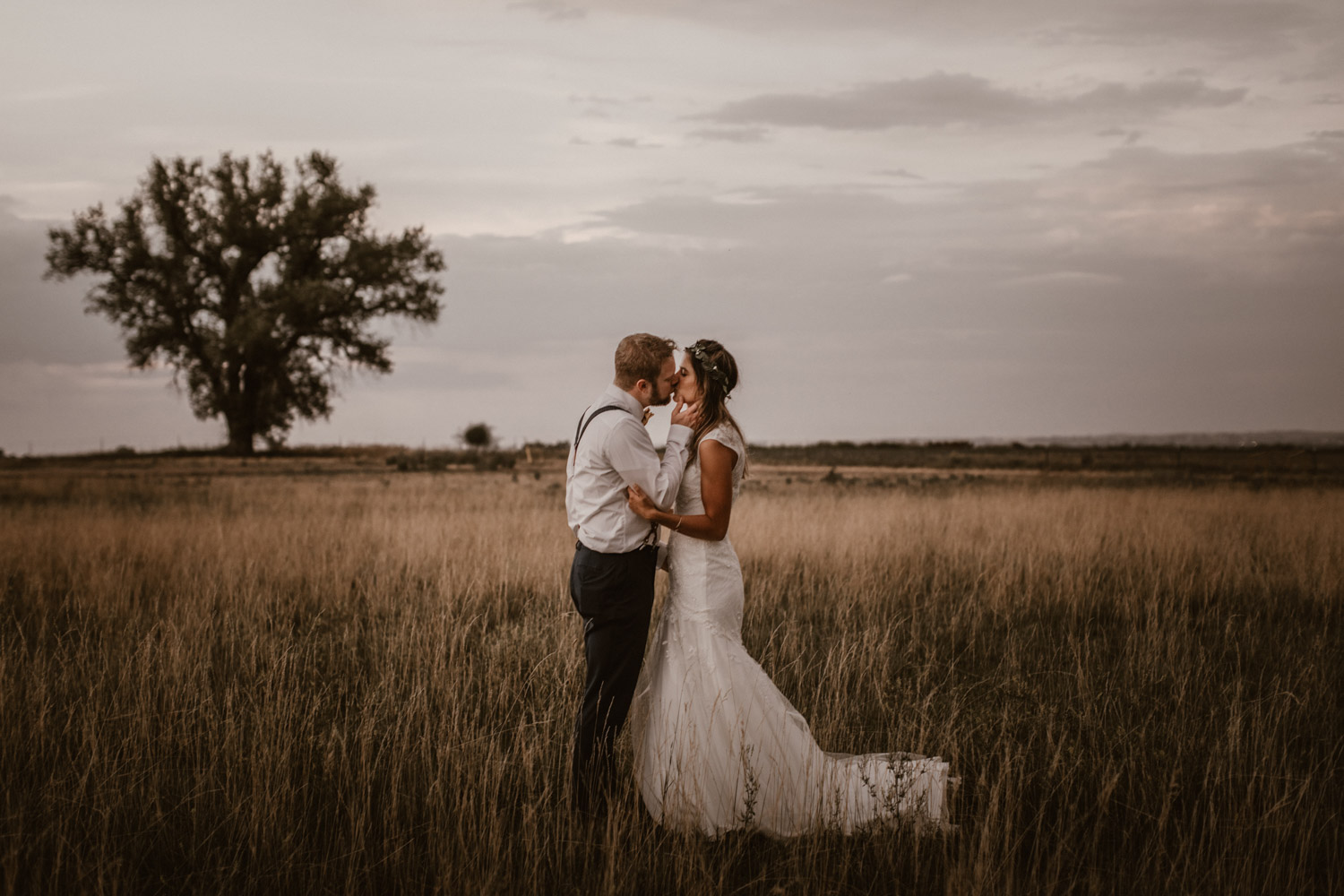 Perfekt vorbereitet war ein Tag später der grosse Moment also da, und obwohl die Trauung erst um 17:30 Uhr abends stattfand, begannen die Vorbereitungen (Haare & Make-Up) schon am Mittag. Ich glaube, man kann sich das Chaos lebhaft vorstellen, wenn eine Braut, 6 Trauzeuginnen und 6 kleine Mädchen in einem einzigen Raum parat gemacht werden müssen. Zwischendurch bin ich manchmal schnell ins Haus gegenüber gehuscht, denn da haben sich die “boys” vorbereitet: sie haben erstmal eine Runde Karten- oder Videospiele gespielt. Eine Ruheoase im Vergleich zum Haus nebenan! 37 Grad warm war es, und genau in dem Moment, in dem wir für die Fotos der bridal party nach draussen wollten, begann es zu regnen. “The weather in Colorado is safe in July” hat mir Camrianne ursprünglich mal gesagt – tja, nicht an dem Tag! Glücklicherweise hat es bald wieder aufgehört, und im Nachhinein waren wir ganz froh darum, denn so hat es ein bisschen abgekühlt. Nachdem wir die Gruppenfotos hinter uns gebracht hatten, wurde es langsam konkret. Eine kurze, aber wunderschöne und sehr lustige Trauung später war das Ganze auch schon vorbei und der Abend konnte beginnen. Ein lang gehegter Traum von mir ging auch da in Erfüllung: das Dinner fand unter freiem Himmel statt, dekoriert mit diesen wunderschönen Lichterketten aus Glühbirnen! Zur perfekten Zeit bei Sonnenuntergang habe ich die beiden kurz für ein perfektes Shooting entführt, denn wie ich oft meinen Brautpaaren sage: Viel Zeit braucht man dafür nicht (30-45min), aber perfektes Licht (bei Sonnenuntergang) ist so wichtig! Darauf folgten noch ein paar Reden, der klassische “first dance” wie auch der Vater-Tochter-Tanz – auch das auf einer Tanzfläche, die mit wunderschönen Lichterketten beleuchtet war. Fotografisch anspruchsvoll, aber einfach nur schön. Der “sparkler exit” am Schluss hat mir einen weiteren fotografischen Traum erfüllt, und so ging ein wunderschöner, aber sehr anstrengender Tag zu Ende. Zwei Tage und noch einem kurzen Besuch im Rocky Mountain National Park später bin ich mit ganz viel neuen Erlebnissen (und unzähligen gut und mehrfach gesicherten Fotos) zurück in die Schweiz geflogen. Danke an alle, die das ermöglicht haben – ein unglaubliches Erlebnis.