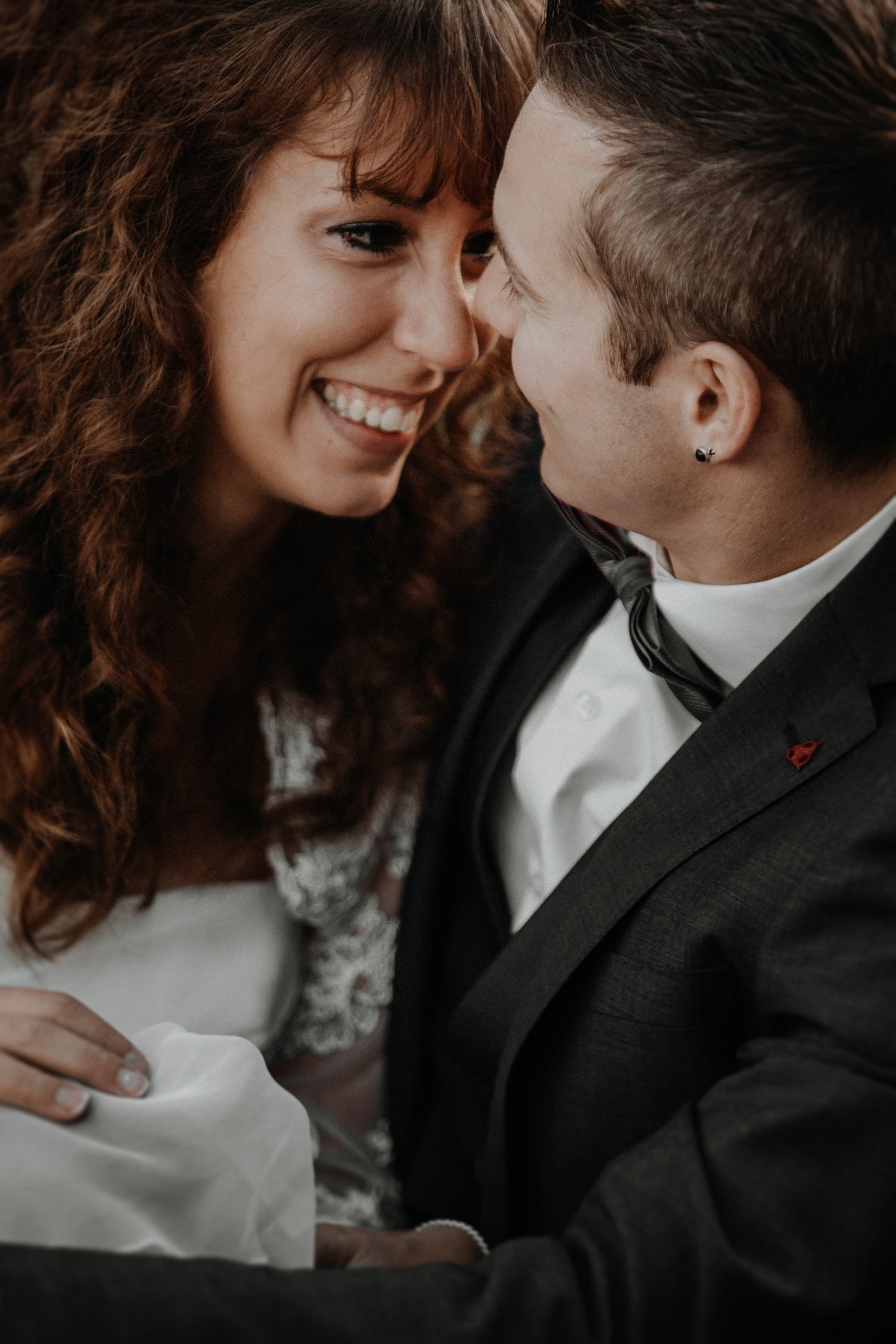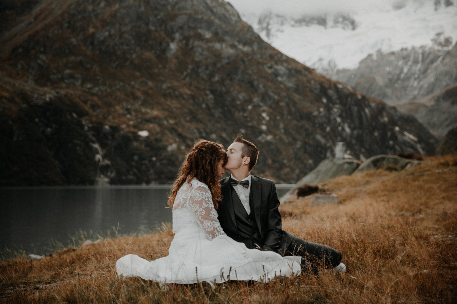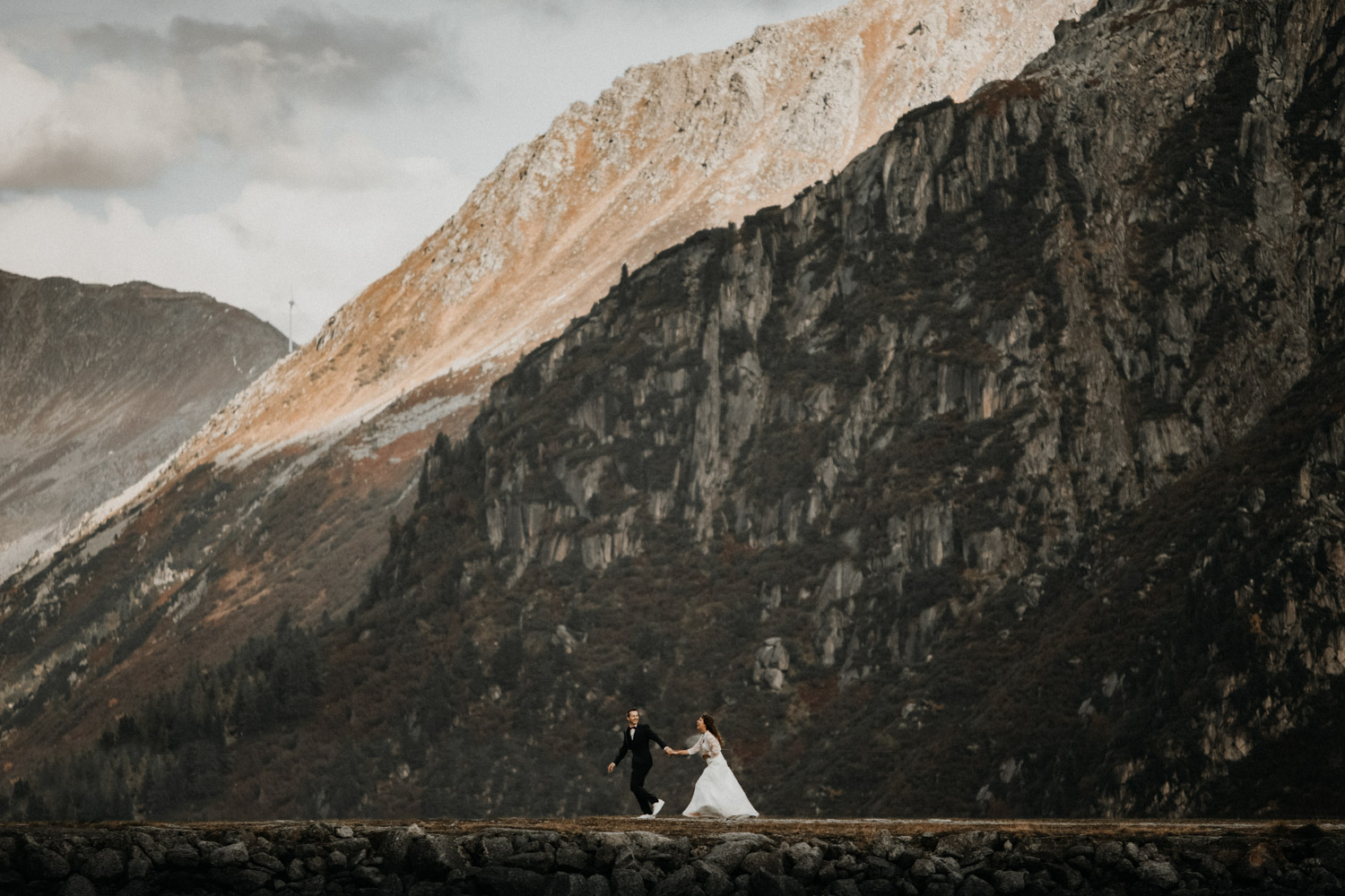 Meine Hochzeitspaare haben immer die freie Wahl: Entweder ein Hochzeitsshooting am Tag der Hochzeit selber oder ein sogenanntes “Aftershooting”, sprich ein Shooting an einem anderen Tag, nach der Hochzeit. Die zweite Variante bedeutet viel mehr Aufwand (für beide Seiten!), aber es gibt zwei ganz entscheidende Vorteile: Man kann sowohl Tageszeit (= Licht!) als auch die Location frei wählen. Und diese zwei Dinge sind so, so wichtig! Wenn man Glück hat, findet man auch während der Hochzeit zur richtigen Stunde Zeit, und eventuell hat man auch noch einen schönen Ort ums Eck. Aber oft ist das nicht so der Fall, und darum biete ich diese Möglichkeit für alle Paare – ohne Mehrkosten. Denise & Simon haben es genutzt, und so sind wir zwei Wochen nach der Hochzeit losgefahren, Richtung Berge. Schon ewig war ich nicht mehr dort! Und es war absolut atemberaubend. Das war natürlich auch dem Umstand zu verdanken, dass wir uns eine absolut wunderschöne Zeit ausgesucht haben. Alle Bäume waren in Gelb- und Rottöne gehüllt, wir hätten es wohl nicht besser treffen können. Und so waren wir uns nach diesem ganz speziellen Shooting alle einig, ohne die Bilder gesehen zu haben: Das hat sich gelohnt.