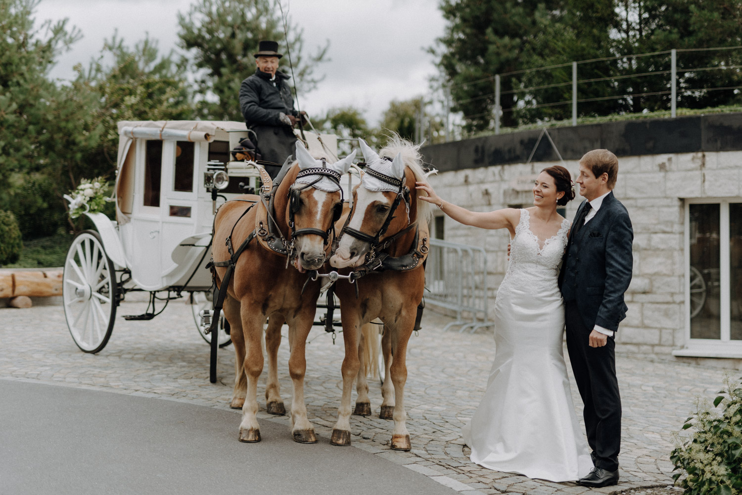 For a brief photoshoot before the ceremony, we were allowed to use Villa Honegg with its beautiful view of the mountains and Lake Lucerne. Like me, Ariane is a horse lover, which is why they were suprised with a horse carriage, which brought them to the small chapel in Ennetbürgen. What a beautiful couple! Thank you for trusting me as your wedding photographer.