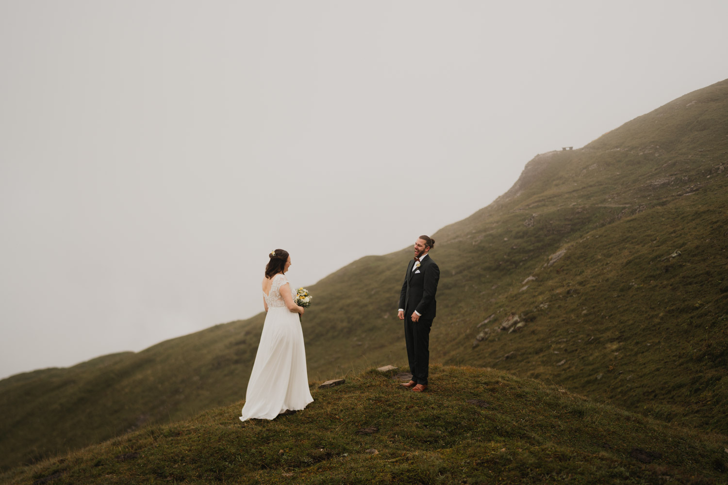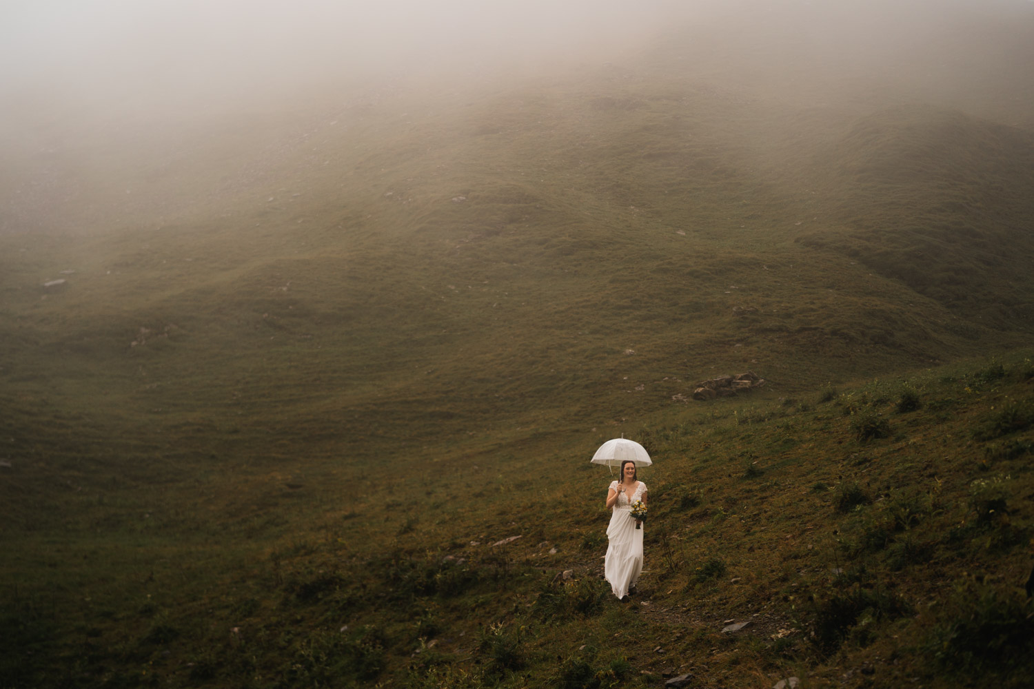 Sometimes things don’t go as planned – and then you realize that’s exactly how it was meant to be. Viktoria & Cedric got married at the end of August on the Jochpass in Engelberg, high above Lake Trübsee, in the cozy Bärghuis. We had all been hoping for sunshine, but instead we were met with fog and occasional rain. Within minutes, the thick grey mist would give way to breathtaking mountain views, only to close in again. And yet, it was absolutely beautiful.