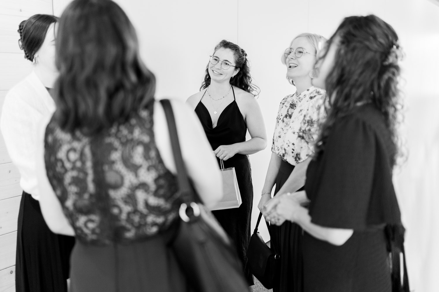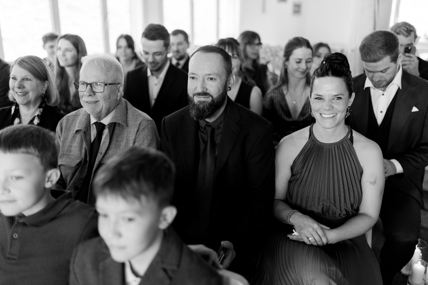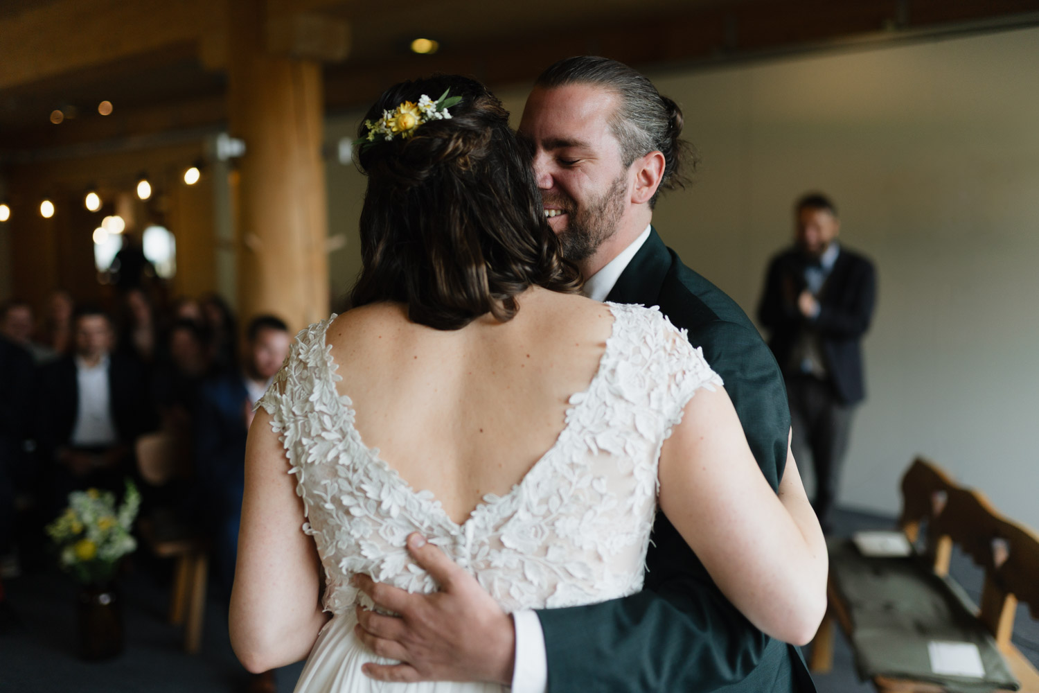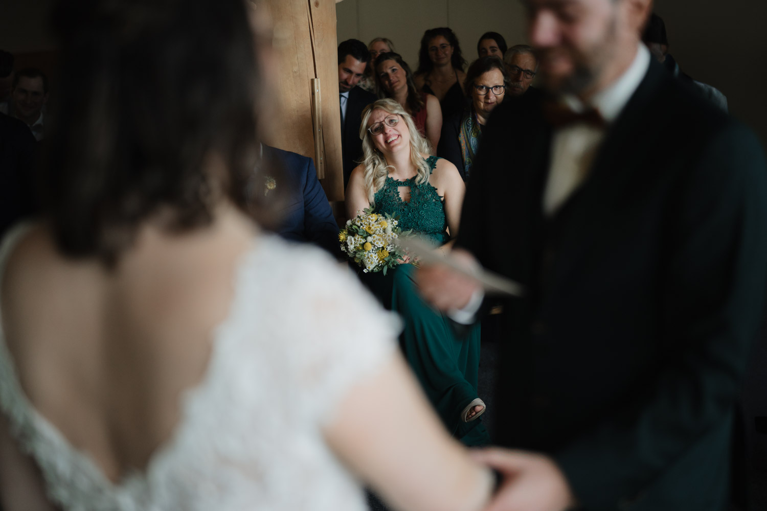 The First Look was a pretty wet one, but nothing could stop these two. Thankfully, Esther from Stör Frisör was still around for a quick “second Getting Ready”. We had to blow-dry not only the bride’s hair, but also the dress. Luckily, we had planned plenty of extra time. The outdoor ceremony had to be cancelled, but that didn’t dampen the mood at all. Jonas (Liebe Feiern) led the ceremony and told their story in such a heartfelt and humorous way that I didn’t have to look far to catch those emotional tear-wiping moments.