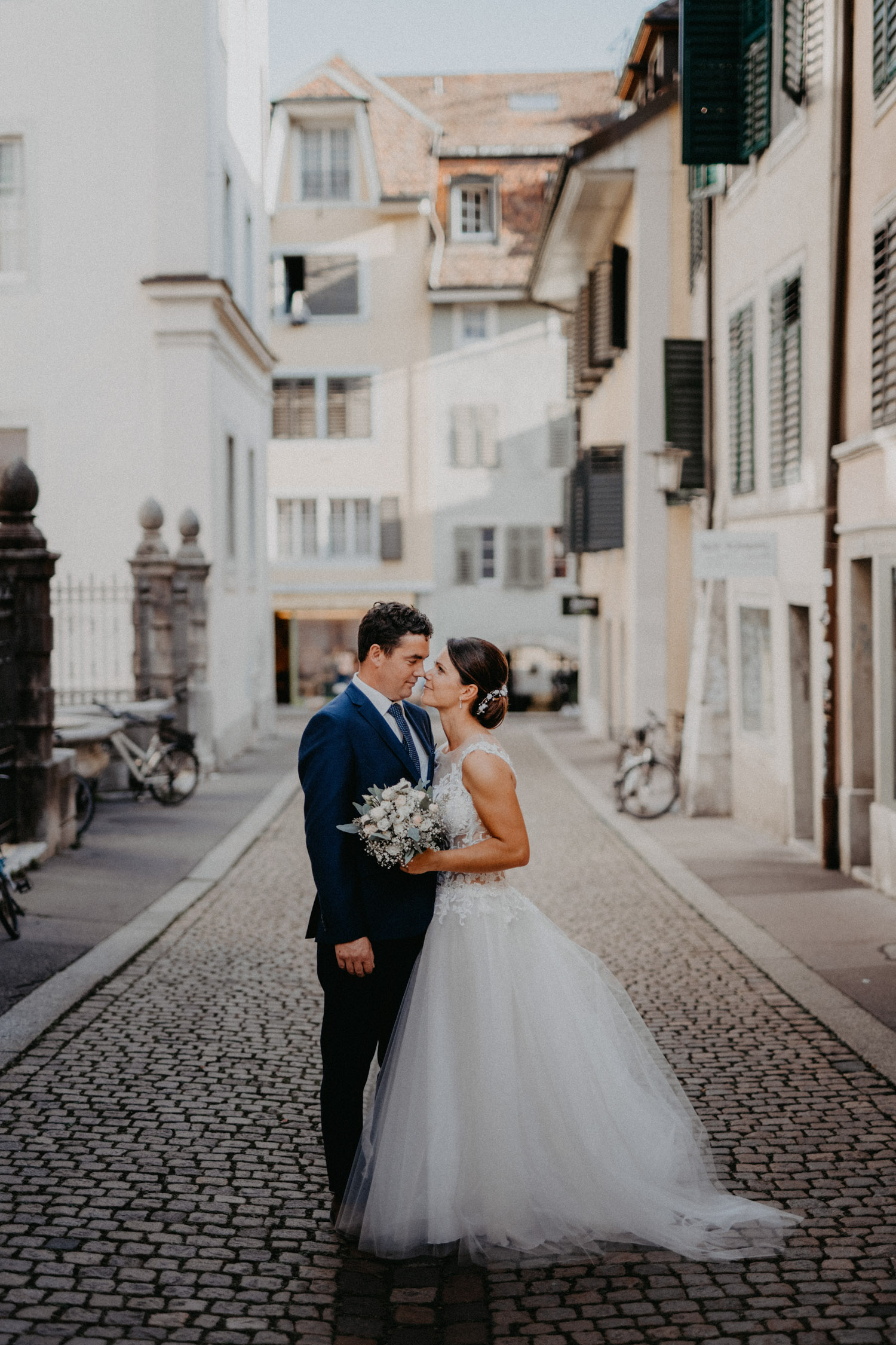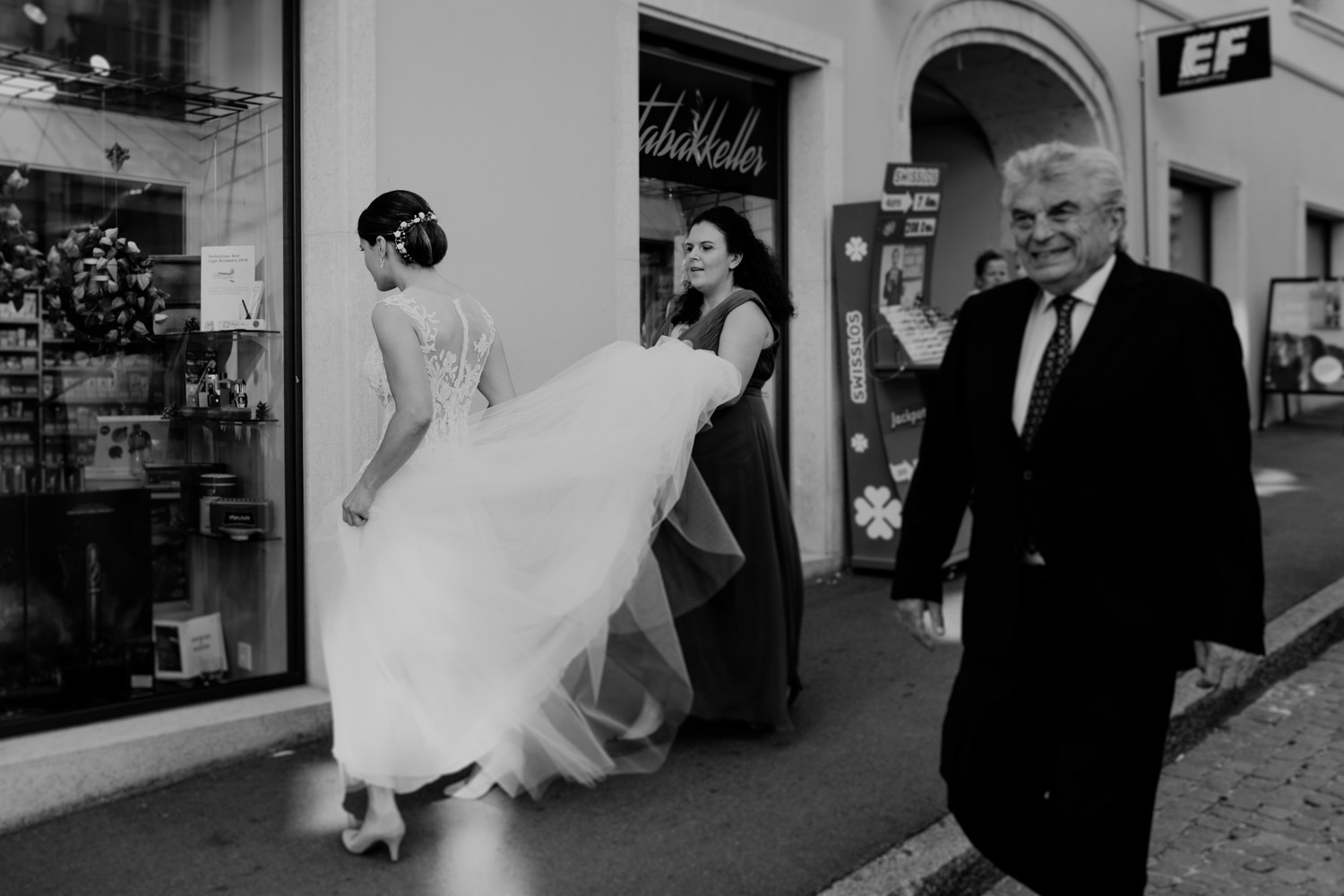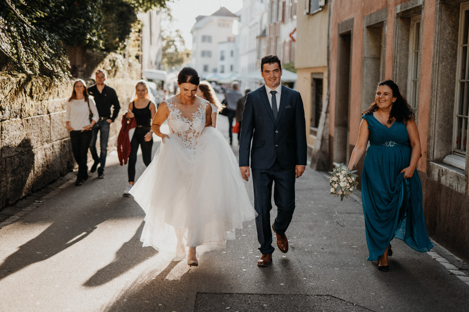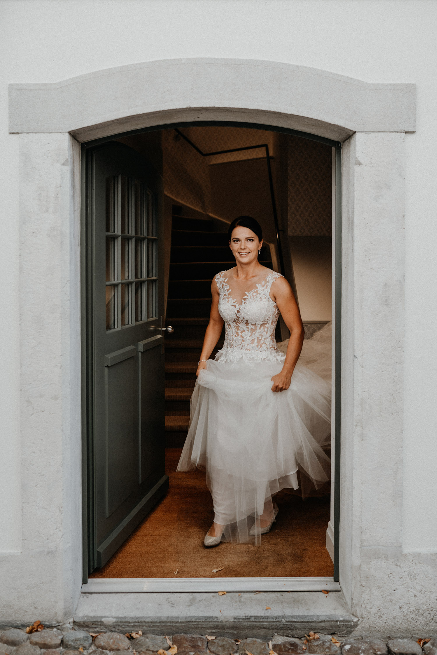 Ever since I saw this beautiful church for the first time, I’ve dreamed about being booked as a wedding photographer in the St. Ursus Cathedral in Solothurn, Switzerland. Even though Chrissi and Silvan didn’t get married in the St.Ursus Cathedral itself, we still had the chance to take some portraits in there. The whole day started by getting ready in the beautiful La Couronne hotel in the old town of Solothurn. While organizing the last few things over the phone, Chrissi was made up by her sister and got dressed in her absolutely stunning wedding dress. Since their location for the ceremony was only a few hundred meters away, Chrissi, her sister and her father all walked together from the hotel to the location of the wedding ceremony. I absolutely loved it! Such a beautiful and meaningful thing to do, and an awesome opportunity for me to take pictures in an unposed and documentary style. The old town of Solothurn was crowded with people because there was an autumn festival that day, and I heard so many people whisper about how beautiful Chrissi looked! After a short but very funny and heart-warming ceremony (held by the sister and a good friend of the two), Chrissi and Silvan had their reception in a small park right next to the river. Then, finally, we left to take the portraits and strolled through the old town towards the St. Ursus Cathedral. There are so many spots to take good couple portraits in such a gorgeous place! Old buildings, coloured walls, small alleys… and of course the cathedral! The lighting was breath-taking in there!