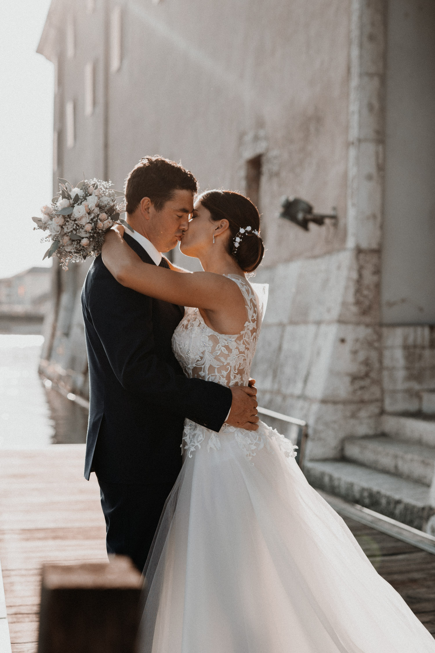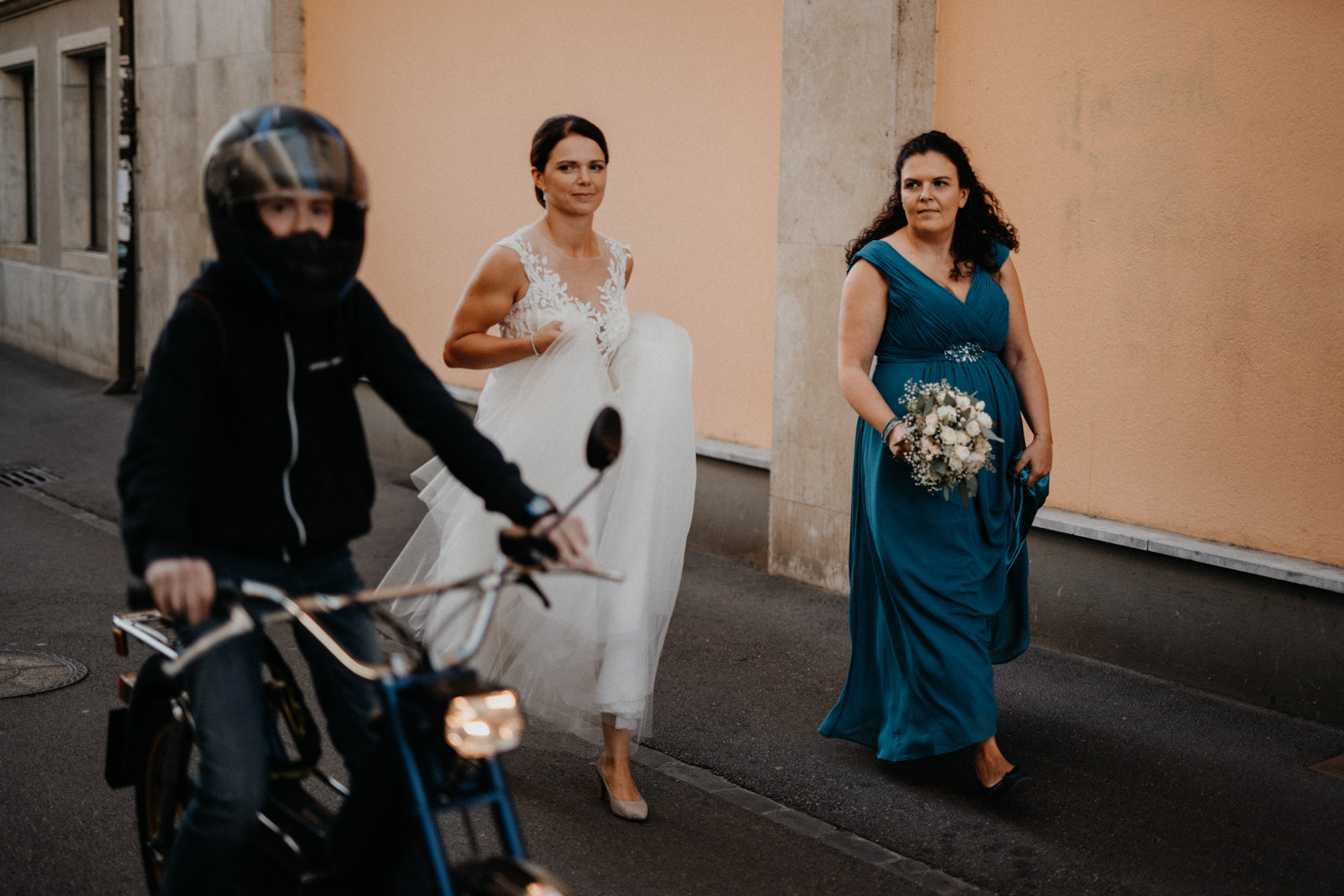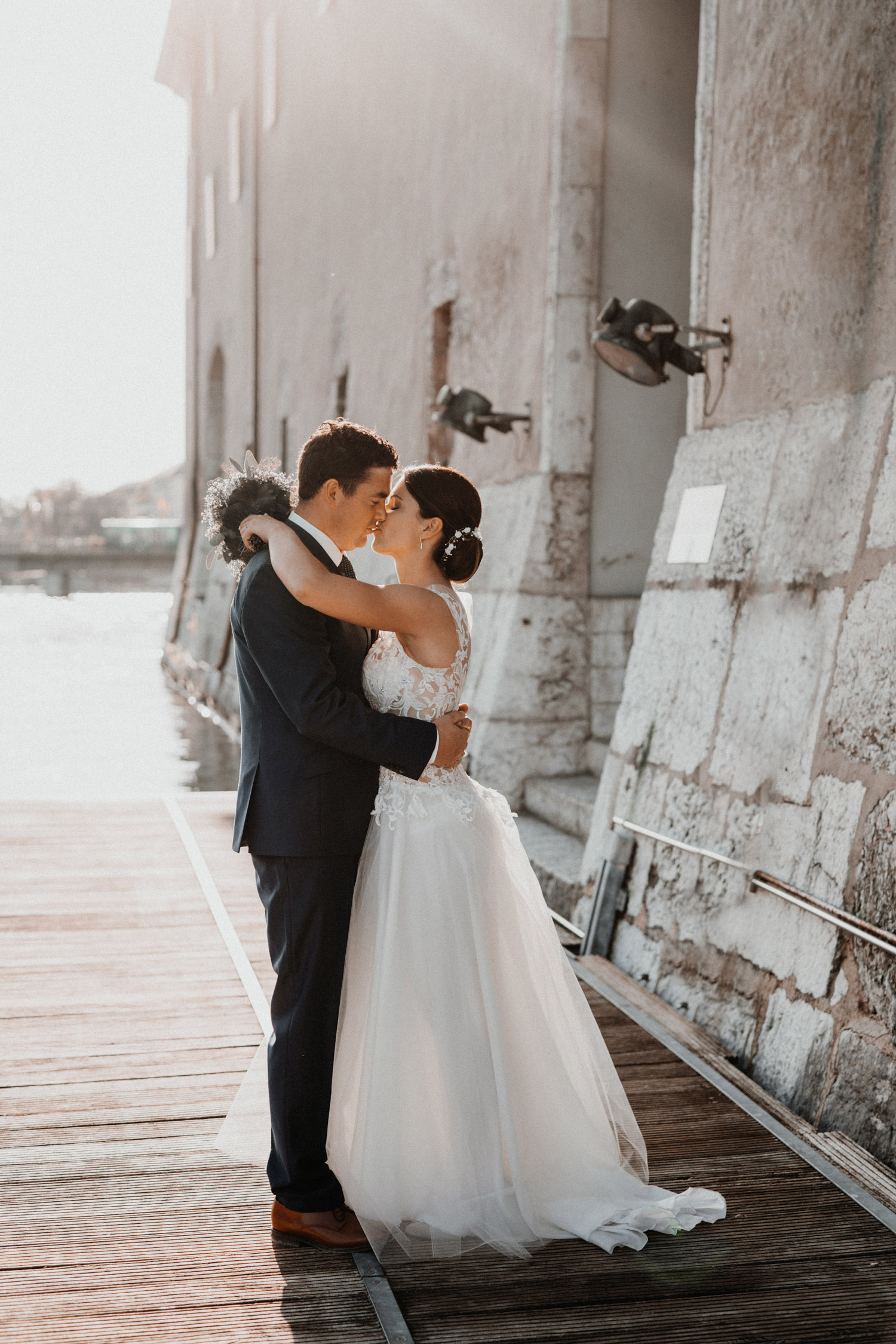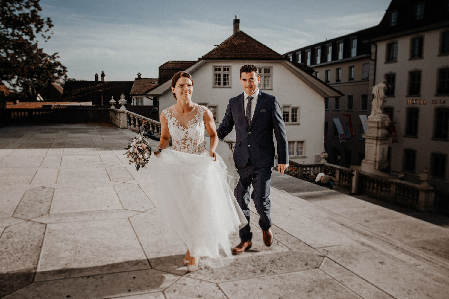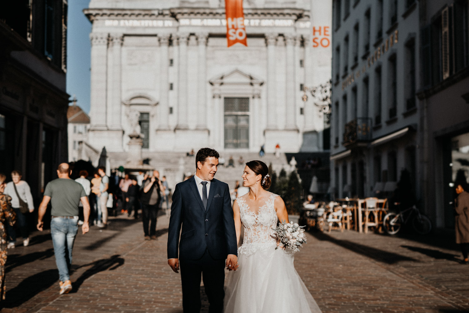 Ever since I saw this beautiful church for the first time, I’ve dreamed about being booked as a wedding photographer in the St. Ursus Cathedral in Solothurn, Switzerland. Even though Chrissi and Silvan didn’t get married in the St.Ursus Cathedral itself, we still had the chance to take some portraits in there. The whole day started by getting ready in the beautiful La Couronne hotel in the old town of Solothurn. While organizing the last few things over the phone, Chrissi was made up by her sister and got dressed in her absolutely stunning wedding dress. Since their location for the ceremony was only a few hundred meters away, Chrissi, her sister and her father all walked together from the hotel to the location of the wedding ceremony. I absolutely loved it! Such a beautiful and meaningful thing to do, and an awesome opportunity for me to take pictures in an unposed and documentary style. The old town of Solothurn was crowded with people because there was an autumn festival that day, and I heard so many people whisper about how beautiful Chrissi looked! After a short but very funny and heart-warming ceremony (held by the sister and a good friend of the two), Chrissi and Silvan had their reception in a small park right next to the river. Then, finally, we left to take the portraits and strolled through the old town towards the St. Ursus Cathedral. There are so many spots to take good couple portraits in such a gorgeous place! Old buildings, coloured walls, small alleys… and of course the cathedral! The lighting was breath-taking in there!