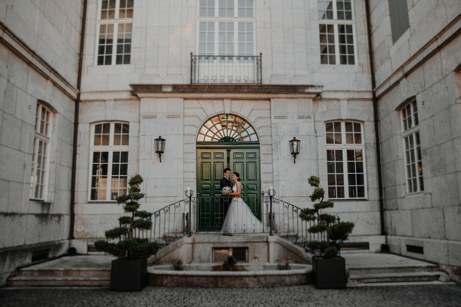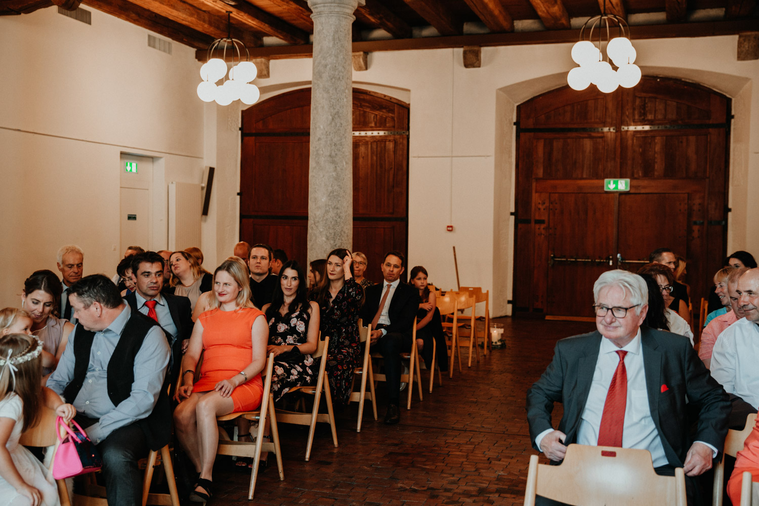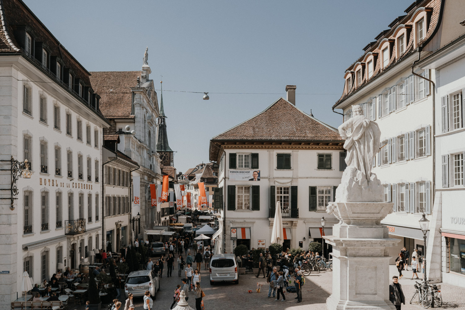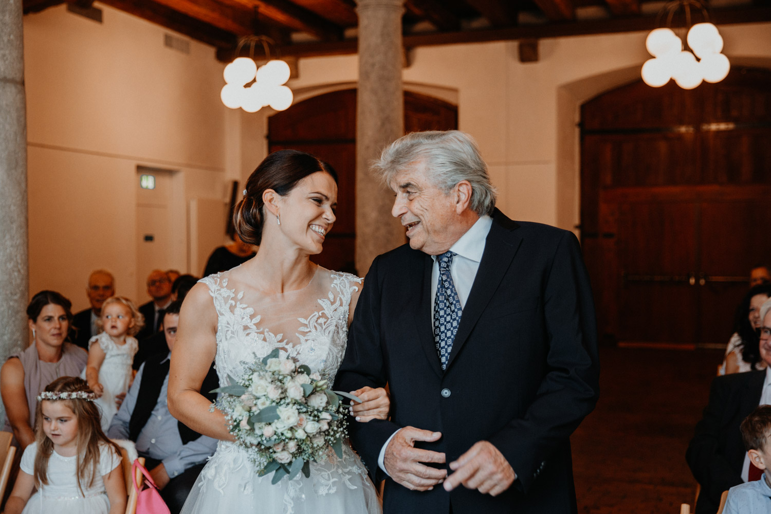 Ever since I saw this beautiful church for the first time, I’ve dreamed about being booked as a wedding photographer in the St. Ursus Cathedral in Solothurn, Switzerland. Even though Chrissi and Silvan didn’t get married in the St.Ursus Cathedral itself, we still had the chance to take some portraits in there. The whole day started by getting ready in the beautiful La Couronne hotel in the old town of Solothurn. While organizing the last few things over the phone, Chrissi was made up by her sister and got dressed in her absolutely stunning wedding dress. Since their location for the ceremony was only a few hundred meters away, Chrissi, her sister and her father all walked together from the hotel to the location of the wedding ceremony. I absolutely loved it! Such a beautiful and meaningful thing to do, and an awesome opportunity for me to take pictures in an unposed and documentary style. The old town of Solothurn was crowded with people because there was an autumn festival that day, and I heard so many people whisper about how beautiful Chrissi looked! After a short but very funny and heart-warming ceremony (held by the sister and a good friend of the two), Chrissi and Silvan had their reception in a small park right next to the river. Then, finally, we left to take the portraits and strolled through the old town towards the St. Ursus Cathedral. There are so many spots to take good couple portraits in such a gorgeous place! Old buildings, coloured walls, small alleys… and of course the cathedral! The lighting was breath-taking in there!
