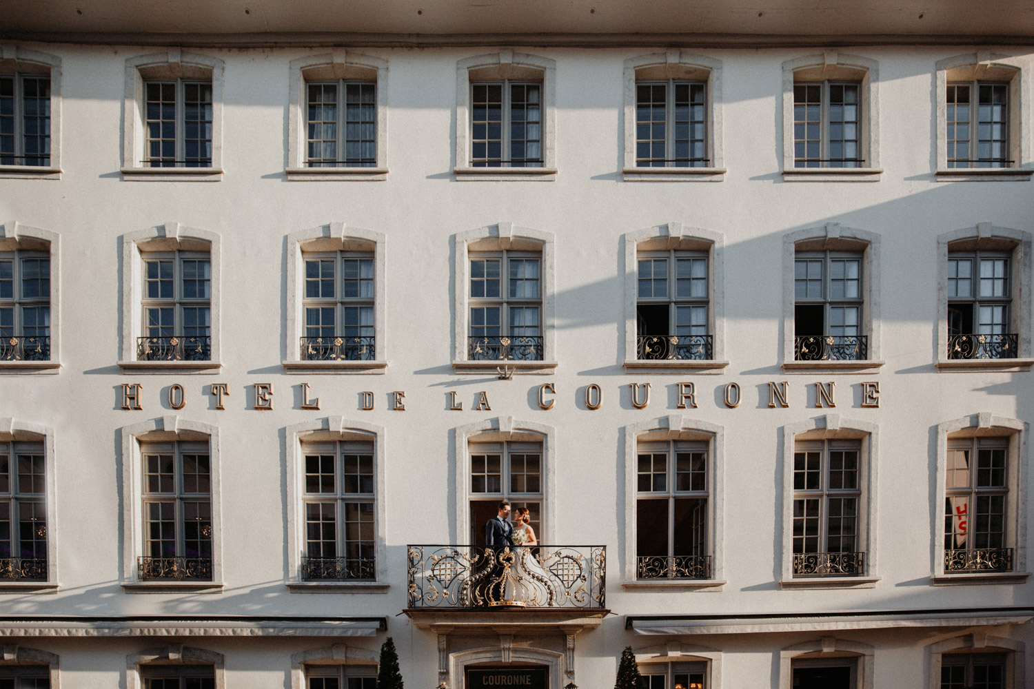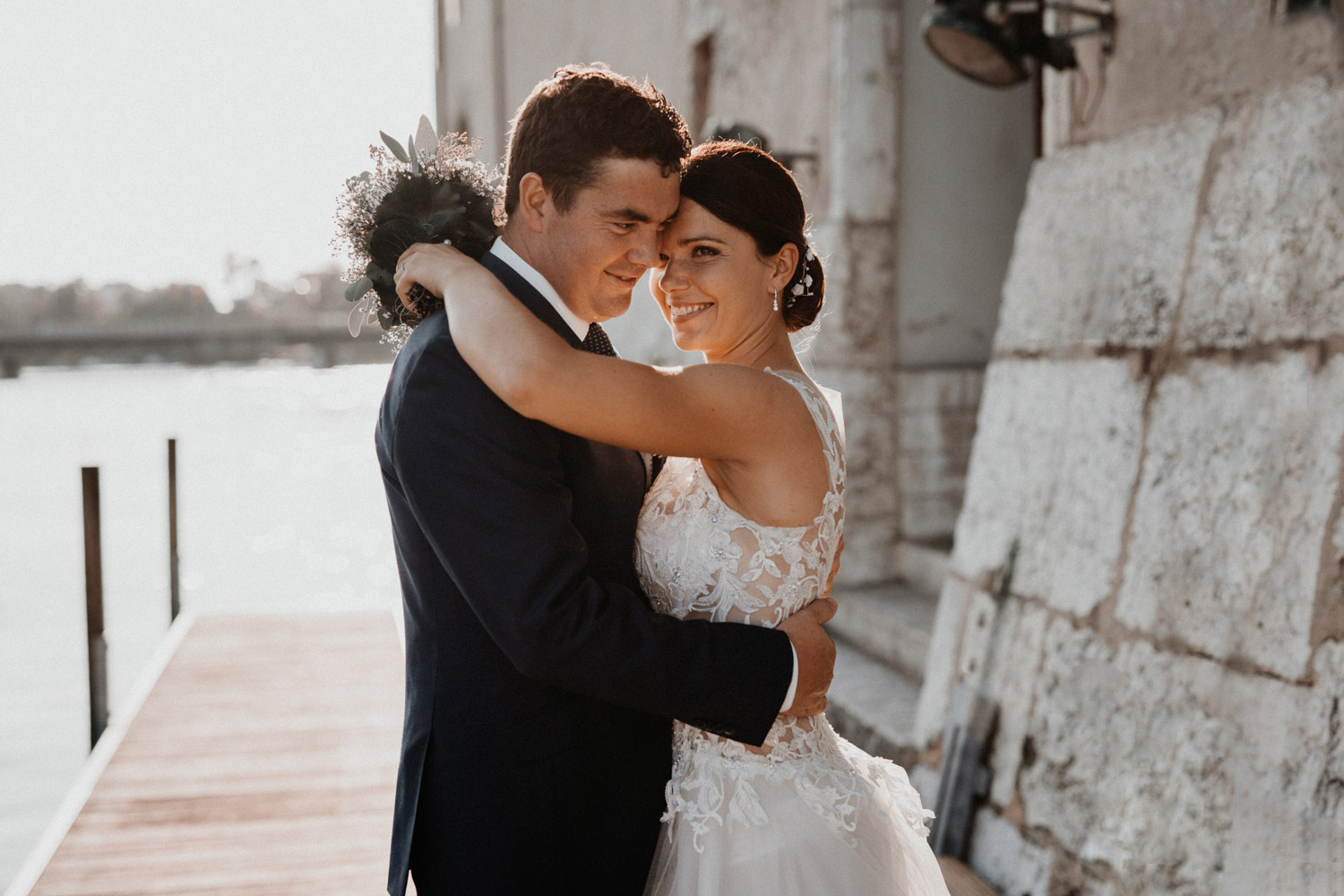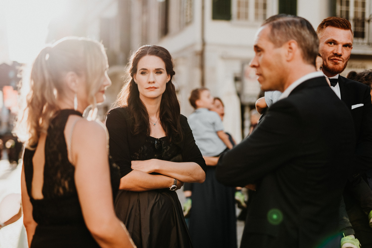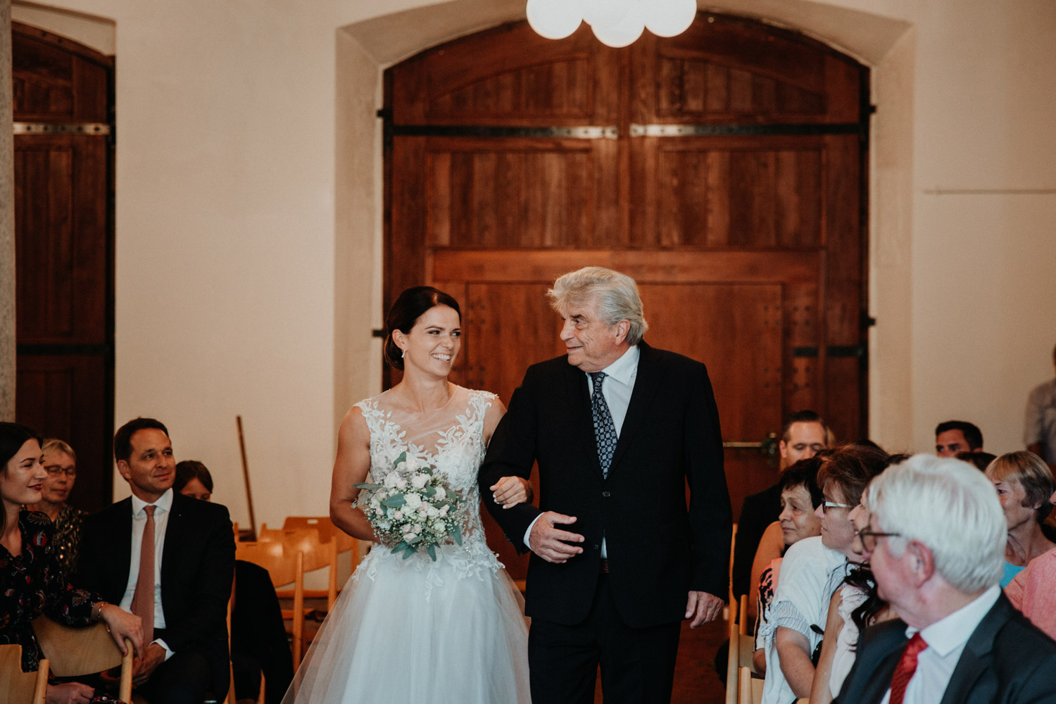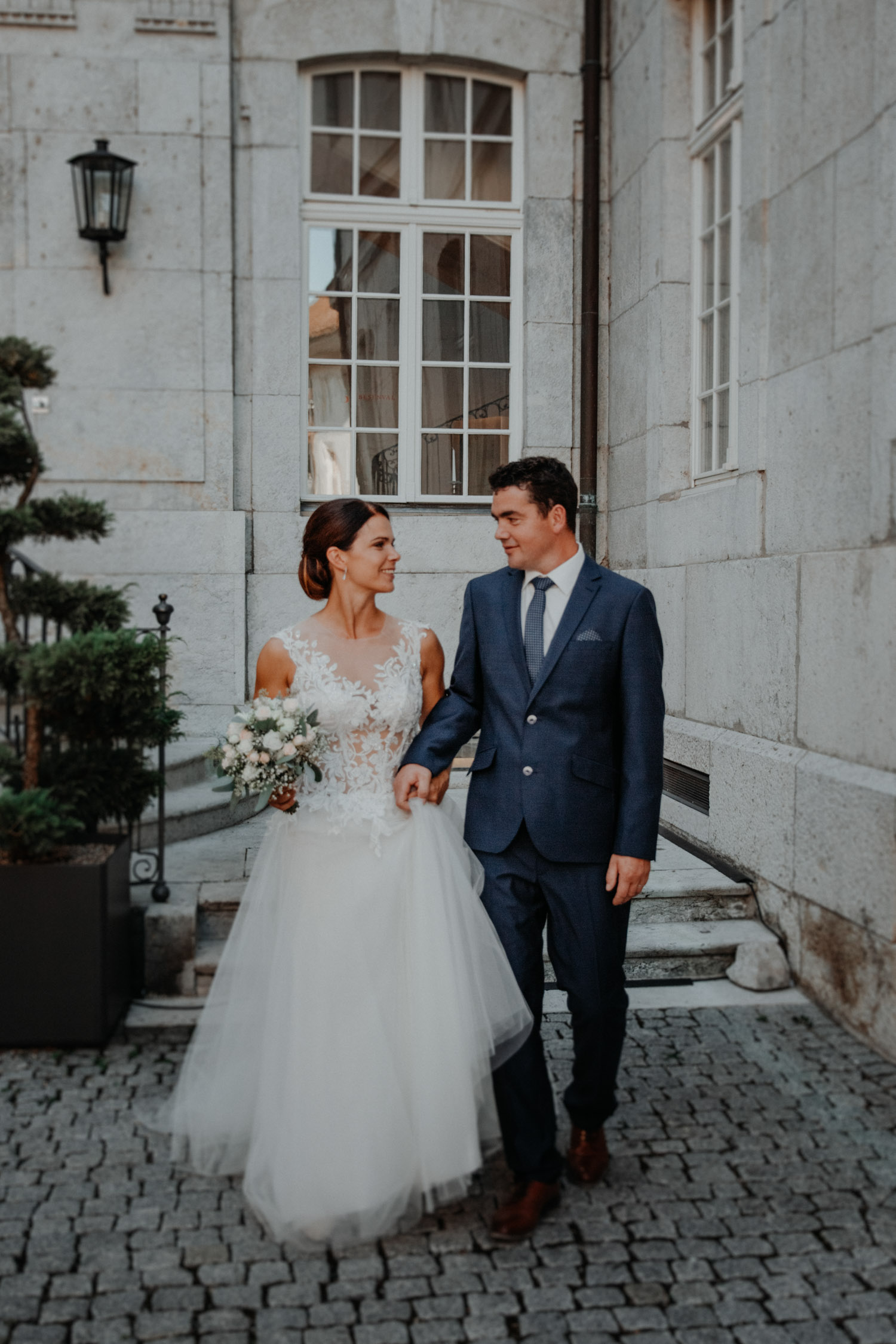 Ever since I saw this beautiful church for the first time, I’ve dreamed about being booked as a wedding photographer in the St. Ursus Cathedral in Solothurn, Switzerland. Even though Chrissi and Silvan didn’t get married in the St.Ursus Cathedral itself, we still had the chance to take some portraits in there. The whole day started by getting ready in the beautiful La Couronne hotel in the old town of Solothurn. While organizing the last few things over the phone, Chrissi was made up by her sister and got dressed in her absolutely stunning wedding dress. Since their location for the ceremony was only a few hundred meters away, Chrissi, her sister and her father all walked together from the hotel to the location of the wedding ceremony. I absolutely loved it! Such a beautiful and meaningful thing to do, and an awesome opportunity for me to take pictures in an unposed and documentary style. The old town of Solothurn was crowded with people because there was an autumn festival that day, and I heard so many people whisper about how beautiful Chrissi looked! After a short but very funny and heart-warming ceremony (held by the sister and a good friend of the two), Chrissi and Silvan had their reception in a small park right next to the river. Then, finally, we left to take the portraits and strolled through the old town towards the St. Ursus Cathedral. There are so many spots to take good couple portraits in such a gorgeous place! Old buildings, coloured walls, small alleys… and of course the cathedral! The lighting was breath-taking in there!