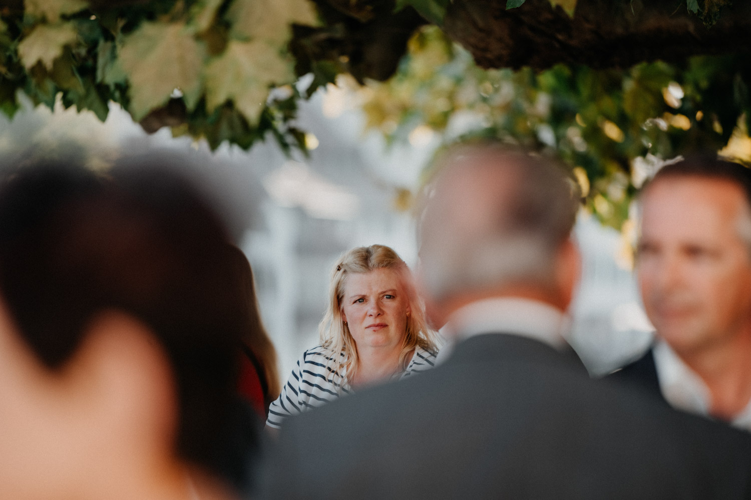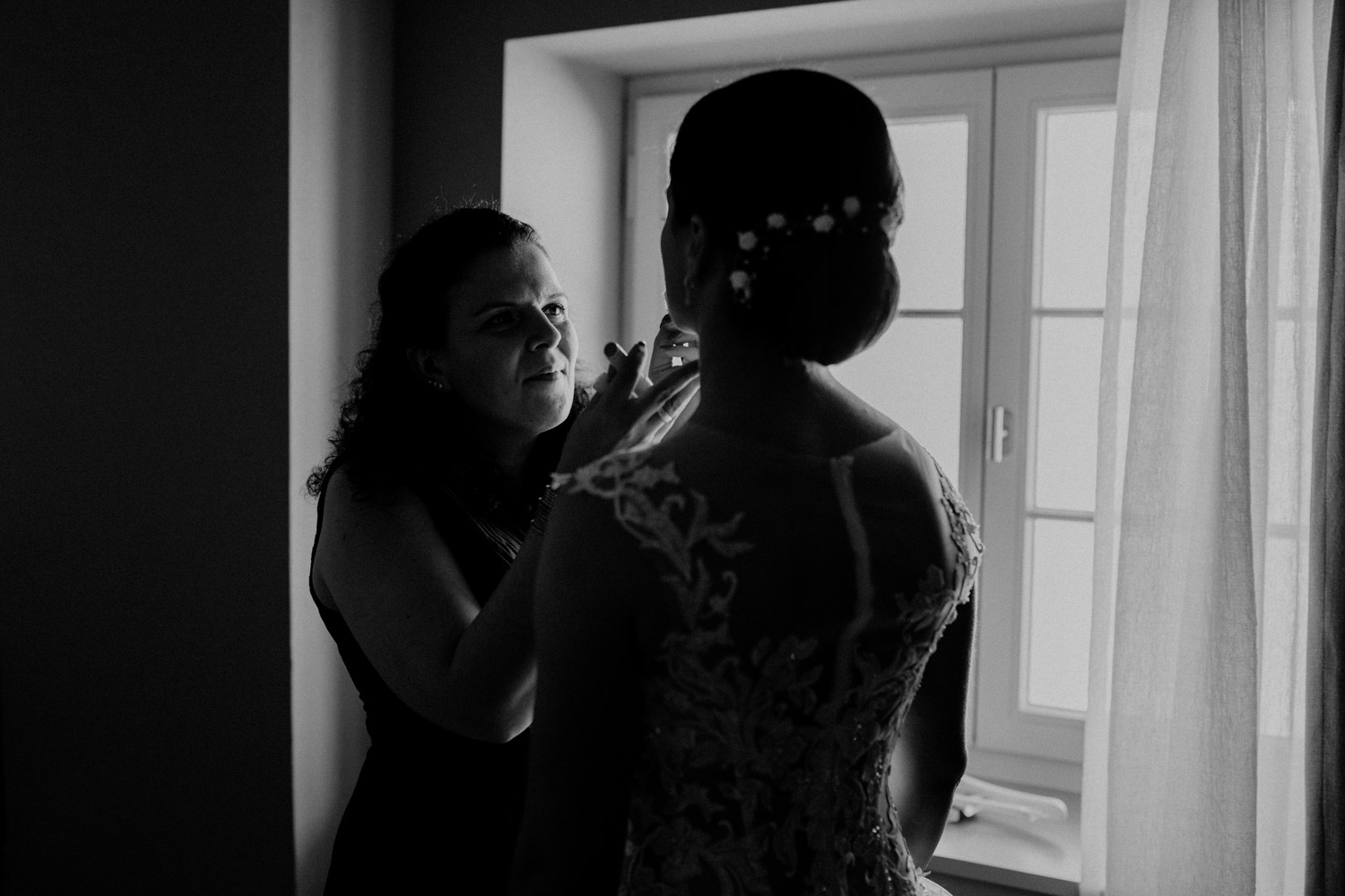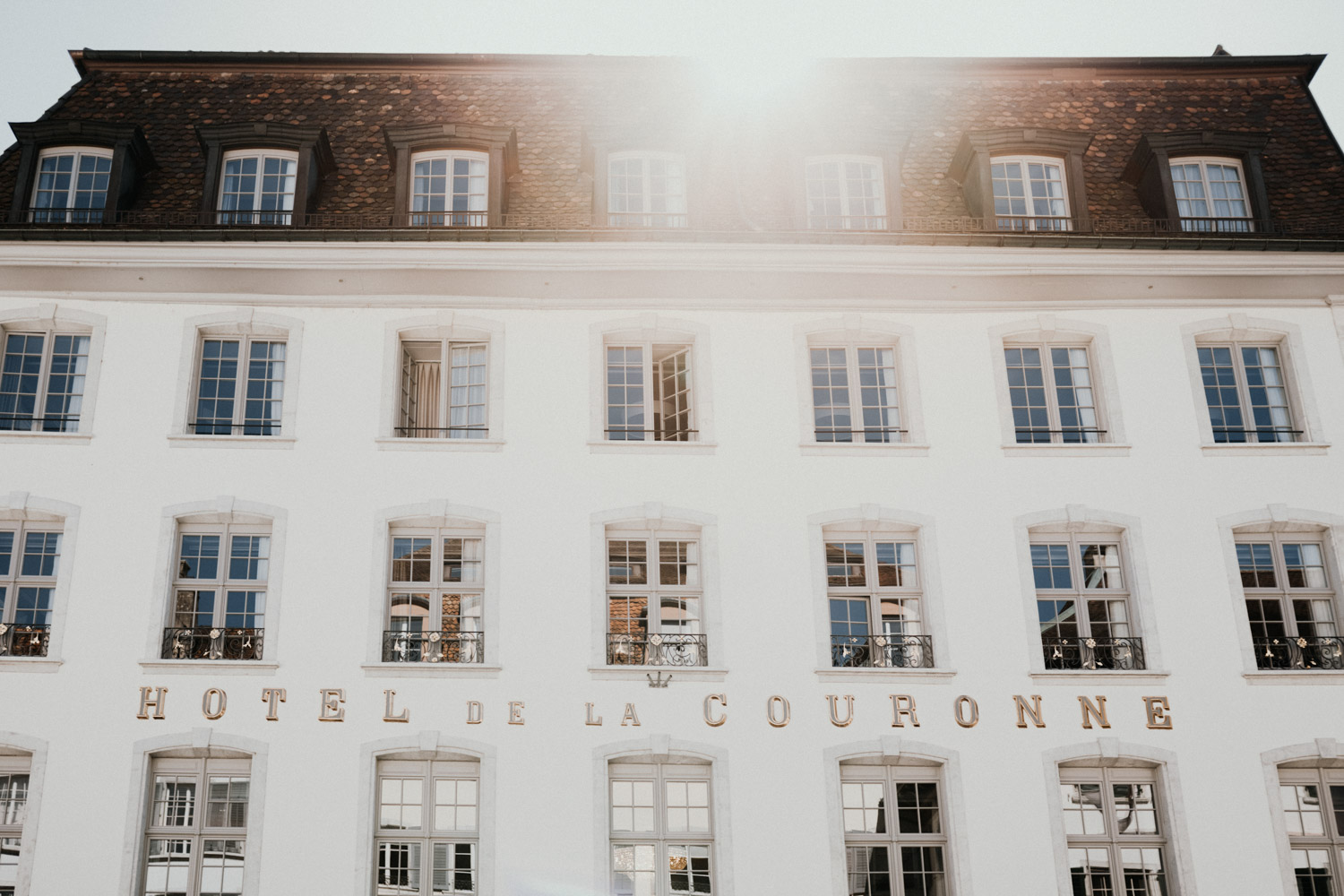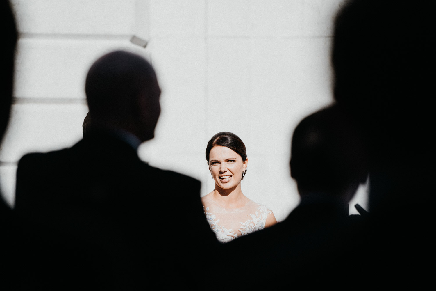 Ever since I saw this beautiful church for the first time, I’ve dreamed about being booked as a wedding photographer in the St. Ursus Cathedral in Solothurn, Switzerland. Even though Chrissi and Silvan didn’t get married in the St.Ursus Cathedral itself, we still had the chance to take some portraits in there. The whole day started by getting ready in the beautiful La Couronne hotel in the old town of Solothurn. While organizing the last few things over the phone, Chrissi was made up by her sister and got dressed in her absolutely stunning wedding dress. Since their location for the ceremony was only a few hundred meters away, Chrissi, her sister and her father all walked together from the hotel to the location of the wedding ceremony. I absolutely loved it! Such a beautiful and meaningful thing to do, and an awesome opportunity for me to take pictures in an unposed and documentary style. The old town of Solothurn was crowded with people because there was an autumn festival that day, and I heard so many people whisper about how beautiful Chrissi looked! After a short but very funny and heart-warming ceremony (held by the sister and a good friend of the two), Chrissi and Silvan had their reception in a small park right next to the river. Then, finally, we left to take the portraits and strolled through the old town towards the St. Ursus Cathedral. There are so many spots to take good couple portraits in such a gorgeous place! Old buildings, coloured walls, small alleys… and of course the cathedral! The lighting was breath-taking in there!