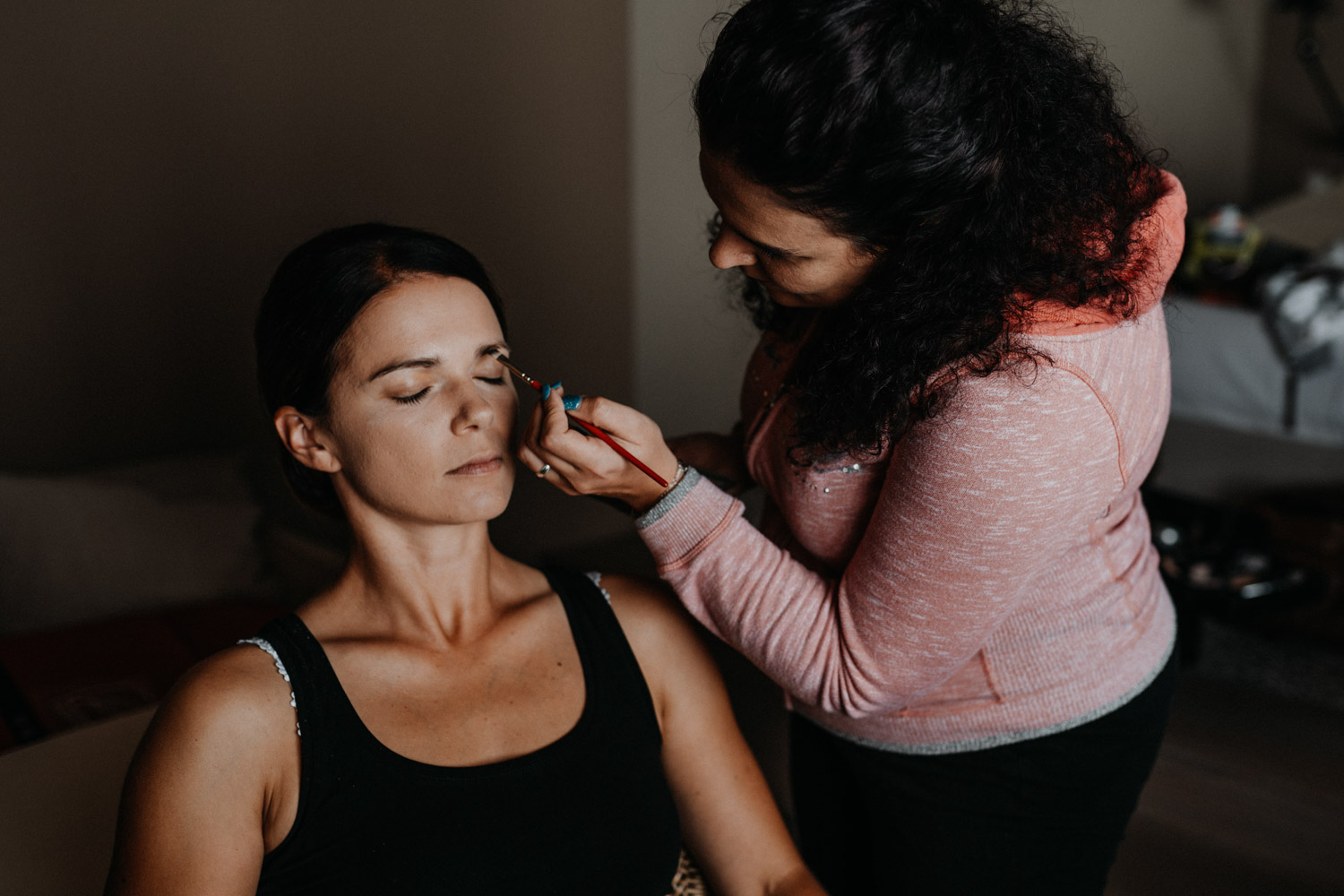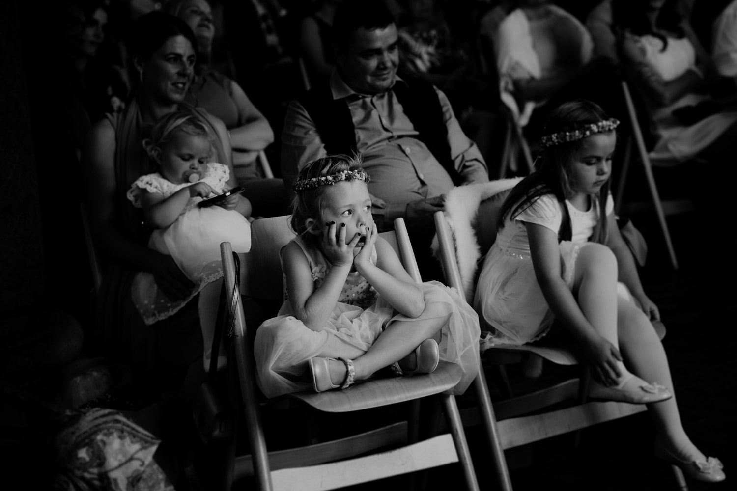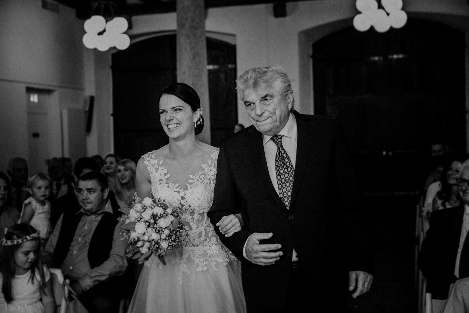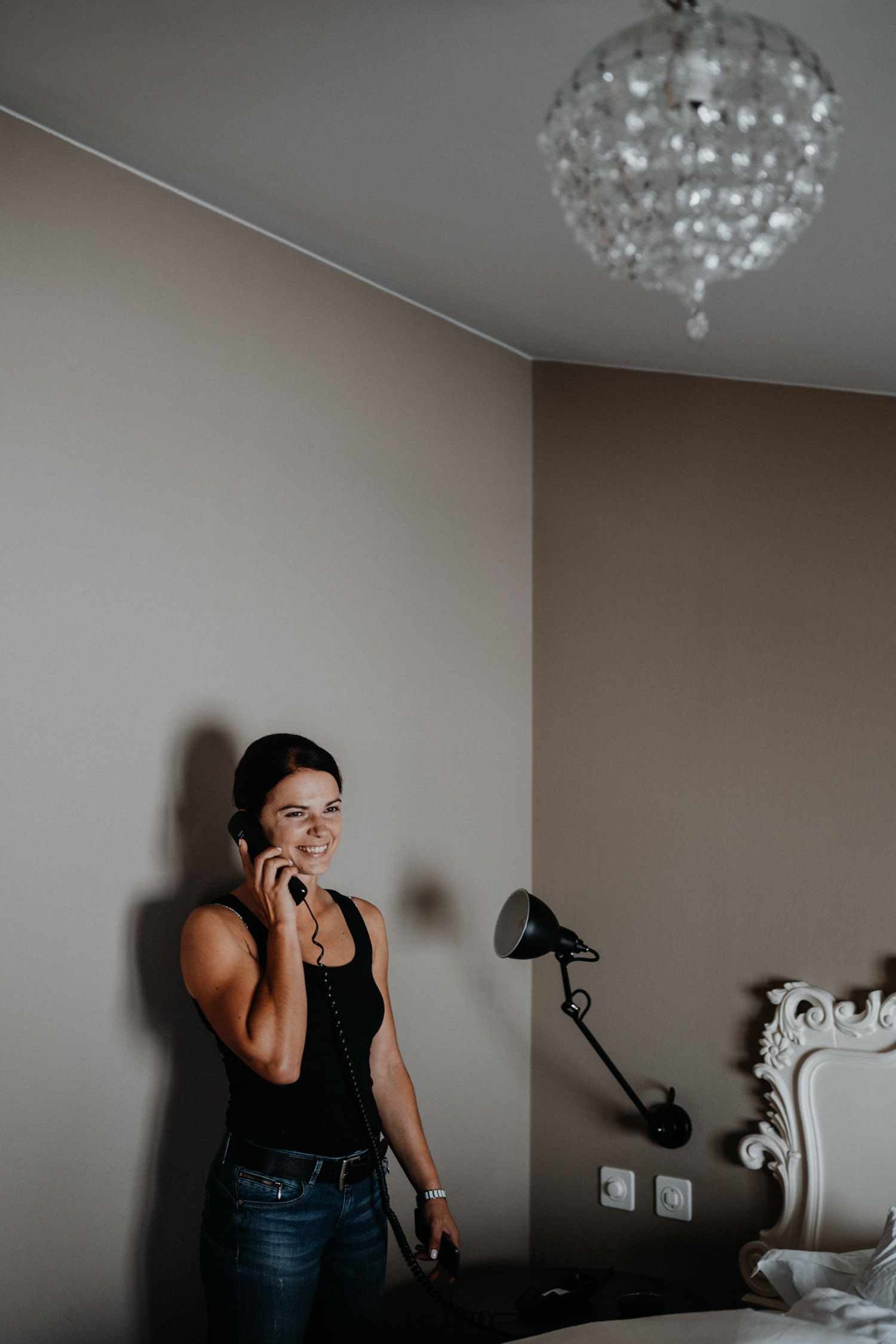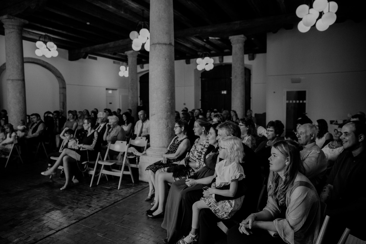 Ever since I saw this beautiful church for the first time, I’ve dreamed about being booked as a wedding photographer in the St. Ursus Cathedral in Solothurn, Switzerland. Even though Chrissi and Silvan didn’t get married in the St.Ursus Cathedral itself, we still had the chance to take some portraits in there. The whole day started by getting ready in the beautiful La Couronne hotel in the old town of Solothurn. While organizing the last few things over the phone, Chrissi was made up by her sister and got dressed in her absolutely stunning wedding dress. Since their location for the ceremony was only a few hundred meters away, Chrissi, her sister and her father all walked together from the hotel to the location of the wedding ceremony. I absolutely loved it! Such a beautiful and meaningful thing to do, and an awesome opportunity for me to take pictures in an unposed and documentary style. The old town of Solothurn was crowded with people because there was an autumn festival that day, and I heard so many people whisper about how beautiful Chrissi looked! After a short but very funny and heart-warming ceremony (held by the sister and a good friend of the two), Chrissi and Silvan had their reception in a small park right next to the river. Then, finally, we left to take the portraits and strolled through the old town towards the St. Ursus Cathedral. There are so many spots to take good couple portraits in such a gorgeous place! Old buildings, coloured walls, small alleys… and of course the cathedral! The lighting was breath-taking in there!