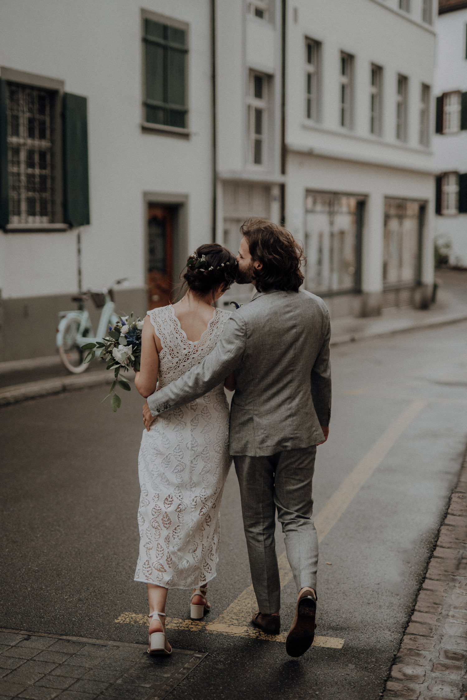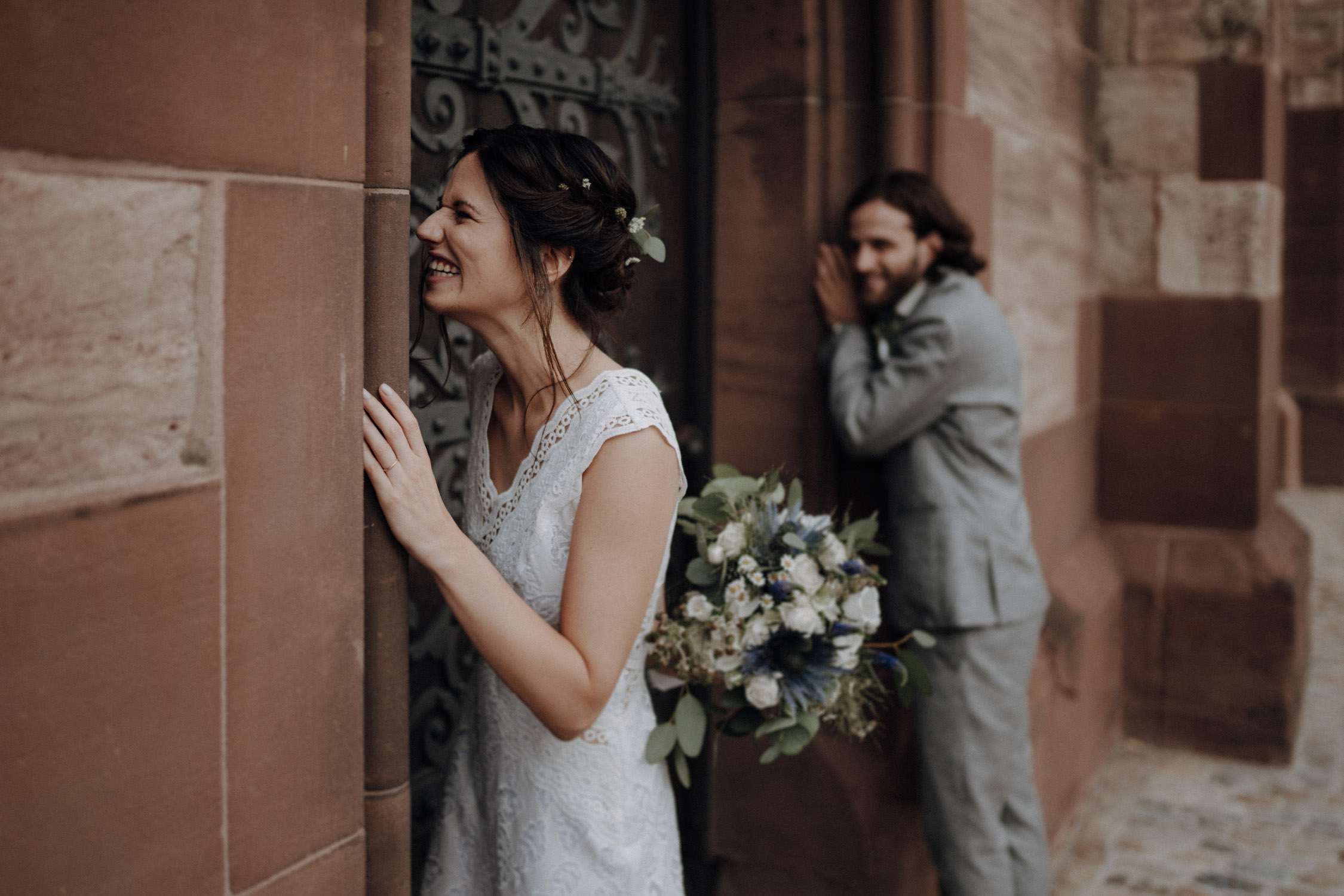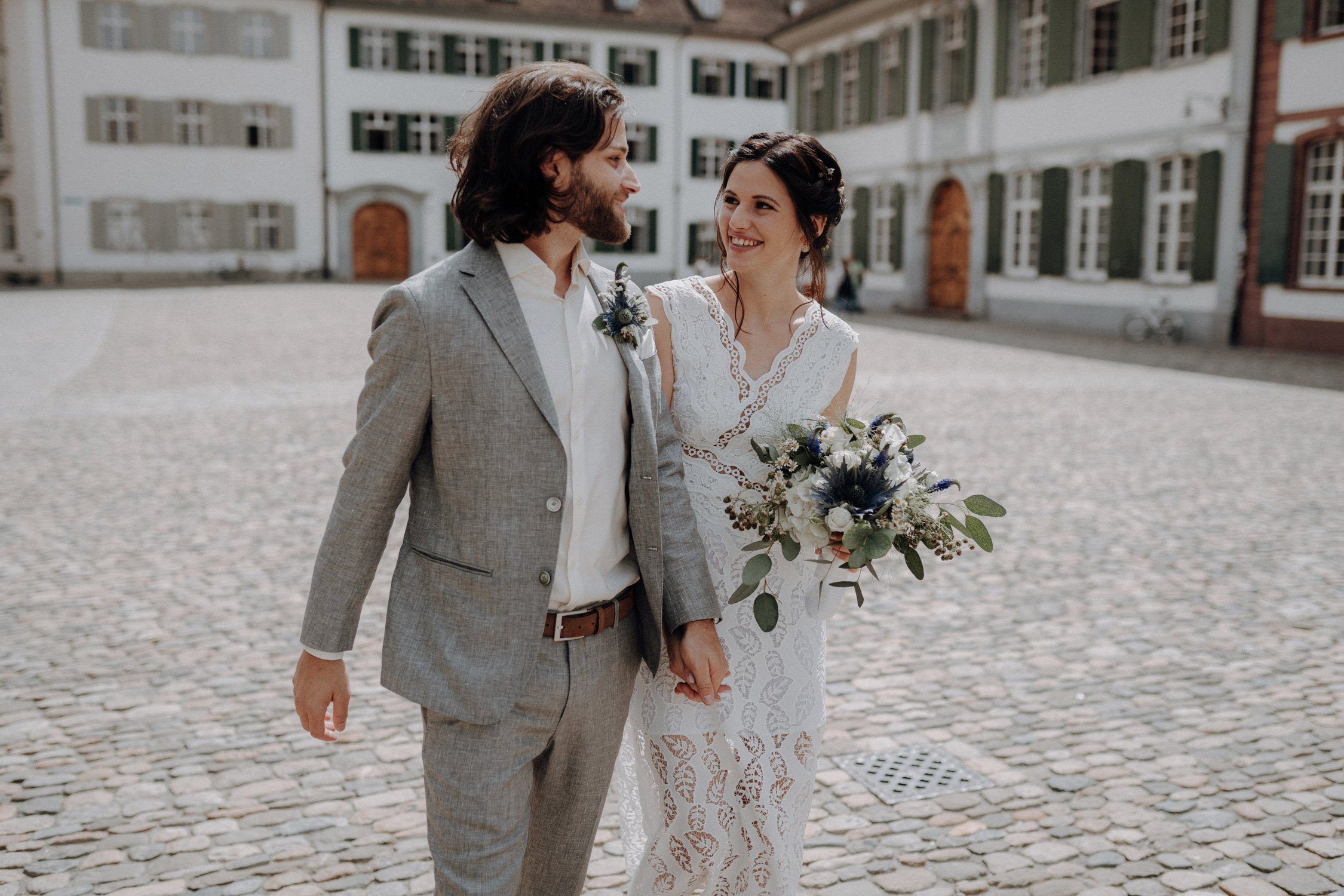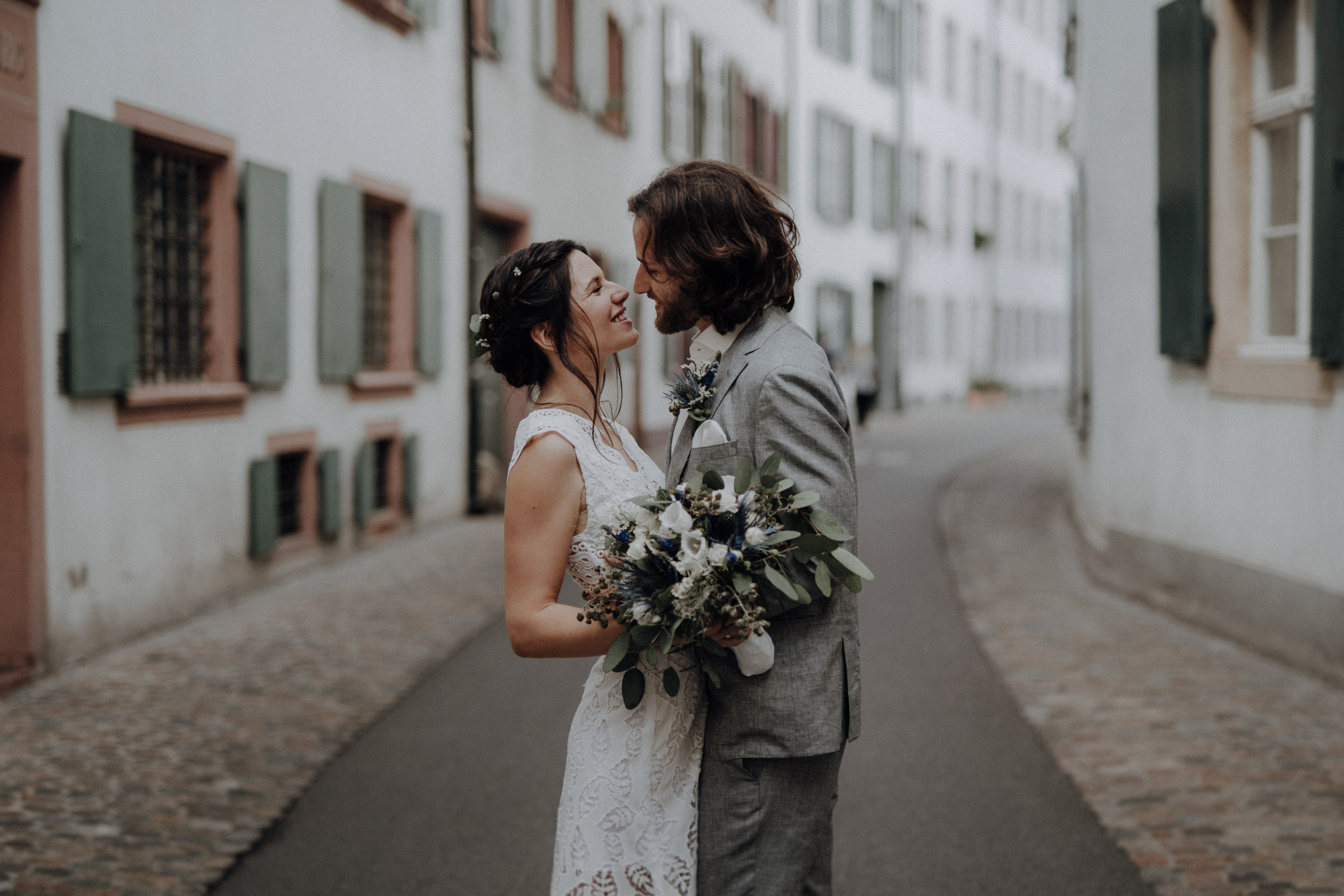 When I read Nina’s first e-mail, I already knew that this wedding would be so much fun. Originally, there was supposed to be a small official wedding, followed by a big wedding party later, but due to the current Coronavirus situation, the big wedding had to be postponed to next year. Luckily, the civil wedding could still be held! I had already been in the Basel registry office a few years before for a wedding and in my opinion, it’s one of the most beautiful offices out there! Its location in the historic centre of Basel is simply perfect and we took advantage of that for a few snaps of the couple before the wedding. After the short but incredibly beautiful wedding, the couple’s families organised a small wine reception and everyone could toast the couple together. Everyone was visibly happy and full of love – that always makes my job as a wedding photographer so much easier. Taking pictures of happy people is just fun!