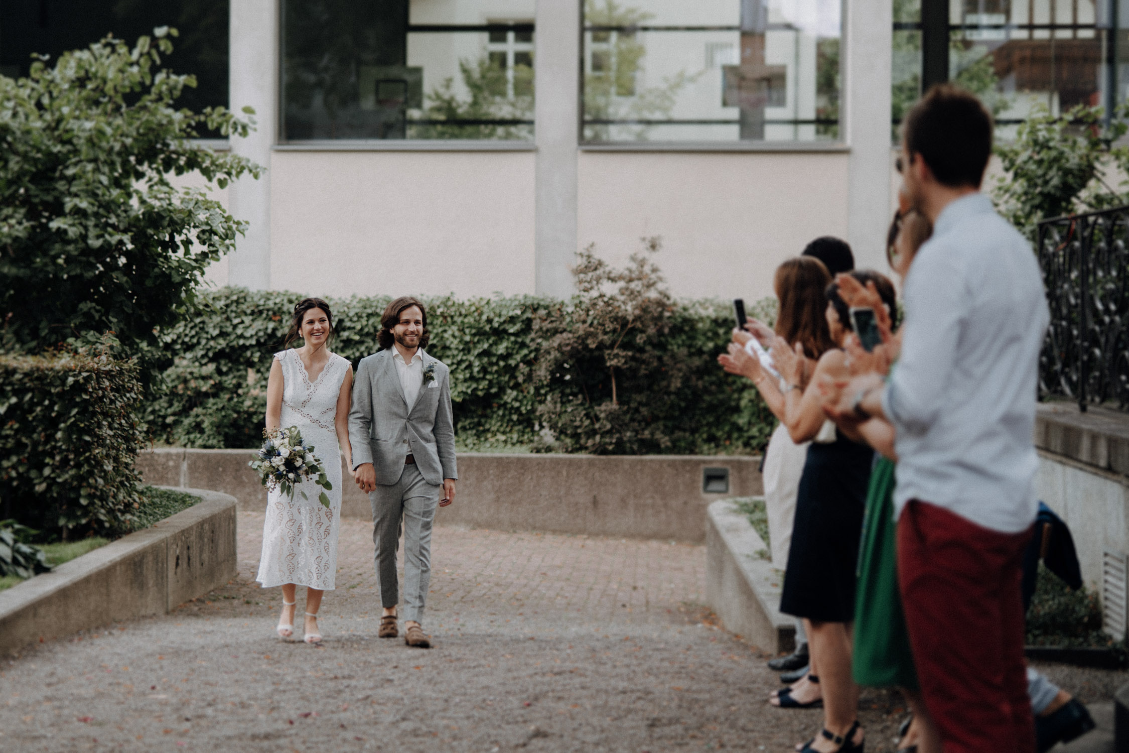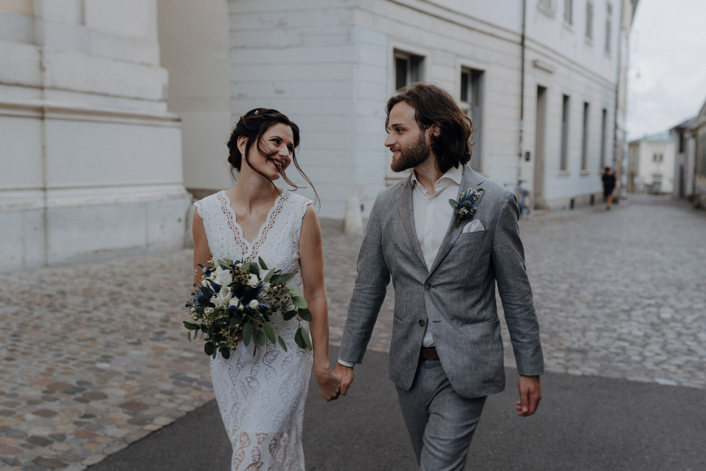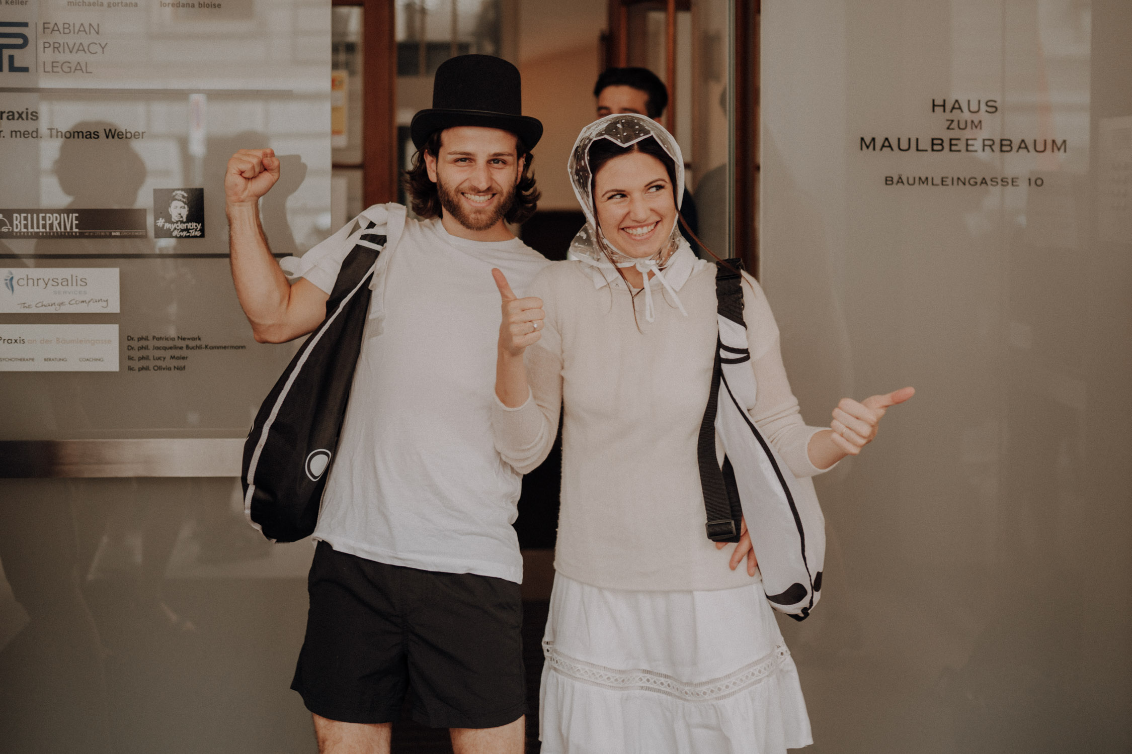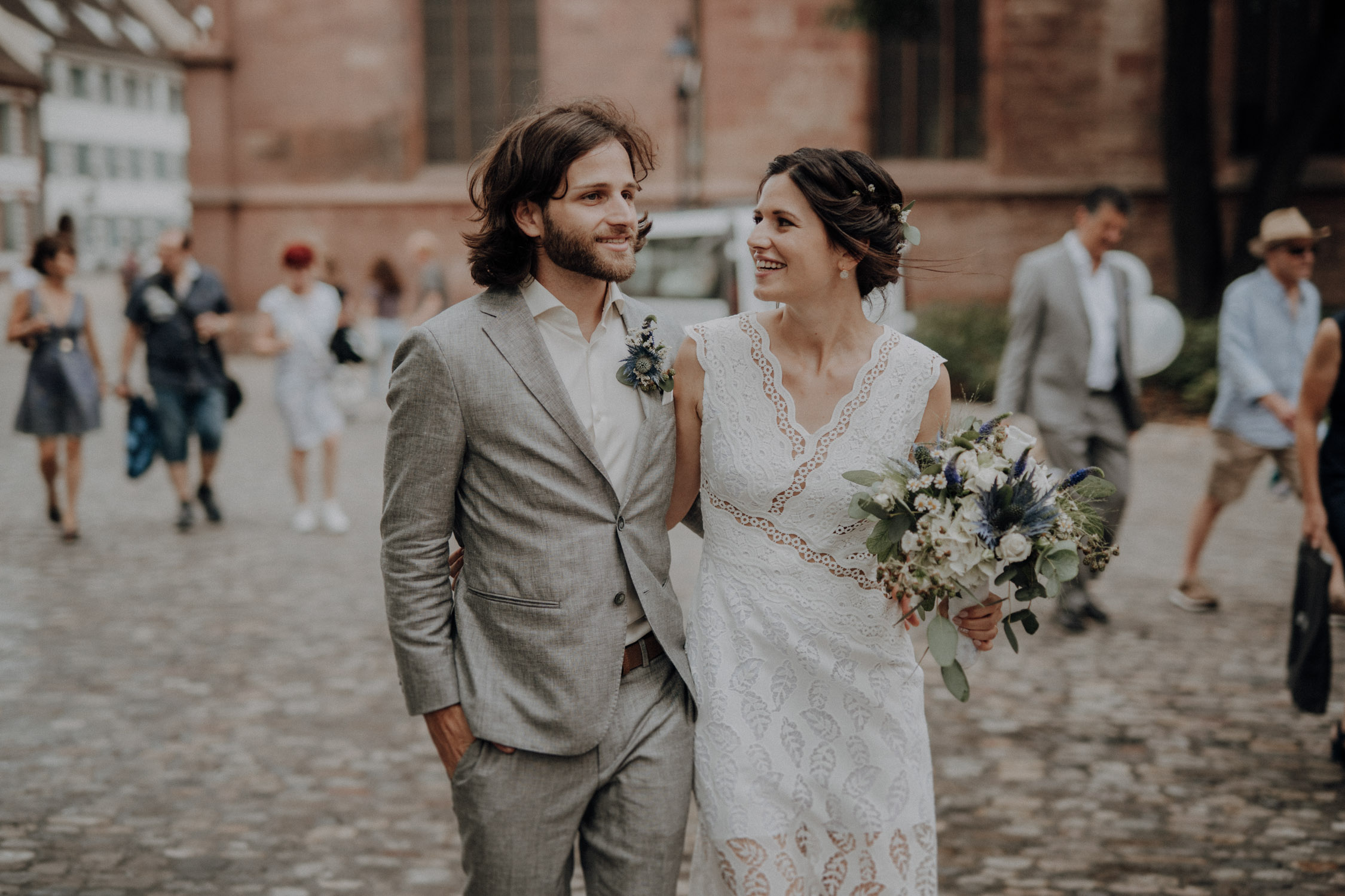 When I read Nina’s first e-mail, I already knew that this wedding would be so much fun. Originally, there was supposed to be a small official wedding, followed by a big wedding party later, but due to the current Coronavirus situation, the big wedding had to be postponed to next year. Luckily, the civil wedding could still be held! I had already been in the Basel registry office a few years before for a wedding and in my opinion, it’s one of the most beautiful offices out there! Its location in the historic centre of Basel is simply perfect and we took advantage of that for a few snaps of the couple before the wedding. After the short but incredibly beautiful wedding, the couple’s families organised a small wine reception and everyone could toast the couple together. Everyone was visibly happy and full of love – that always makes my job as a wedding photographer so much easier. Taking pictures of happy people is just fun!