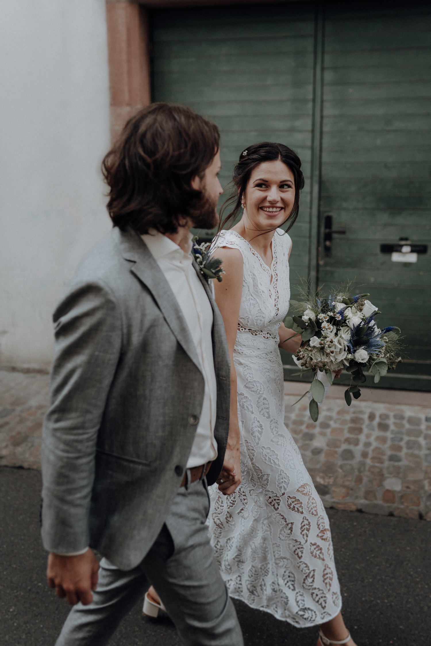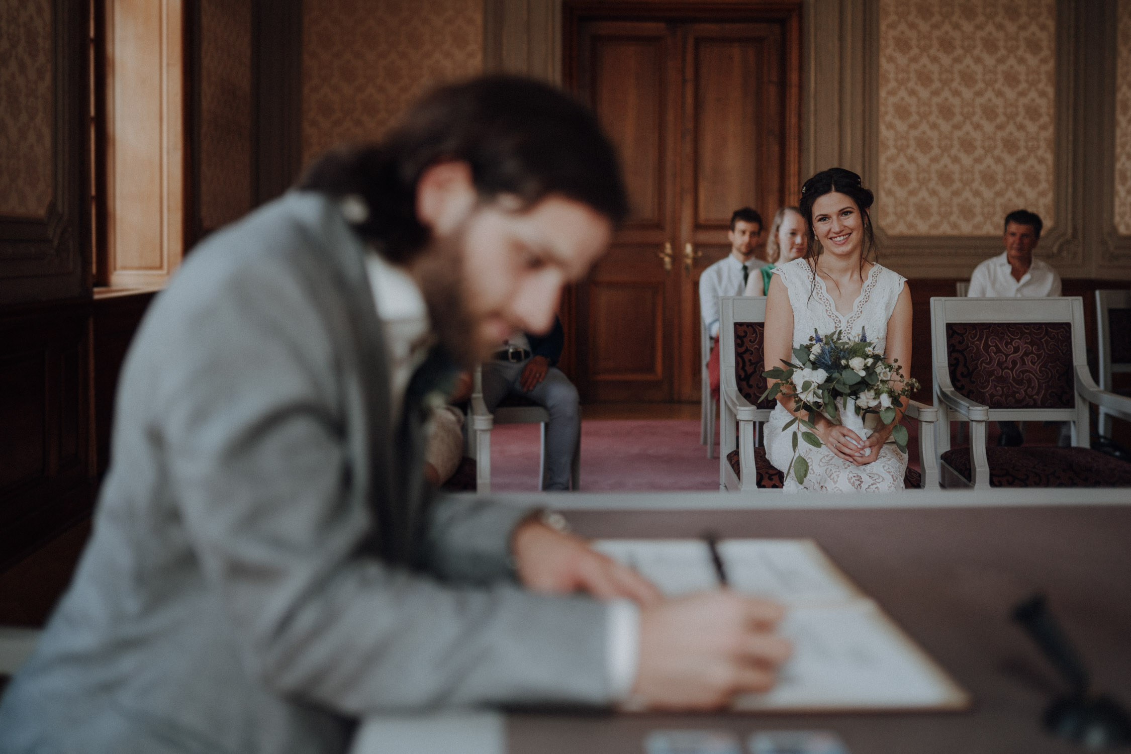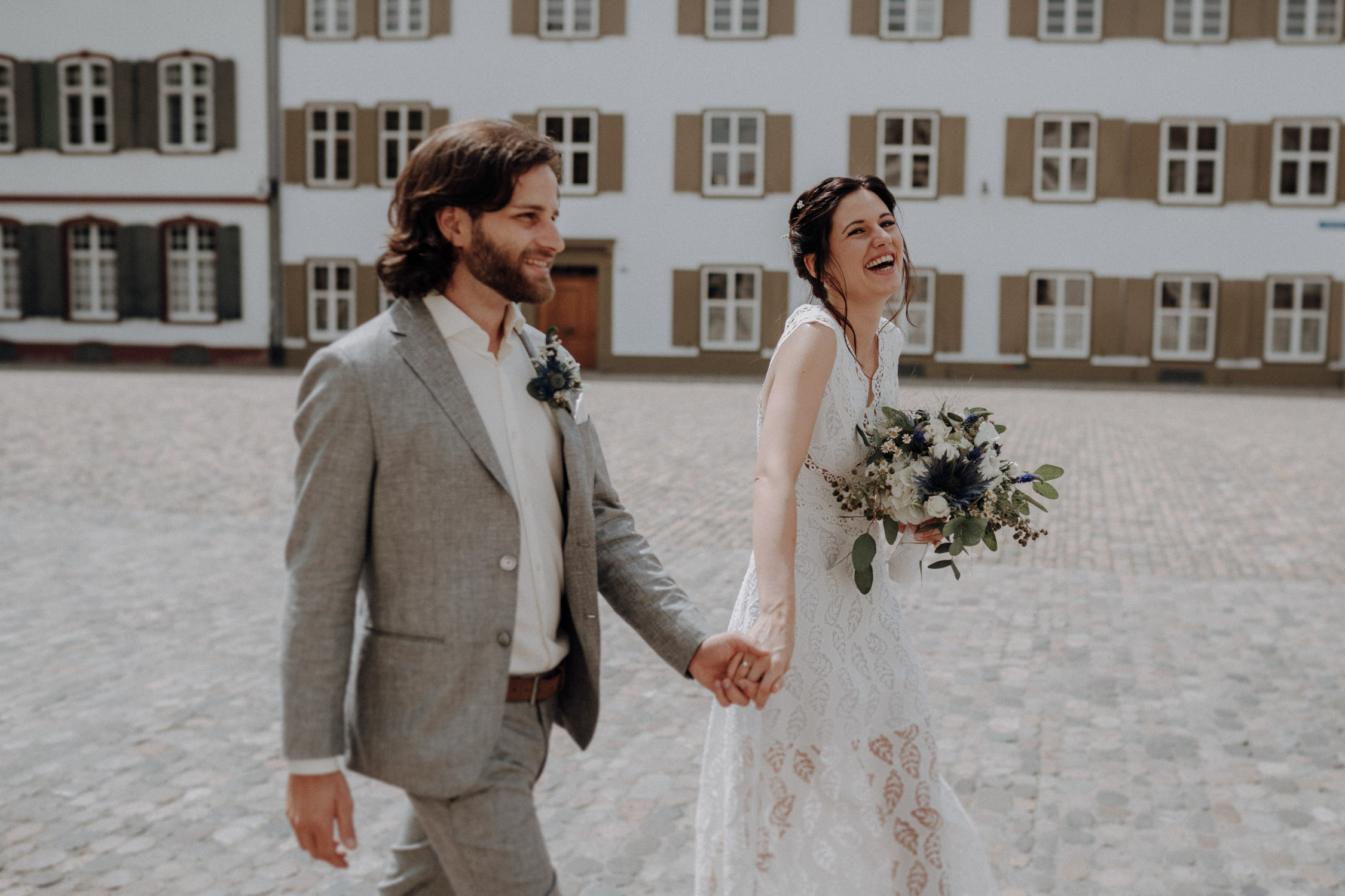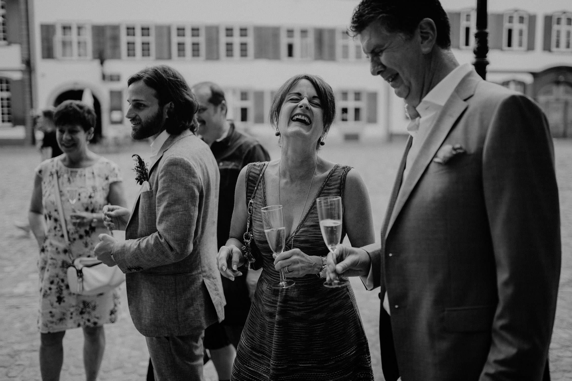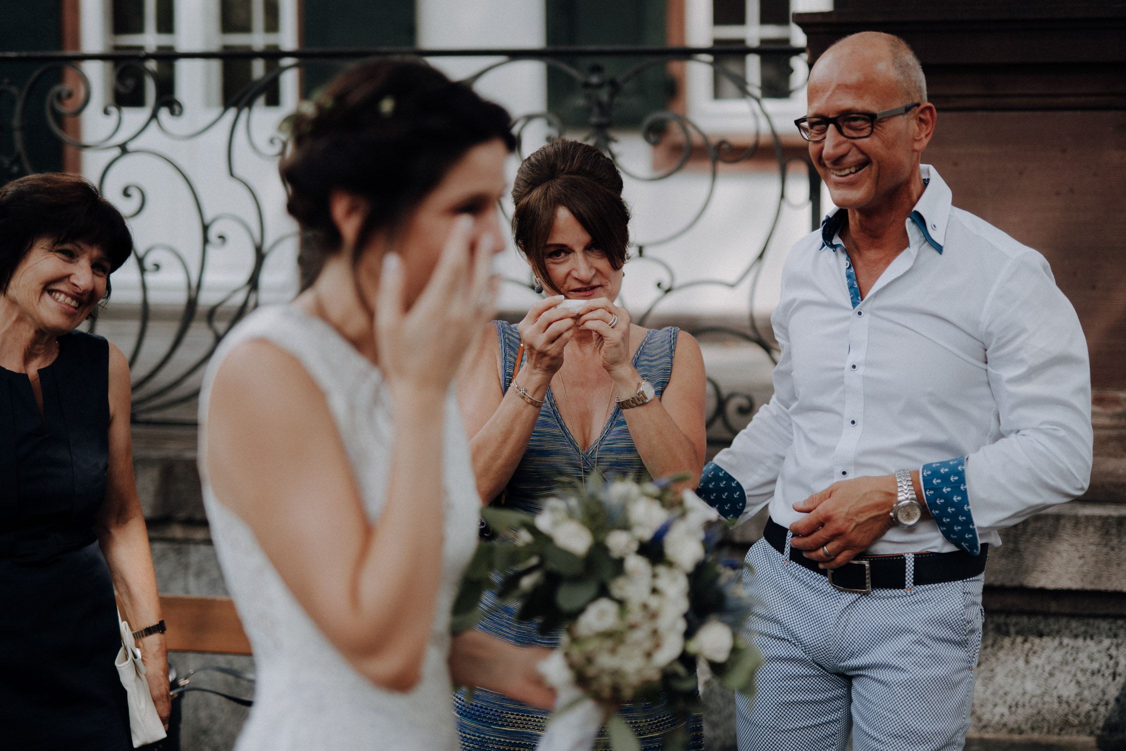 When I read Nina’s first e-mail, I already knew that this wedding would be so much fun. Originally, there was supposed to be a small official wedding, followed by a big wedding party later, but due to the current Coronavirus situation, the big wedding had to be postponed to next year. Luckily, the civil wedding could still be held! I had already been in the Basel registry office a few years before for a wedding and in my opinion, it’s one of the most beautiful offices out there! Its location in the historic centre of Basel is simply perfect and we took advantage of that for a few snaps of the couple before the wedding. After the short but incredibly beautiful wedding, the couple’s families organised a small wine reception and everyone could toast the couple together. Everyone was visibly happy and full of love – that always makes my job as a wedding photographer so much easier. Taking pictures of happy people is just fun!