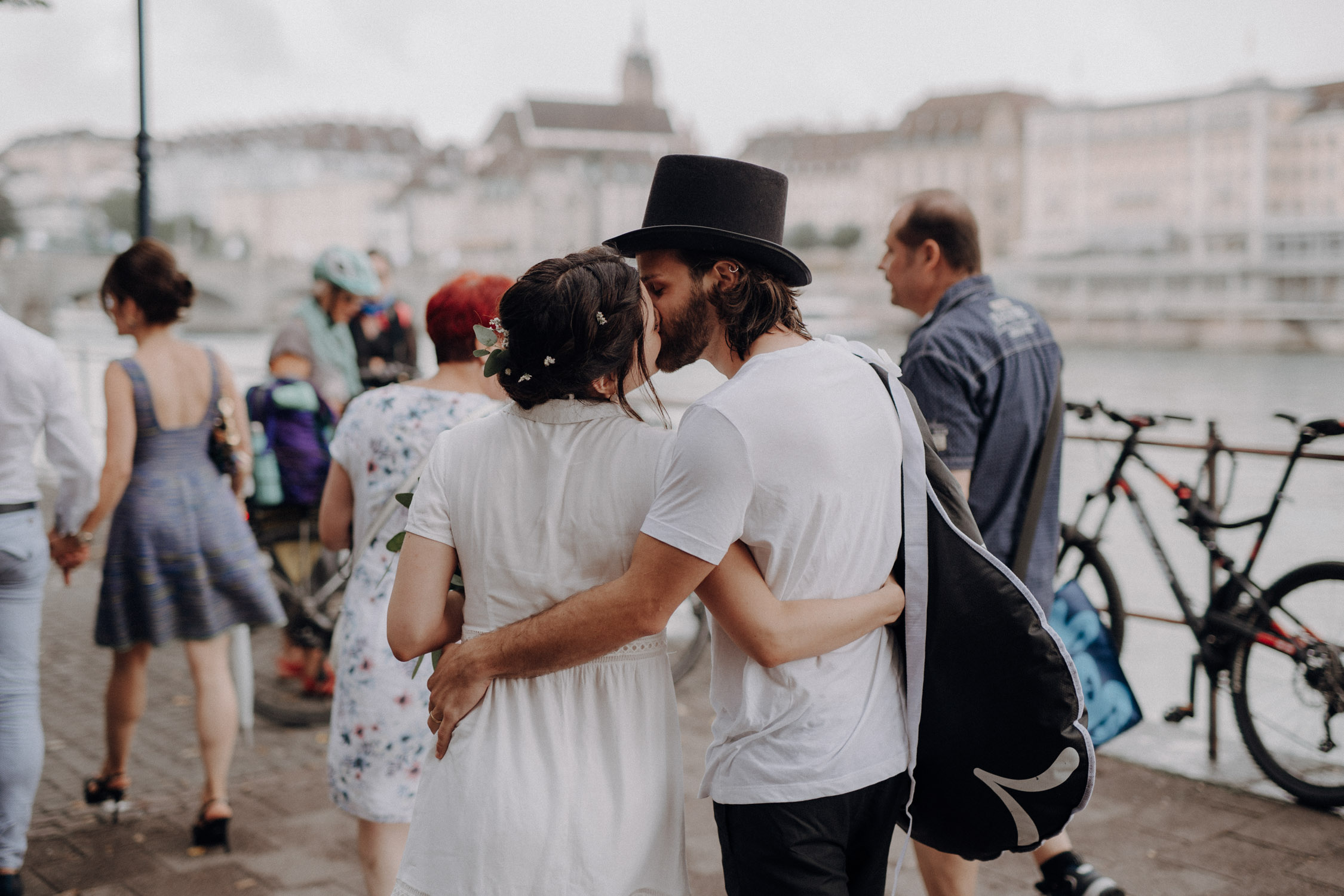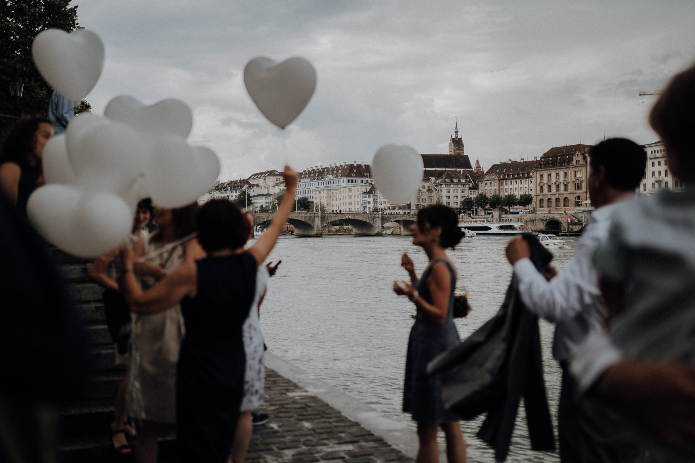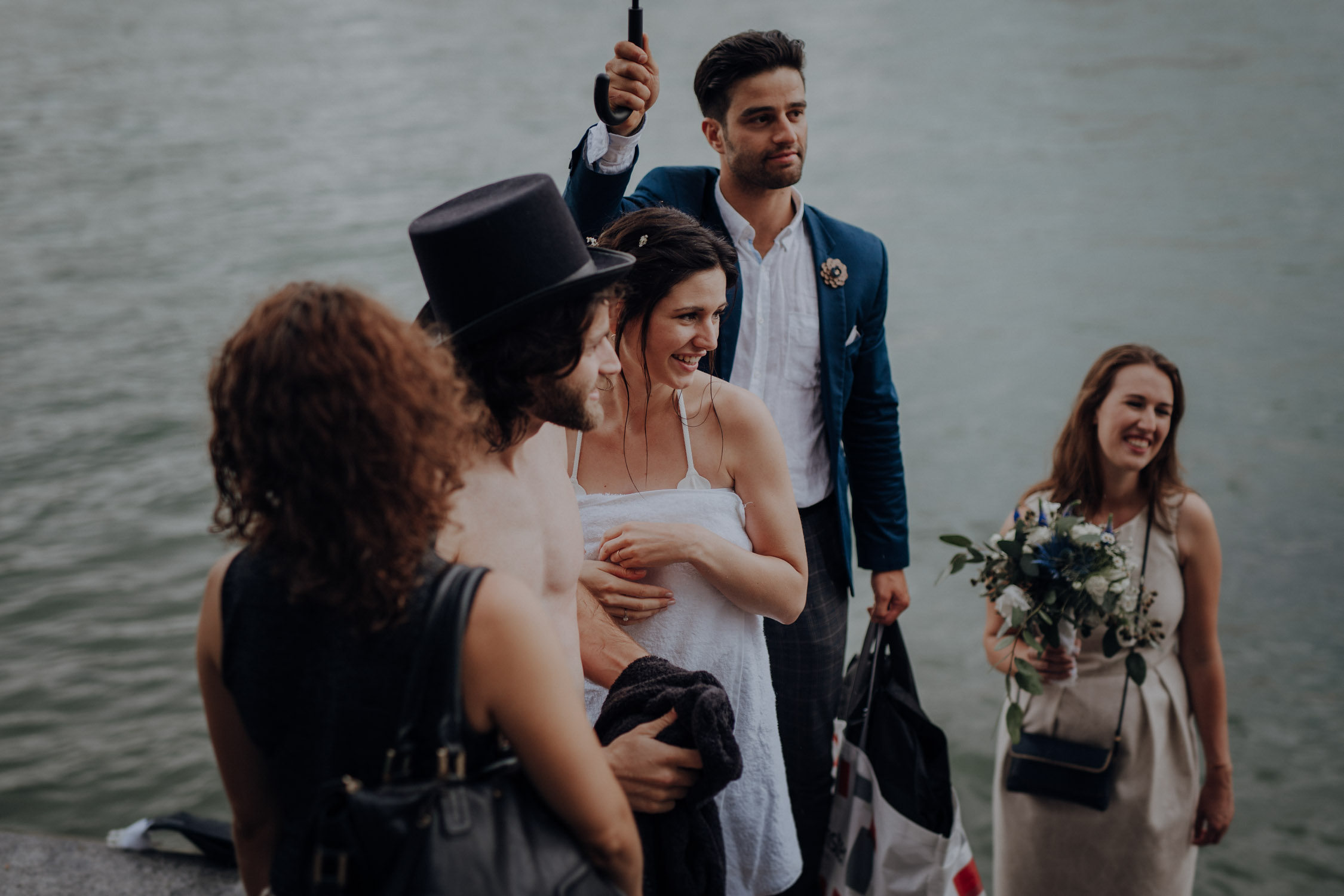 After the reception, it was time for my personal highlight. Nina and Yannick live in Basel, and in the summer they, like many others, like to go swimming in the Rhine. They didn’t want to miss this ritual on their wedding day. Just before, it started to rain, but that wasn’t going to ruin the mood. While the two of them let themselves drift on the Rhine, the rest of the wedding guests made their way through town to the spot where the couple would get out of the water and be welcomed. The pictures of the two of them with the city in the background… I loved it. Thank you, Nina & Yannick, – I’m already looking forward to part 2 next year!