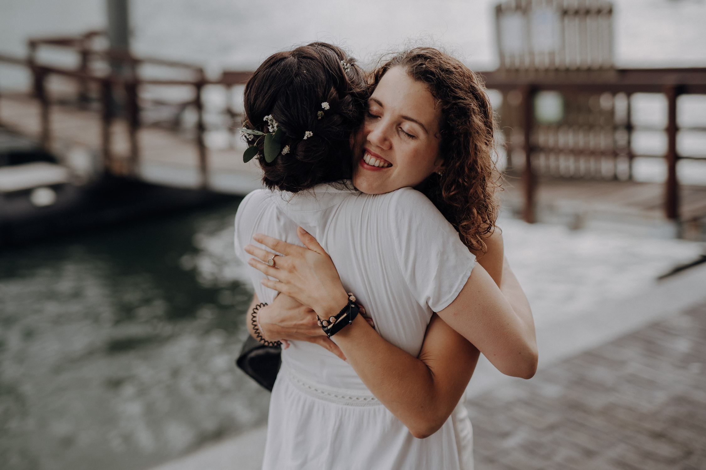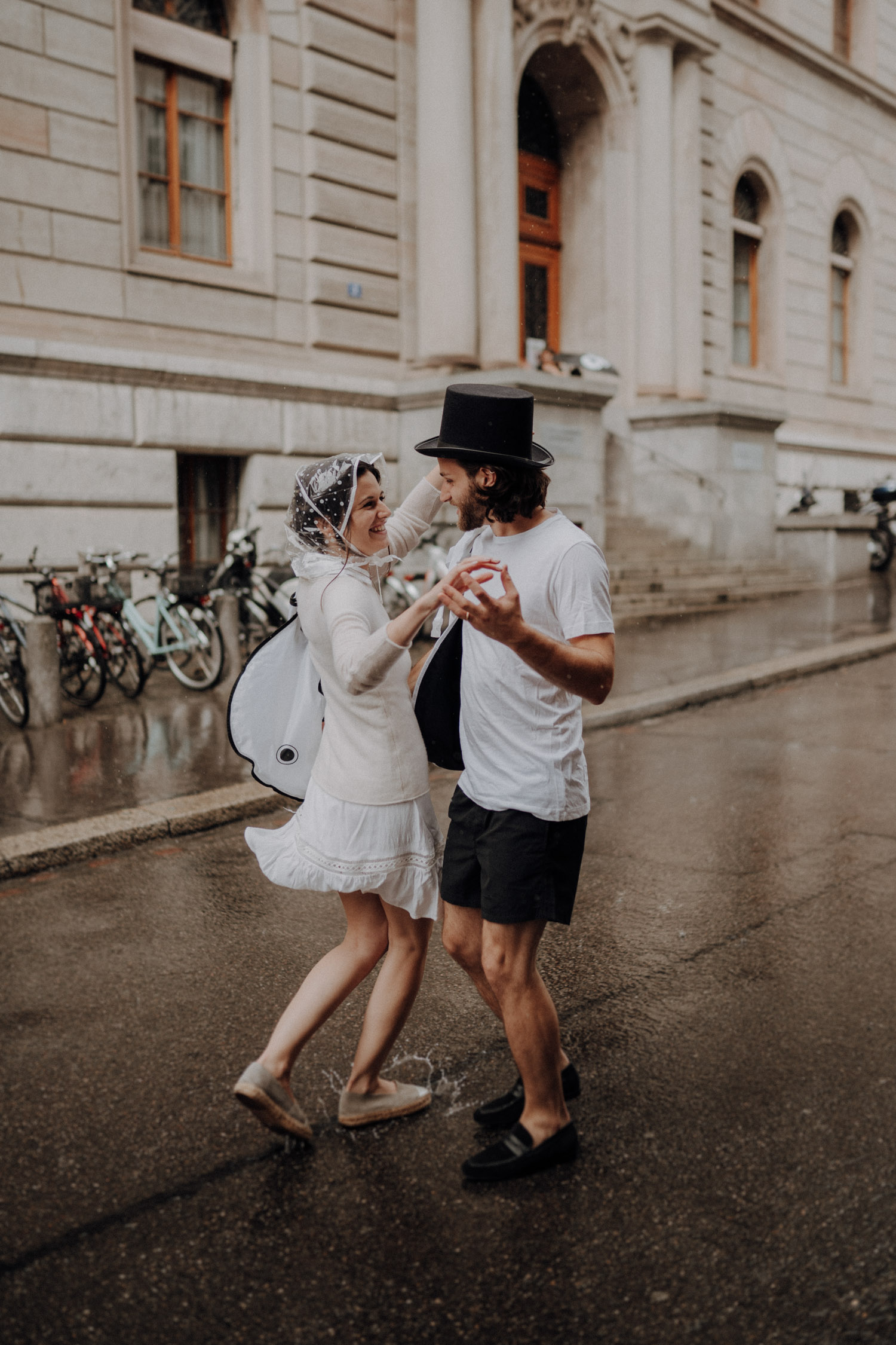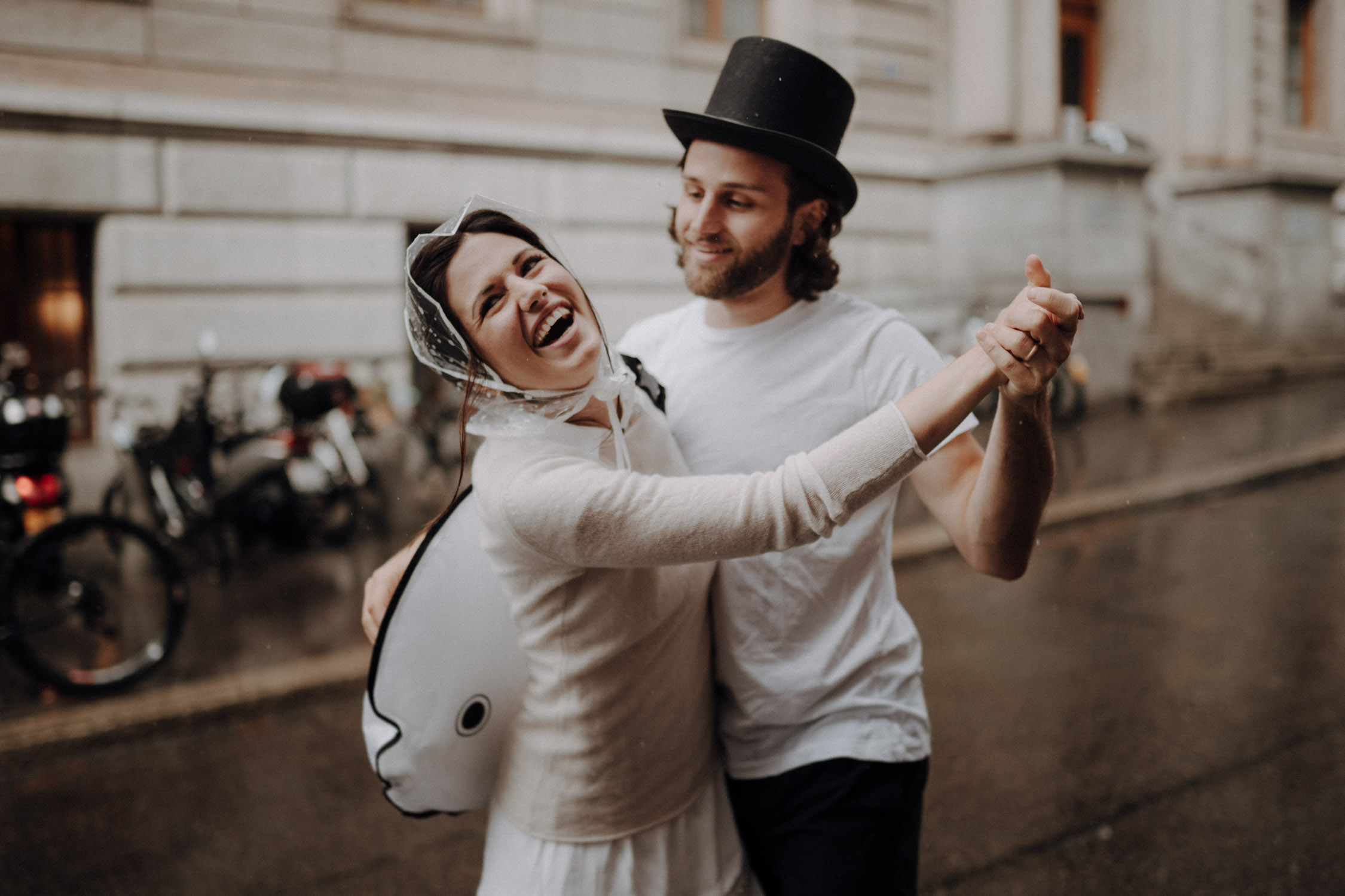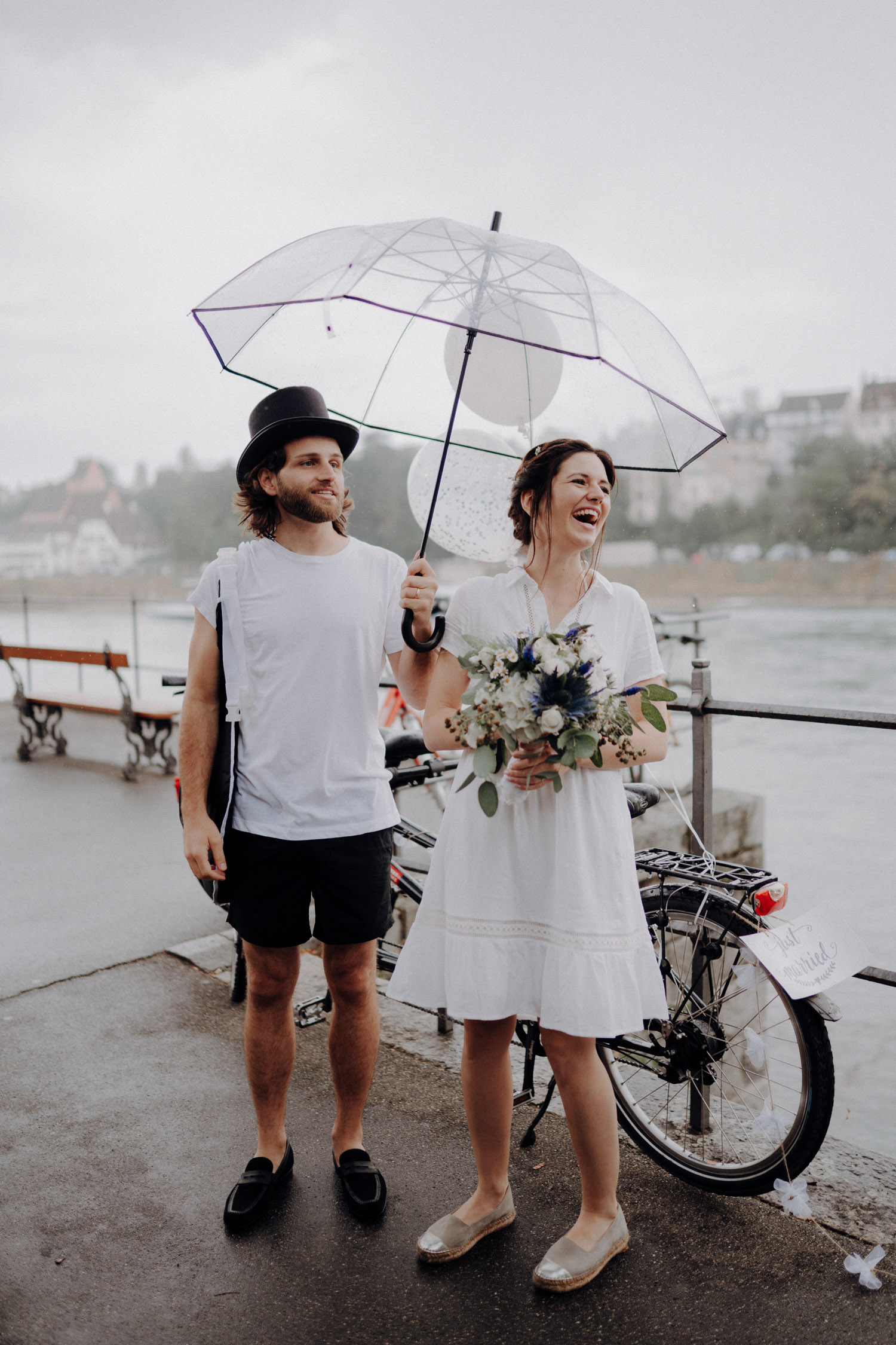 After the reception, it was time for my personal highlight. Nina and Yannick live in Basel, and in the summer they, like many others, like to go swimming in the Rhine. They didn’t want to miss this ritual on their wedding day. Just before, it started to rain, but that wasn’t going to ruin the mood. While the two of them let themselves drift on the Rhine, the rest of the wedding guests made their way through town to the spot where the couple would get out of the water and be welcomed. The pictures of the two of them with the city in the background… I loved it. Thank you, Nina & Yannick, – I’m already looking forward to part 2 next year!