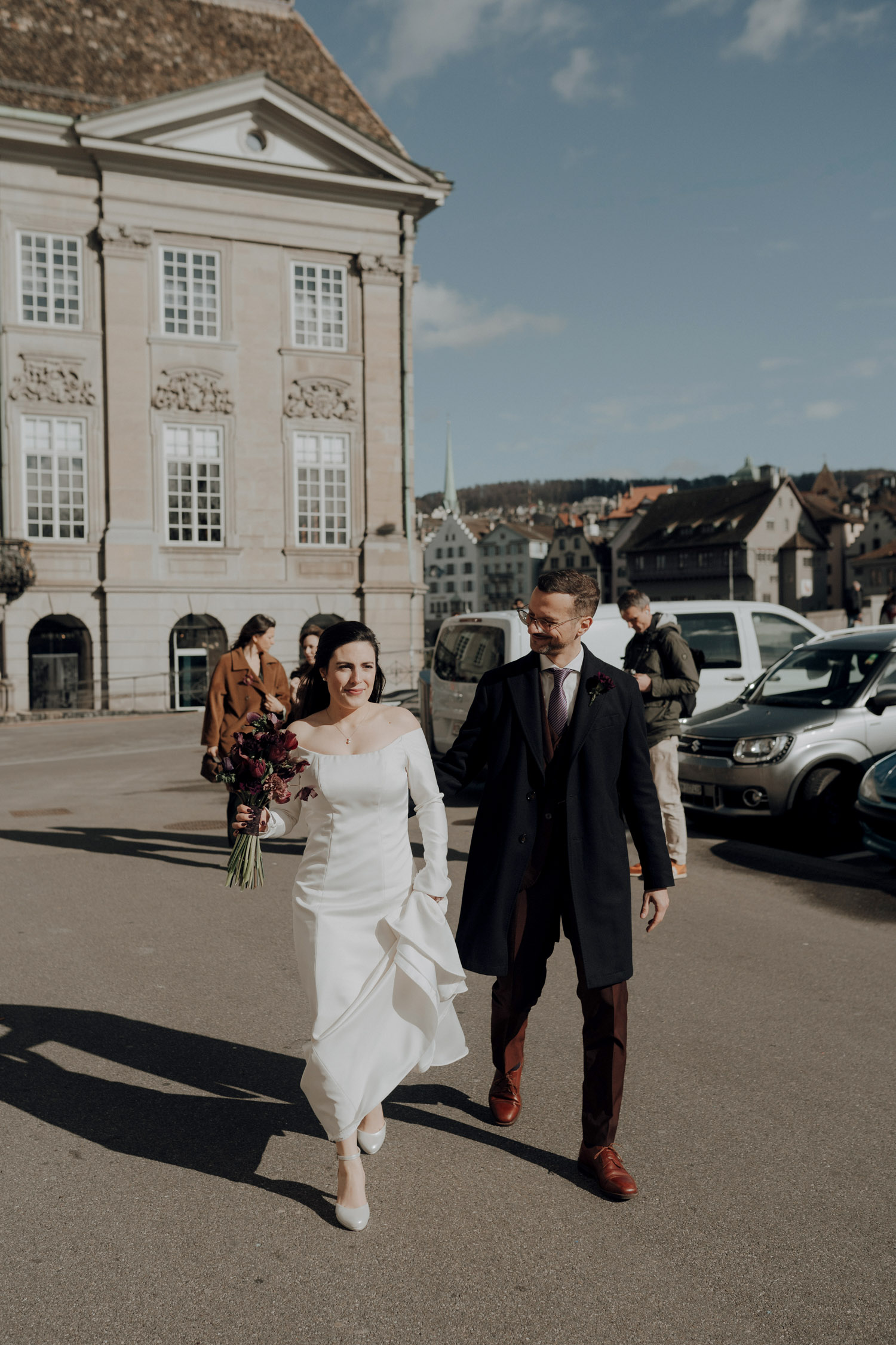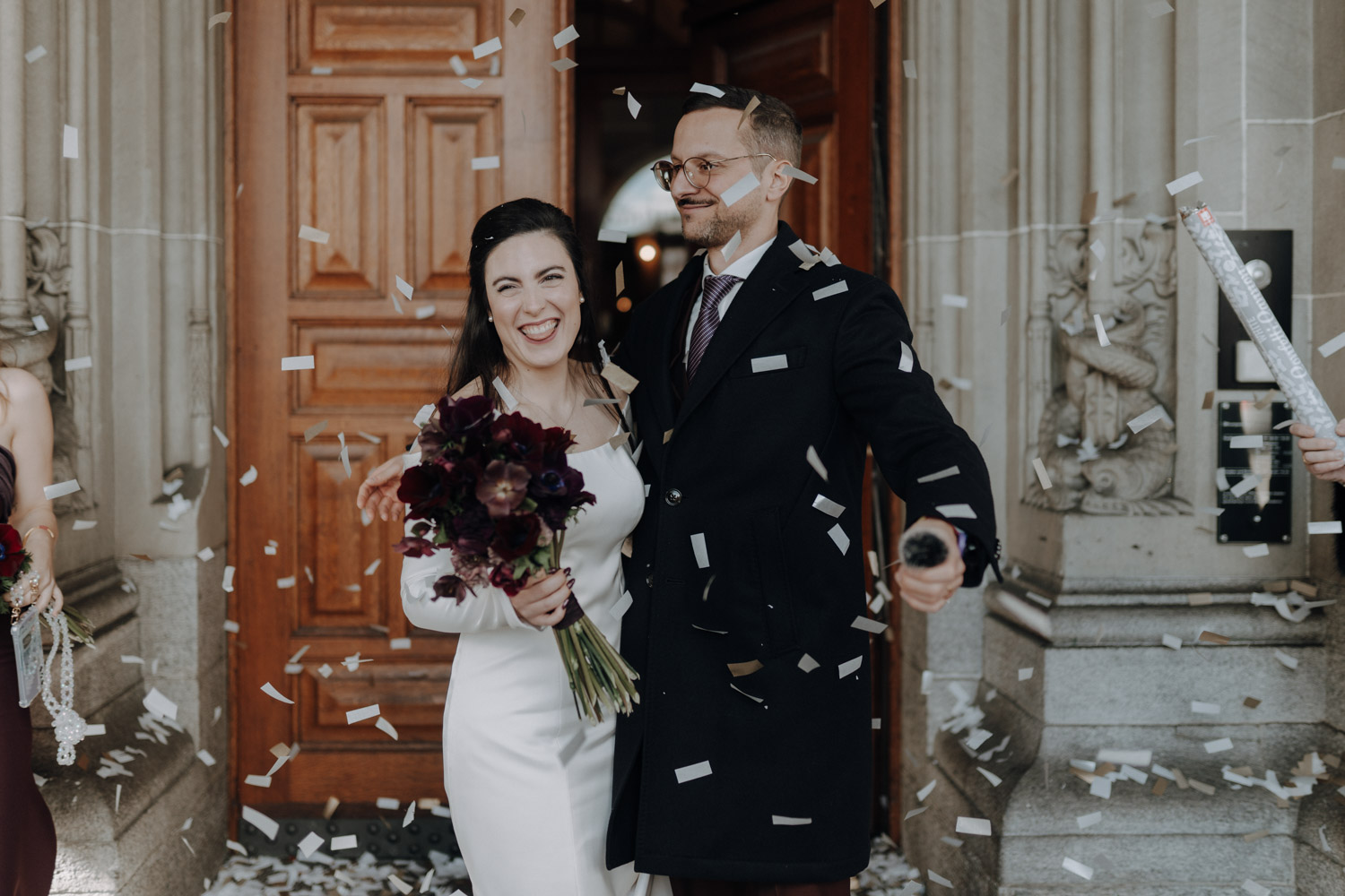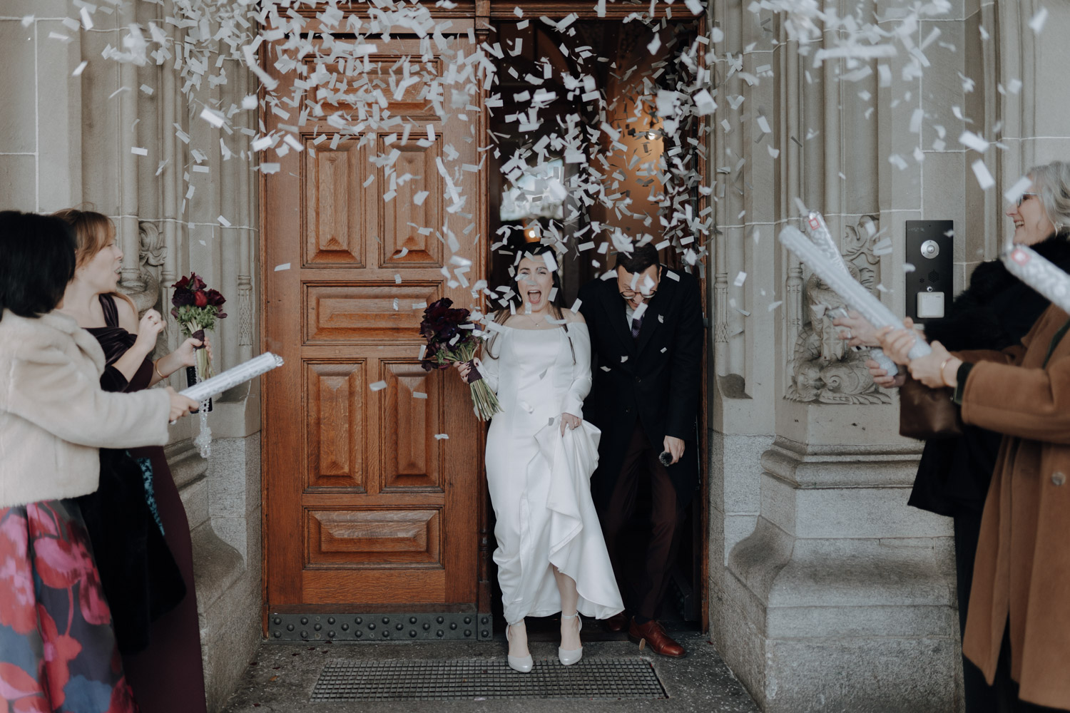 “Unser Hauptziel ist es, zu lachen, bis uns der Magen weh tut, vor Glück zu weinen, vor Freude auf und ab zu springen und das Leben und die Liebe mit unserer Familie und unseren Freunden zu feiern.” – So haben mir I & V bereits in der ersten Anfrage ihre Hochzeit beschrieben. Lange musste ich da nicht überlegen! “Farbschema: dunkles Granatapfelrot, Auberginenviolett, Artischockengrün und Gold”, ich konnte es mir plastisch vorstellen. Eine Winterhochzeit sollte es werden, mit einer Trauung im Stadthaus Zürich, einem Apéro (das ist eine wahre Untertreibung) im Hotel Storchen in Zürich und einer Fahrt in einem alten Tram durch die Stadt, der Herzensheimat des Brautpaars. Und was für ein Glück sie hatten! Den Fotos sieht man den Februar nicht an, und gespürt hat man ihn auch nicht. Es hätte durchaus auch anders kommen können, aber der Frühling schien schon etwas Einzug zu halten. Was für ein gelungener und wunderschöner Tag! Geendet hat er in einem ausgelassenen Fest im Restaurant Leafs im Engimatt City & Garden Hotel, “weil es in unserer Nachbarschaft liegt und nichts uns glücklicher machen könnte, als unsere Liebe dort zu feiern, wo alles begann.” Ich spürte den langen Tag danach noch ein paar Tage lang in den Knochen, aber das war es wert. Liebes Brautpaar – danke für euer Vertrauen!