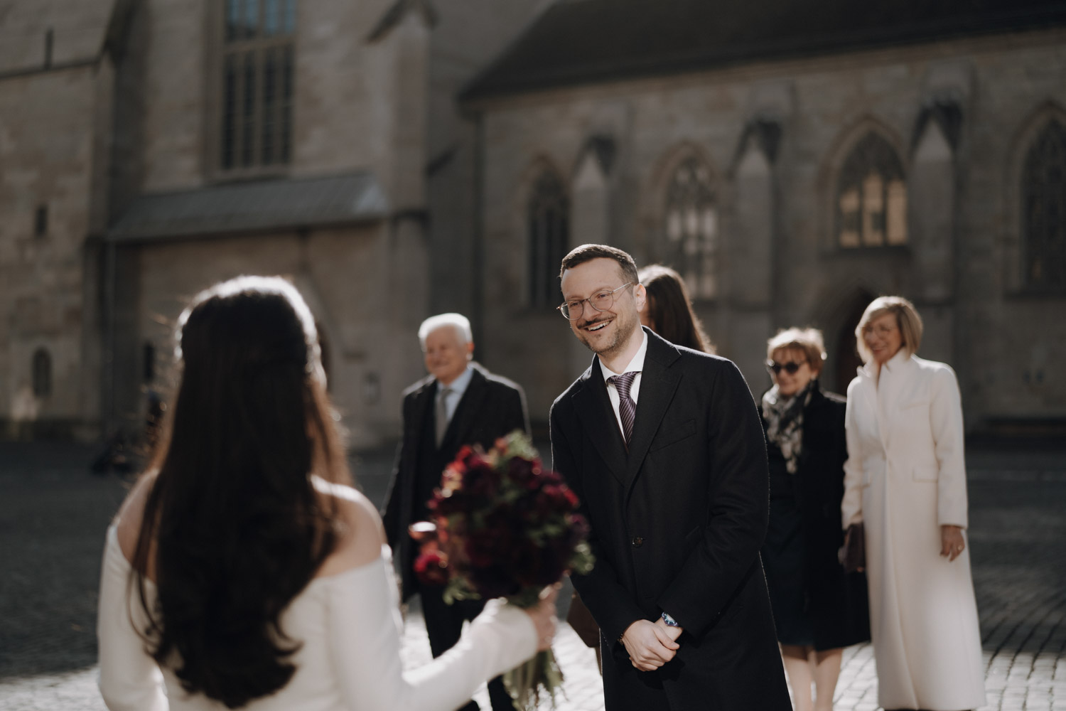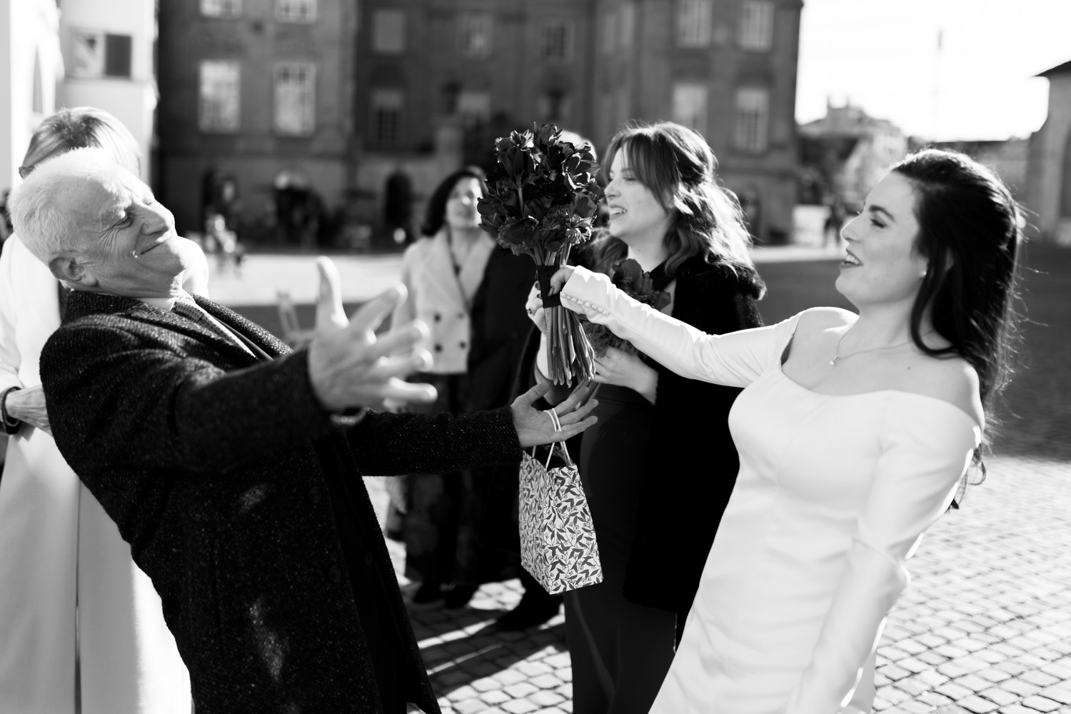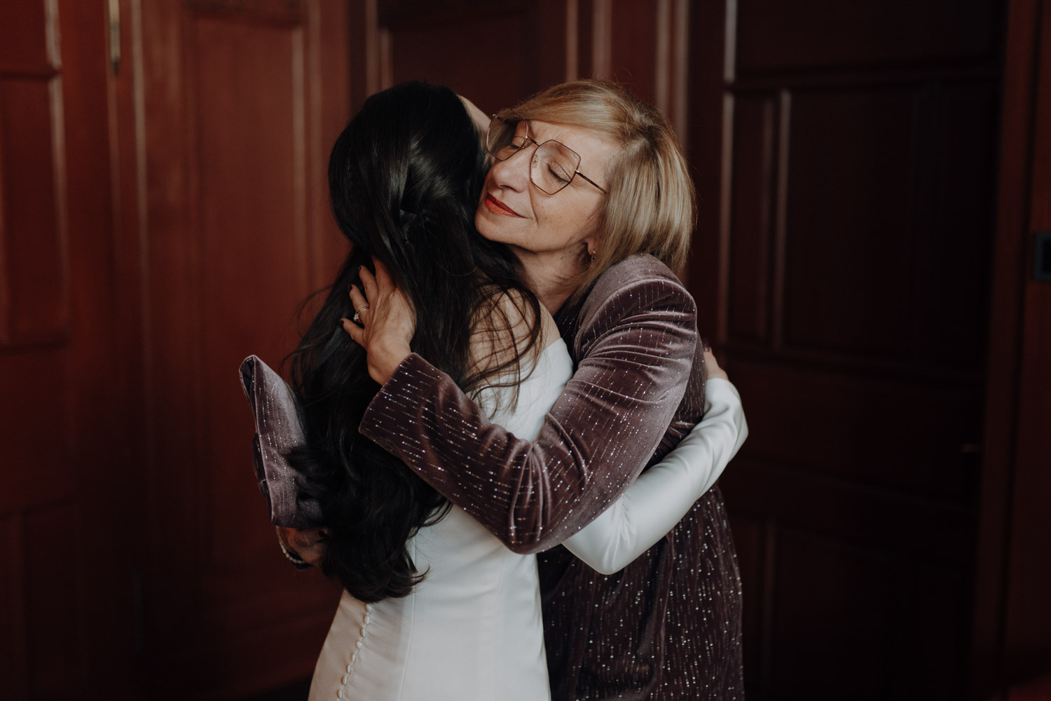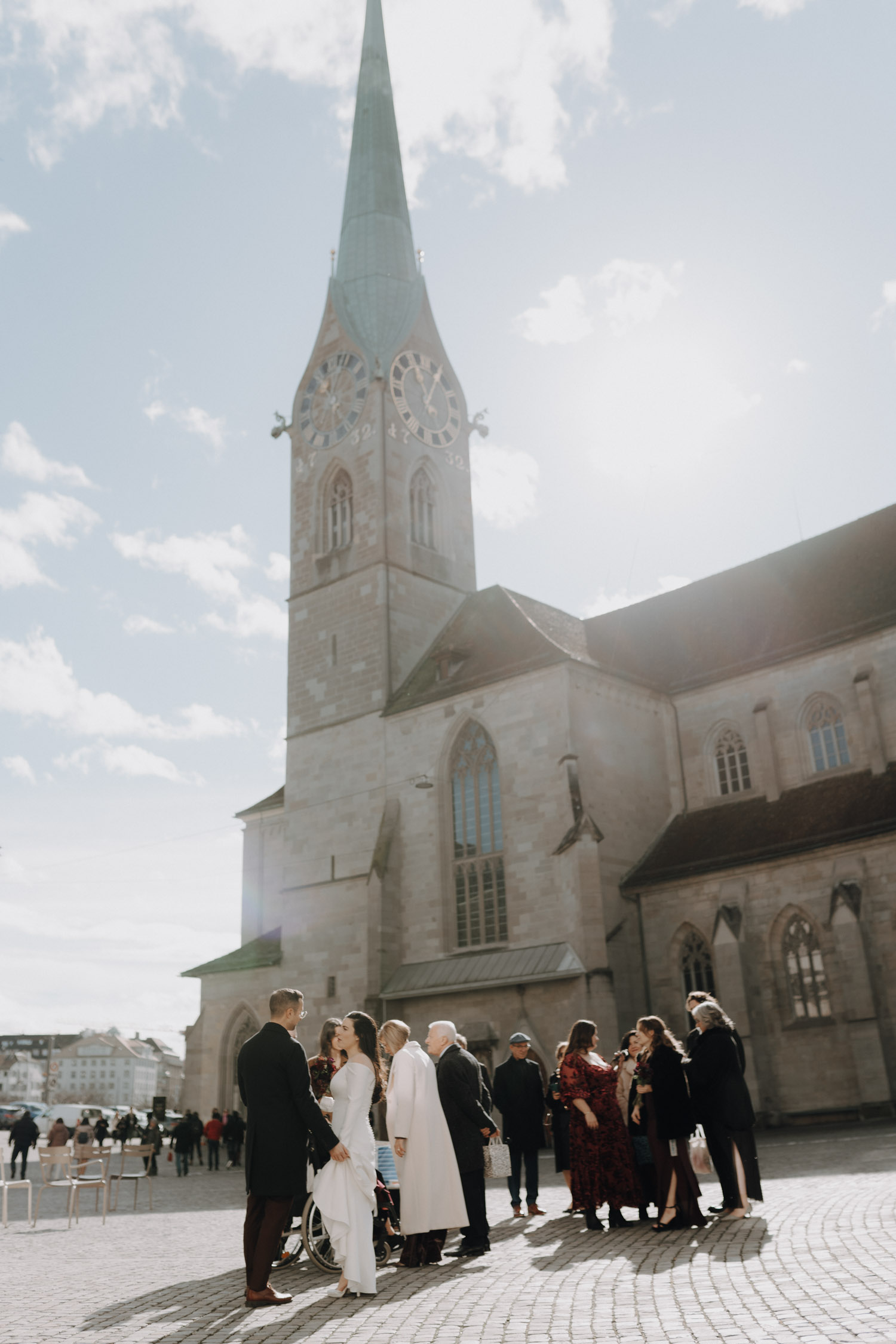 “Unser Hauptziel ist es, zu lachen, bis uns der Magen weh tut, vor Glück zu weinen, vor Freude auf und ab zu springen und das Leben und die Liebe mit unserer Familie und unseren Freunden zu feiern.” – So haben mir I & V bereits in der ersten Anfrage ihre Hochzeit beschrieben. Lange musste ich da nicht überlegen! “Farbschema: dunkles Granatapfelrot, Auberginenviolett, Artischockengrün und Gold”, ich konnte es mir plastisch vorstellen. Eine Winterhochzeit sollte es werden, mit einer Trauung im Stadthaus Zürich, einem Apéro (das ist eine wahre Untertreibung) im Hotel Storchen in Zürich und einer Fahrt in einem alten Tram durch die Stadt, der Herzensheimat des Brautpaars. Und was für ein Glück sie hatten! Den Fotos sieht man den Februar nicht an, und gespürt hat man ihn auch nicht. Es hätte durchaus auch anders kommen können, aber der Frühling schien schon etwas Einzug zu halten. Was für ein gelungener und wunderschöner Tag! Geendet hat er in einem ausgelassenen Fest im Restaurant Leafs im Engimatt City & Garden Hotel, “weil es in unserer Nachbarschaft liegt und nichts uns glücklicher machen könnte, als unsere Liebe dort zu feiern, wo alles begann.” Ich spürte den langen Tag danach noch ein paar Tage lang in den Knochen, aber das war es wert. Liebes Brautpaar – danke für euer Vertrauen!