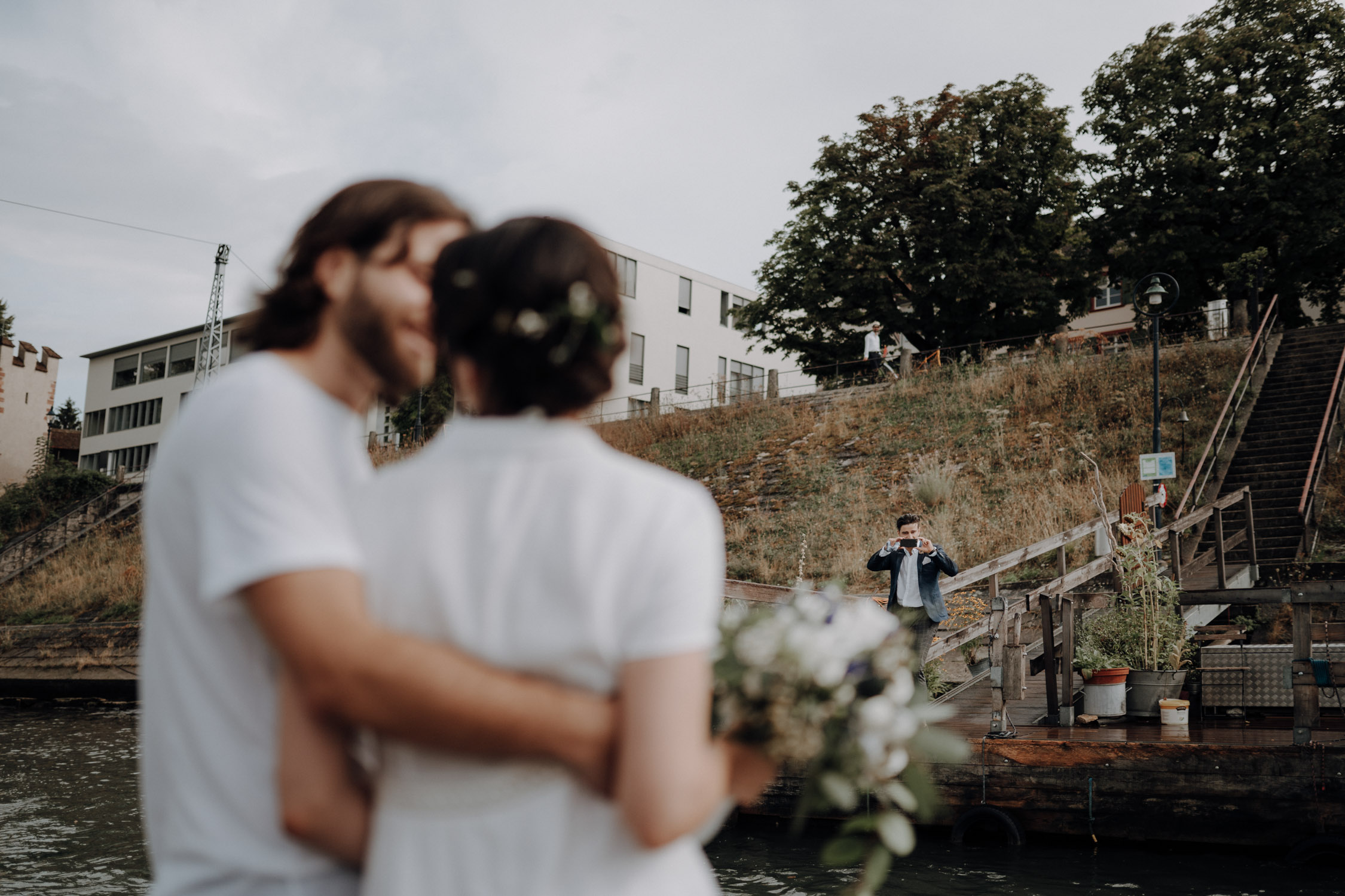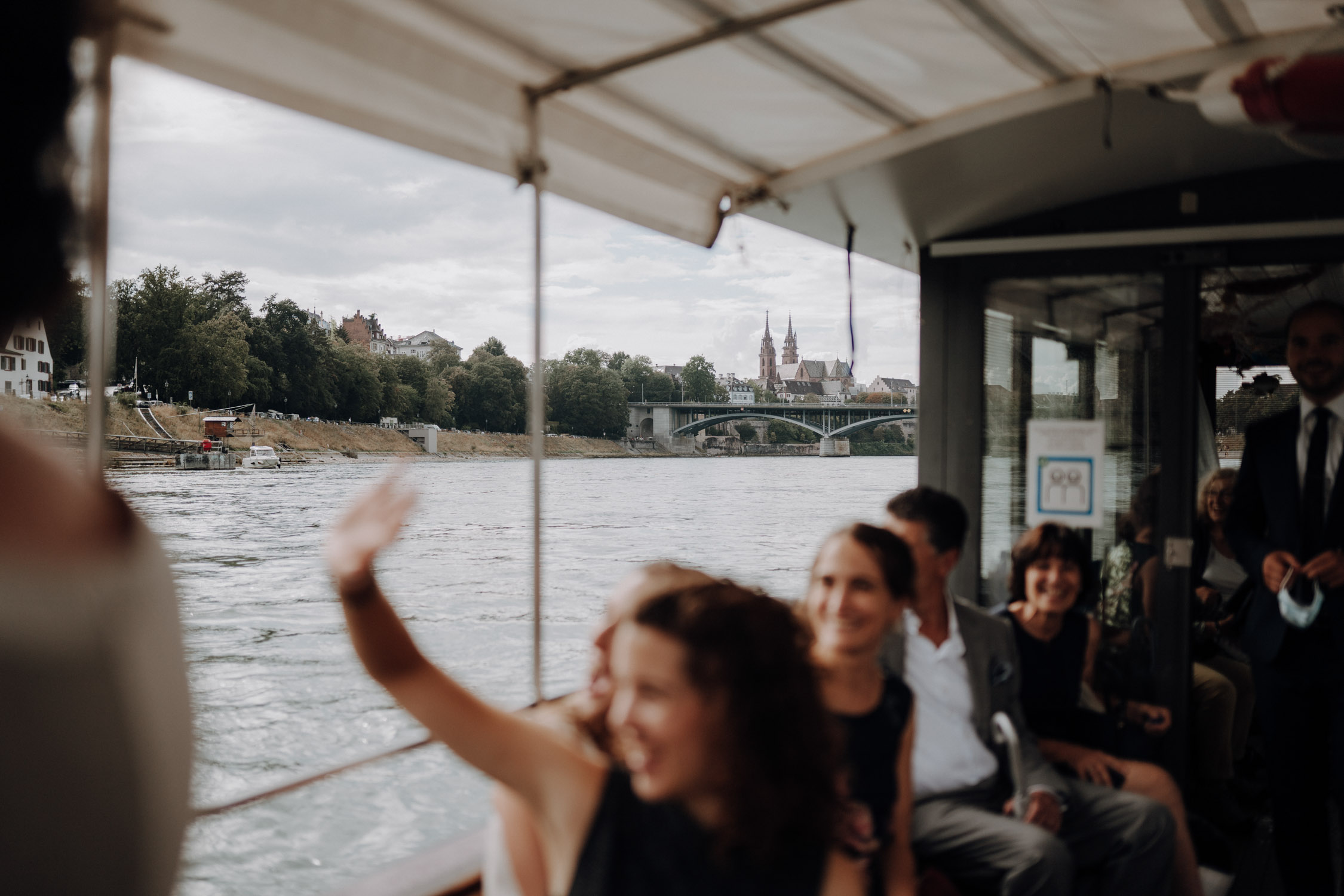 Nach dem Apéro stand mein persönliches Highlight an: Nina und Yannick wohnen in Basel, und im Sommer gehen sie – wie so viele – immer gerne im Rhein schwimmen. Dieses Ritual wollten sie auch an ihrem Hochzeitstag nicht missen. Kurz vorher fing es leicht an zu regnen, aber das konnte die Stimmung nicht trüben. Während sich die zwei ein Stück vom Rhein treiben liessen, ist der Rest der Gesellschaft durch die Stadt zum Ankunftsort gegangen, wo das Brautpaar fröhlich empfangen wurde. Die Bilder der beiden mit der Stadt im Hintergrund … ich habs geliebt. Danke Nina & Yannick – ich freue mich riesig auf Teil 2 nächstes Jahr!