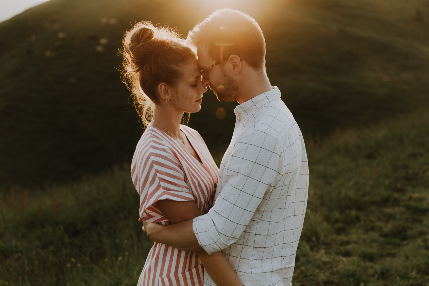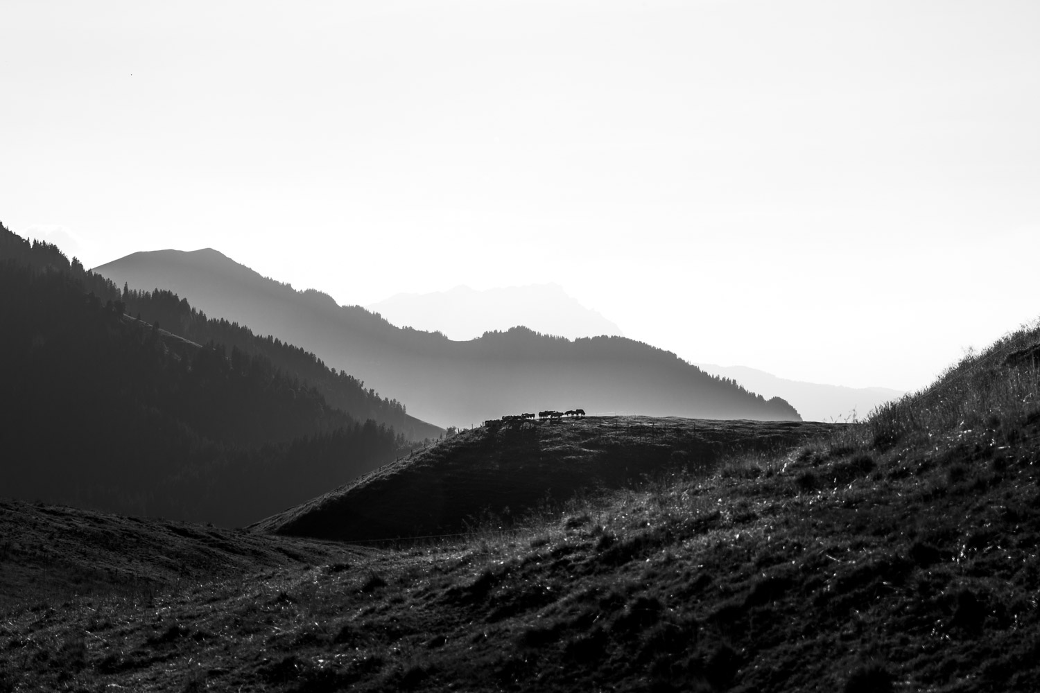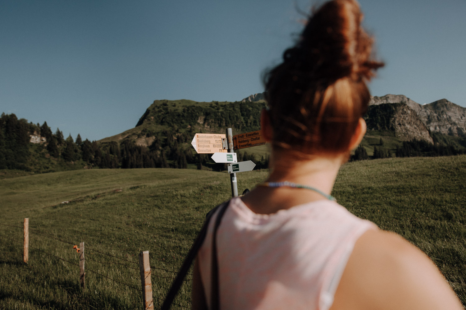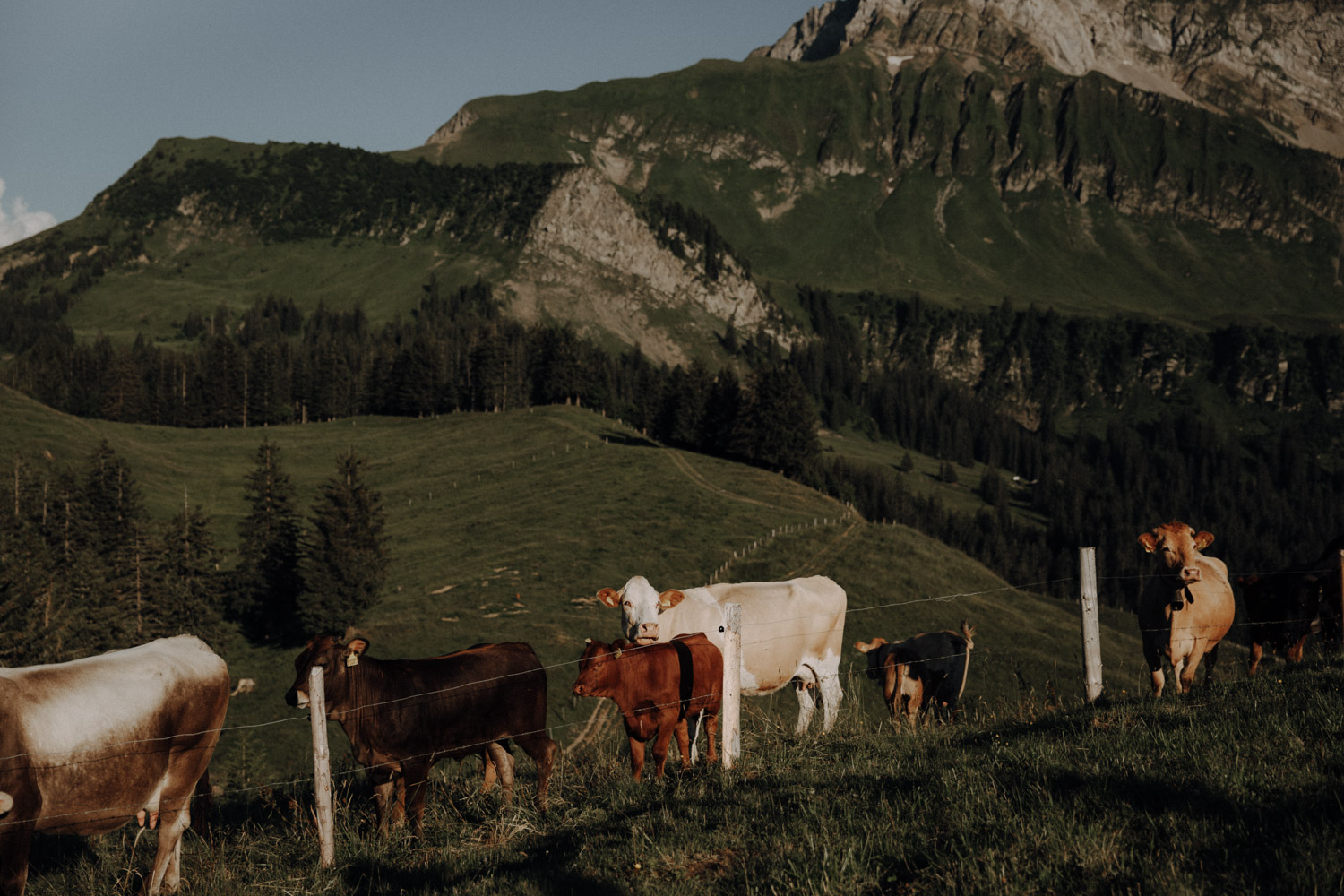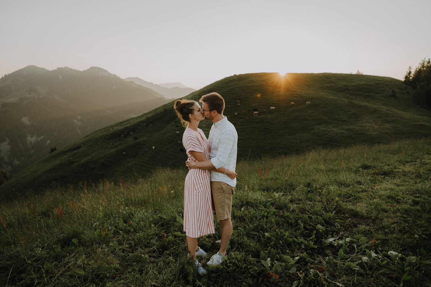 Ein After Wedding Shooting – das hätte es werden sollen. Meine Schwester hat letztes Jahr geheiratet, und obwohl wir damals schon viele, viele Fotos gemacht haben wollten wir das noch einmal wiederholen, diesmal in den Bergen. Vorab hatten wir abgesprochen, dass das Outfit diesmal nicht ganz so “steif” sein soll wie an der Hochzeit. Ich dachte dabei an etwas wie Hosenträger für den Bräutigam, oder ein anders farbiges Sakko. Wir fuhren also los, das Brautkleid und eine riesige Tasche mit Wechselkleidern im Gepäck (neben dem Hochzeits-Outfit waren auch noch normale Paarfotos geplant…). Wie schon bei Naouel & Gregor habe ich wieder Niederbauen-Chulm als Location gewählt, denn letztes Mal habe ich von weitem noch einen Felsvorsprung erspäht, den ich gerne ausprobieren wollte, der allerdings schätzungsweise eine halbe Stunde Wanderung von der Bergstation entfernt lag. Den genauen Weg kannte ich nicht, aber mit viel Gepäck und Brautkleid in der Hand zogen wir los, auf der Suche nach diesem ganz speziellen Spot. Über Kuhweiden und Trampelpfade haben wir ihn schlussendlich erreicht, und nach anfänglichen Diskussionen darüber, ob die Kuhherde uns wohl angreifen würde (natürlich nicht! :D) machten wir uns ans Einkleiden. Kurz später standen sie also da – Rebekka in ihrem heiss geliebten Brautkleid, Joel in… Shorts! 😀 Long story short – Rebekka und ich haben uns gehörig missverstanden als wir das etwas “more casual” Outfit besprochen haben, worauf sie Joel gesagt hat, er müssen keine langen Hosen mitbringen. Sonst ist sie definitiv die Modebegeistertere von uns beiden, aber diesmal ging irgendwie etwas schief. 😀 Nachdem wir ausgiebig über die Vorstellung von Braut in Brautkleid und Bräutigam in T-Shirt und Shorts daneben gelacht und ein paar Fotos von Rebekka im Brautkleid gemacht haben (wenn mans schon über Kuhweiden trägt..), hat sie sich wieder umgezogen und wir haben daraus einfach ein normales Paarshooting gemacht. Und das war super!! Von strahlendem Sonnenschein auf dem Felsvorsprung bis romantisch-kitschigem Sonnenuntergang auf dem Rückweg (um 22 Uhr ging unsere Extrafahrt vom Berg runter) bis perfekte “blue hour” zum Schluss hatten wir alles was man sich nur wünschen kann. Danke für ein perfekt-missglücktes After Wedding Shooting in den wunderschönen Schweizer Bergen!!