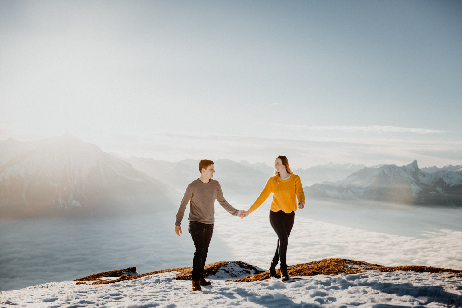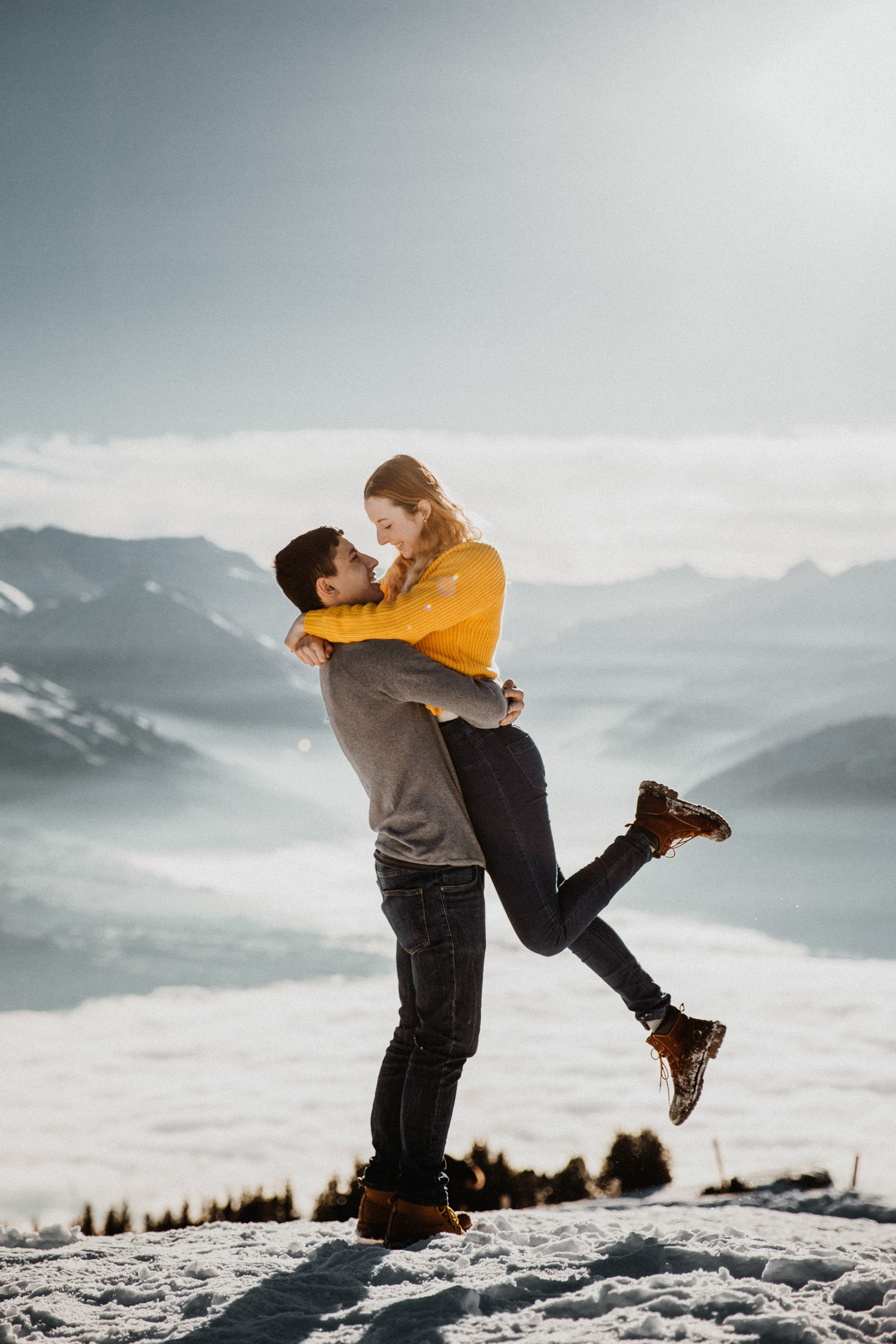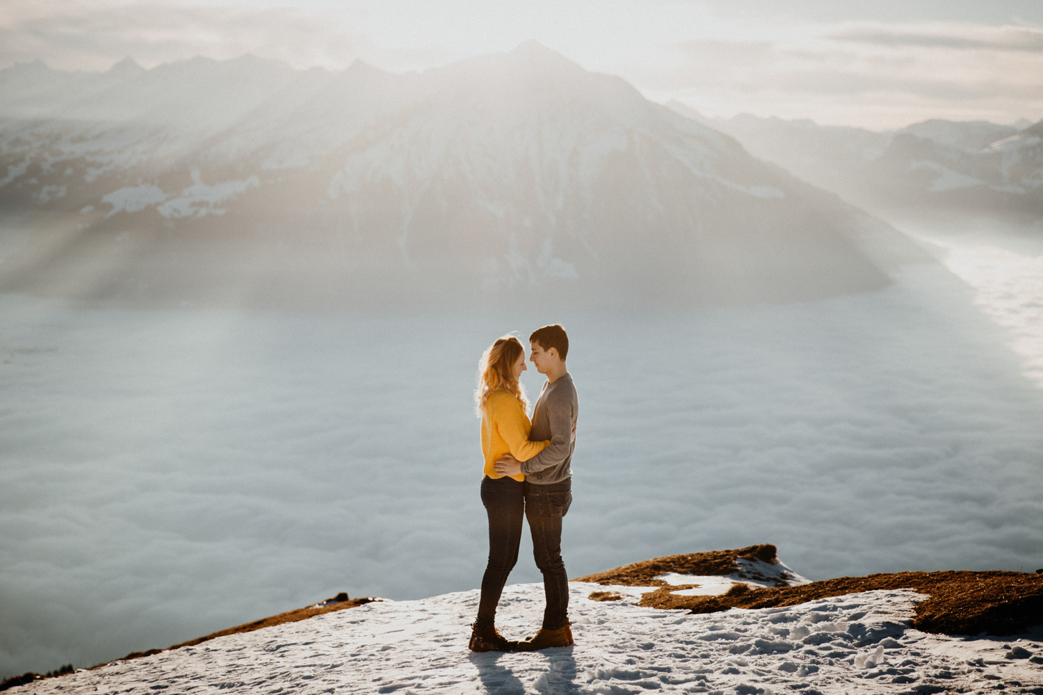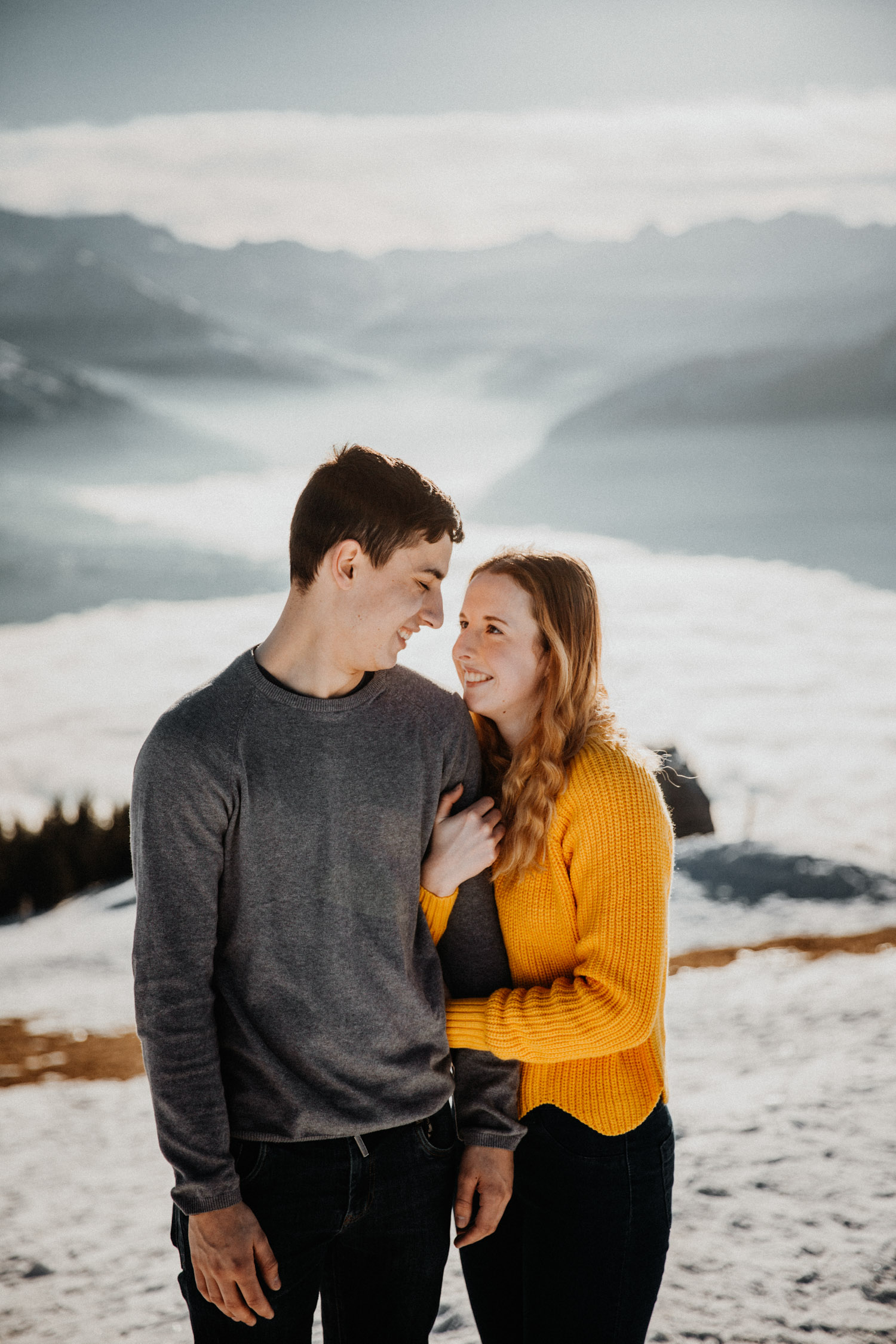 Schon lange davon geträumt – jetzt endlich mal umgesetzt: Ein Paarshooting in den Bergen. Auf Instagram habe ich einen Aufruf gemacht und nach einem Paar gesucht, Saskia & Adrian haben sich gemeldet und wenige Tage später gings ab in die Höhe! Das Niederhorn in der Region Interlaken war das Ziel, und nachdem wir viel länger als gedacht für die Seilbahn anstehen mussten kam ich schon etwas ins Schwitzen. Zum Glück hatten wir aber genügend Zeit eingeplant, und so sind wir bei perfektem Licht oben angekommen. Bei solch starker Sonne ist die Locationsuche aber nicht immer ganz so einfach wie man vielleicht denken würde, denn die Sonne gibt einem ziemlich genau vor, in welche Richtung man fotografieren muss. So sind wir losgestapft auf der Suche nach dem perfekten Ort. Irgendwo haben wir dann einfach mal begonnen. Das war schon mal nicht schlecht von der Aussicht her, aber noch nicht perfekt. Irgendwann ist uns dann etwas unterhalb von uns in der Weite ein Felsvorsprung über dem Nebelmeer aufgefallen, der ganz fernab lag von allen Touristen, hinter ein paar Bäumen versteckt. Also haben wir uns aufgemacht und sind durch den frischen und tiefen Schnee gestapft bis zu diesem absolut traumhaften Fleckchen Erde. Direkt unter uns das Nebelmeer, dahinter der mächtige Niesen – schon fast unwirklich schön! Ich hätte ewig weitermachen können, aber pünktlich zur letzten Talfahrt der Seilbahn haben wir uns dann wieder auf den Weg machen müssen. Wir hatten absolut perfekte Bedingungen für dieses unvergessliche Paarshooting, und die kurze Auszeit mit viel Sonne, Schnee und Bergluft war nicht nur gut für mein Portfolio, sondern auch für meinen Kopf! In solchen Momenten bereue ich regelmässig, dass ich nicht im Berner Oberland wohne. Ein Bergshooting ist etwas, das mein Herz höher schlagen lässt – es wird definitiv nicht das letzte gewesen sein! Danke Saskia & Adrian fürs Mitmachen! 🙂