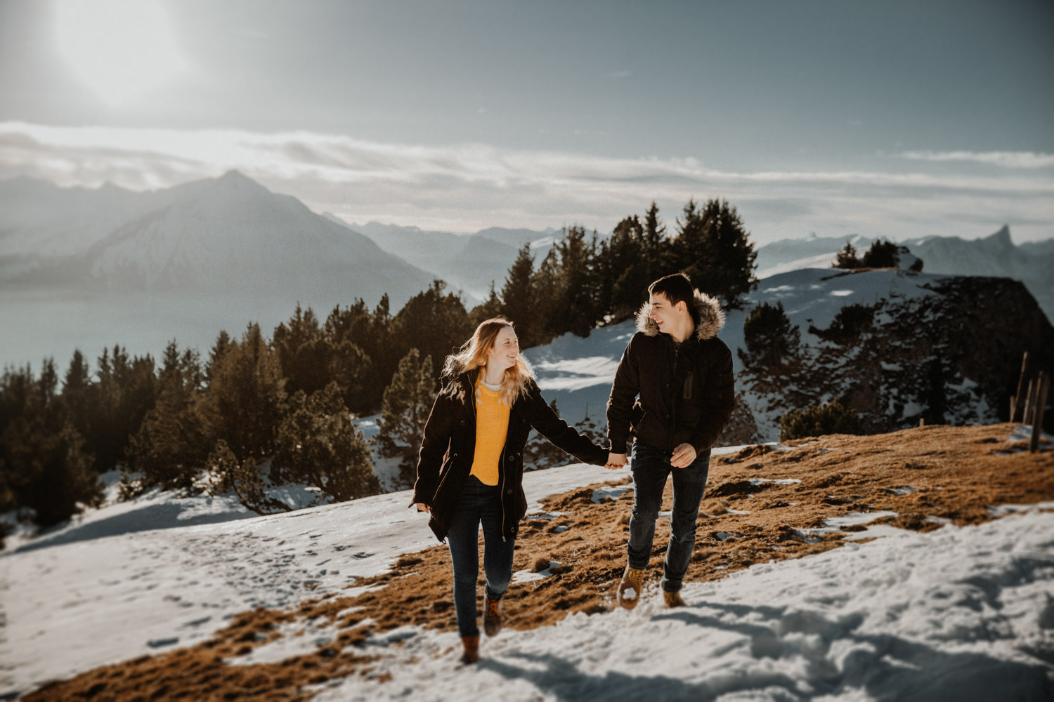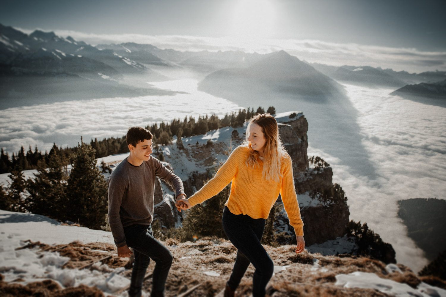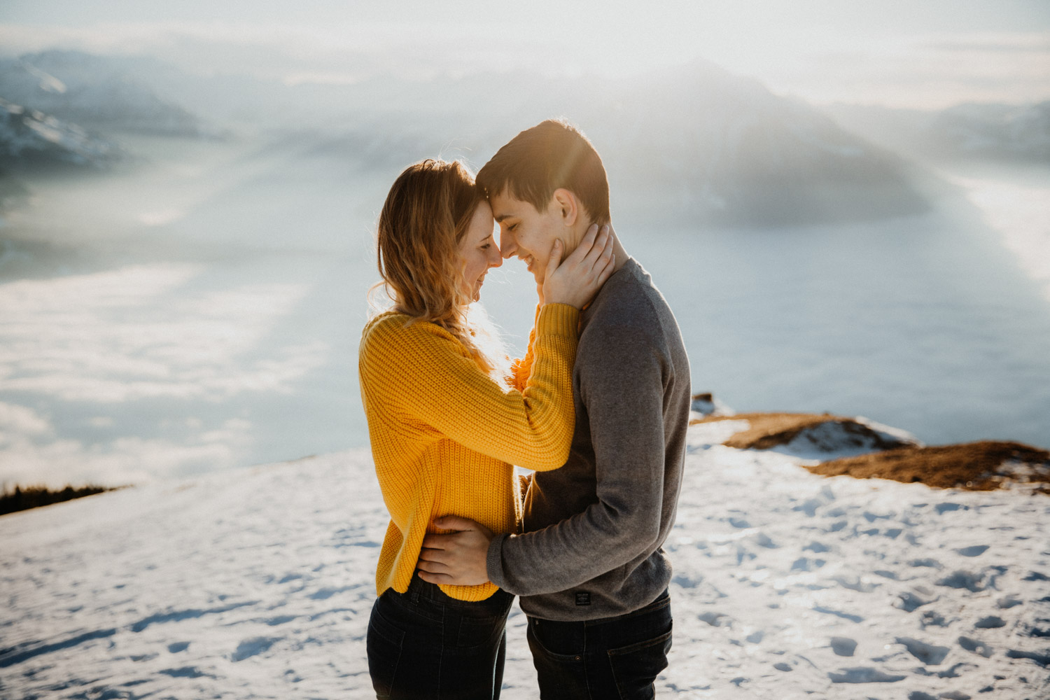Schon lange davon geträumt – jetzt endlich mal umgesetzt: Ein Paarshooting in den Bergen. Auf Instagram habe ich einen Aufruf gemacht und nach einem Paar gesucht, Saskia & Adrian haben sich gemeldet und wenige Tage später gings ab in die Höhe! Das Niederhorn in der Region Interlaken war das Ziel, und nachdem wir viel länger als gedacht für die Seilbahn anstehen mussten kam ich schon etwas ins Schwitzen. Zum Glück hatten wir aber genügend Zeit eingeplant, und so sind wir bei perfektem Licht oben angekommen. Bei solch starker Sonne ist die Locationsuche aber nicht immer ganz so einfach wie man vielleicht denken würde, denn die Sonne gibt einem ziemlich genau vor, in welche Richtung man fotografieren muss. So sind wir losgestapft auf der Suche nach dem perfekten Ort. Irgendwo haben wir dann einfach mal begonnen. Das war schon mal nicht schlecht von der Aussicht her, aber noch nicht perfekt. Irgendwann ist uns dann etwas unterhalb von uns in der Weite ein Felsvorsprung über dem Nebelmeer aufgefallen, der ganz fernab lag von allen Touristen, hinter ein paar Bäumen versteckt. Also haben wir uns aufgemacht und sind durch den frischen und tiefen Schnee gestapft bis zu diesem absolut traumhaften Fleckchen Erde. Direkt unter uns das Nebelmeer, dahinter der mächtige Niesen – schon fast unwirklich schön! Ich hätte ewig weitermachen können, aber pünktlich zur letzten Talfahrt der Seilbahn haben wir uns dann wieder auf den Weg machen müssen. Wir hatten absolut perfekte Bedingungen für dieses unvergessliche Paarshooting, und die kurze Auszeit mit viel Sonne, Schnee und Bergluft war nicht nur gut für mein Portfolio, sondern auch für meinen Kopf! In solchen Momenten bereue ich regelmässig, dass ich nicht im Berner Oberland wohne. Ein Bergshooting ist etwas, das mein Herz höher schlagen lässt – es wird definitiv nicht das letzte gewesen sein! Danke Saskia & Adrian fürs Mitmachen! 🙂