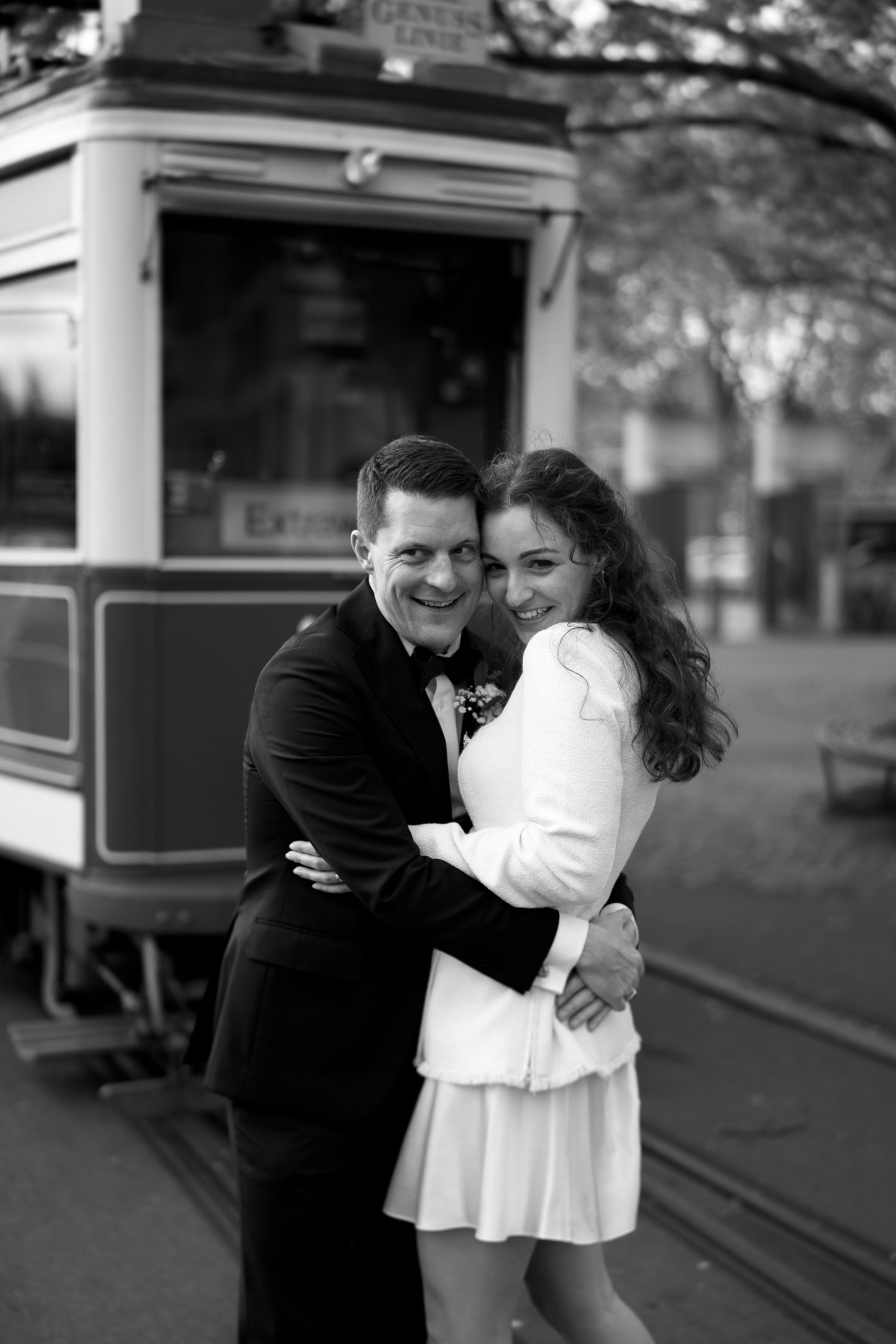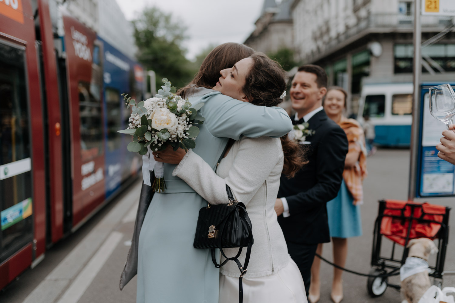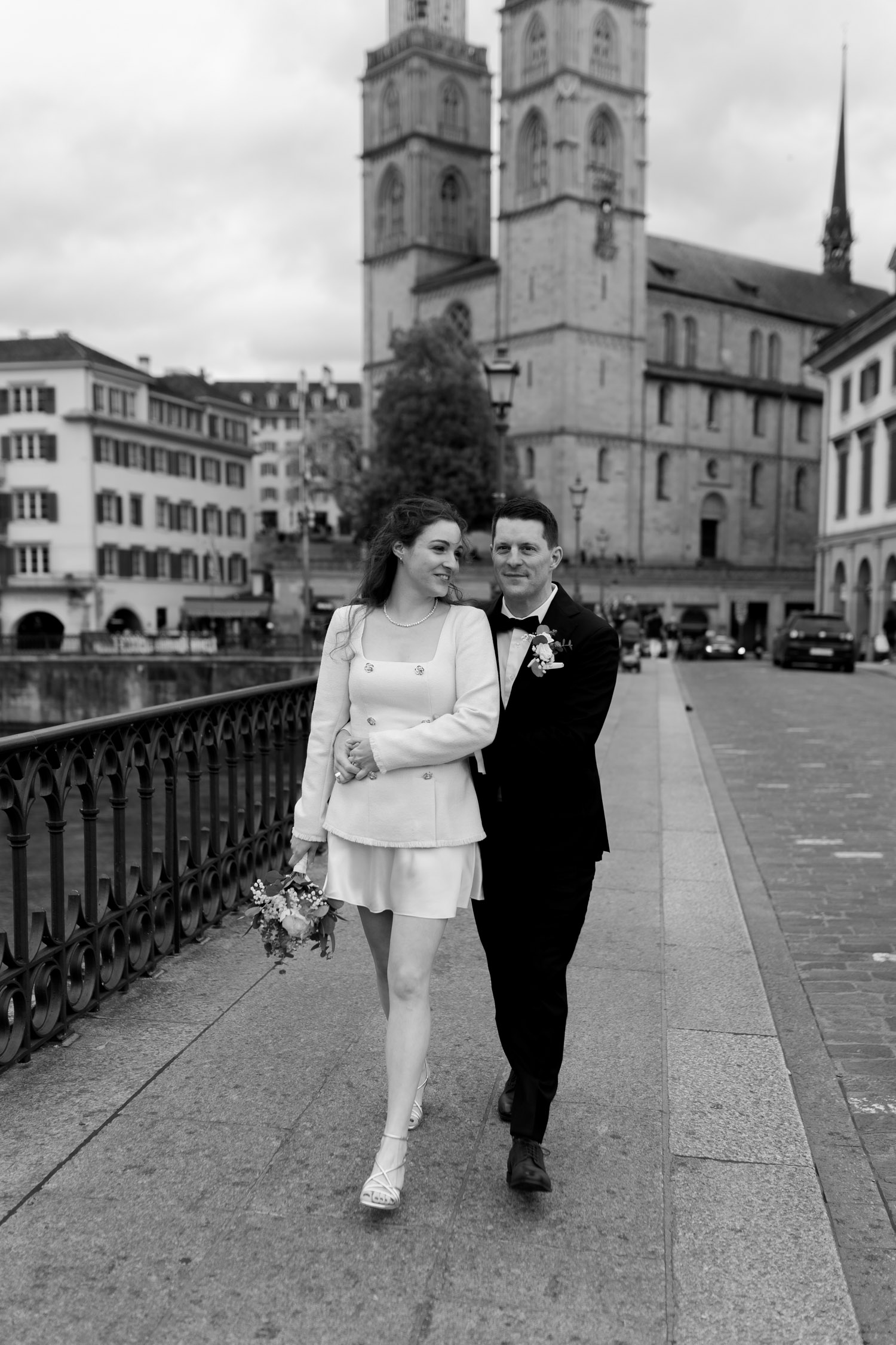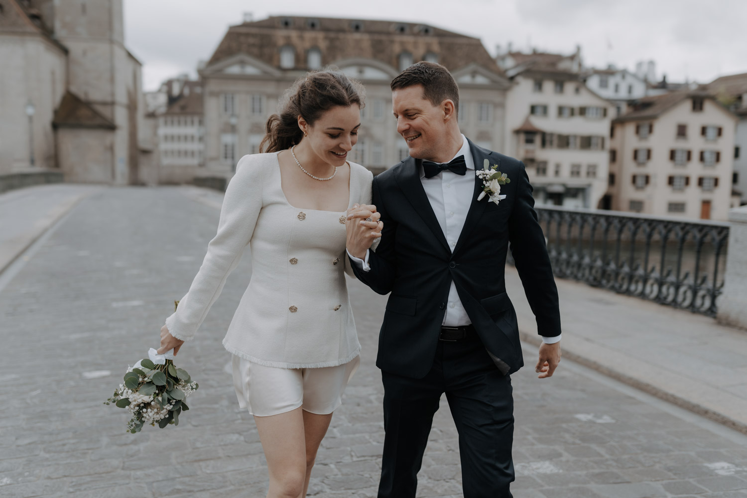 Hochzeiten in der Stadt mag ich je länger, je lieber. Alles lebt und bewegt sich, viele kleine Geschichten geschehen da und dort, und sowohl die engen Gassen einer Altstadt als auch die geschichtsträchtigen Gebäude einer Bahnhofsstrasse in Zürich passen sehr gut in das Geschehen einer Hochzeit von modernen Stadtmenschen. E & M sind in Zürich nicht nur zu Hause, sondern regelrecht verwurzelt. Das Wetter tat wider Erwarten das, was man sich erhoffte, und anders als gewöhnlich begann der Tag für mich erst nach der zivilen Trauung im Stadthaus Zürich. Ich lernte das Paar also kennen, als sie frisch getraut und über beide Ohren strahlend das Zivilstandsamt verliessen. Am Paradeplatz bestiegen wir ein altes Tram, am Bellevue stiess der Rest der Hochzeitsgesellschaft dazu, und so ging es dann auf eine ausgedehnte Tour durch diese schöne Stadt Zürich. Nach einem kurzen Paarshooting auf der Münsterbrücke (wo sonst) kehrte die Gesellschaft im Zunfthaus zur Waag ein, und für mich war es Zeit, den Heimweg anzutreten. Nur zwei Tage später war es Zeit für die grosse Hochzeit, dieses Mal aber in Engelberg. Und nur ein paar Wochen nach diesem Wochenende traf ich den Bräutigam zufällig in irgendeinem Lift in Zürich – man sieht sich eben doch immer dreimal im Leben. Vielleicht aber auch öfter, ich würde mich freuen. Danke E & M!