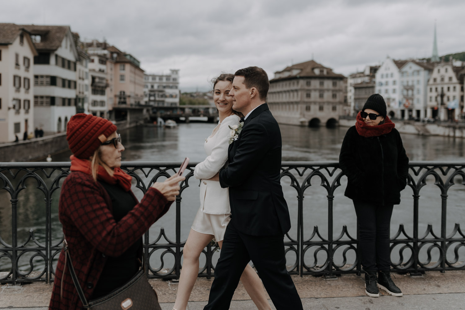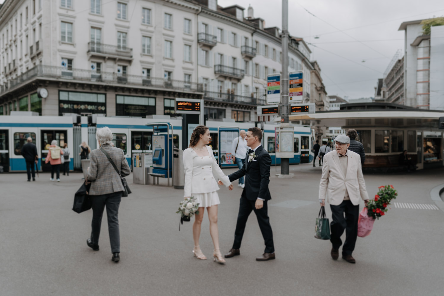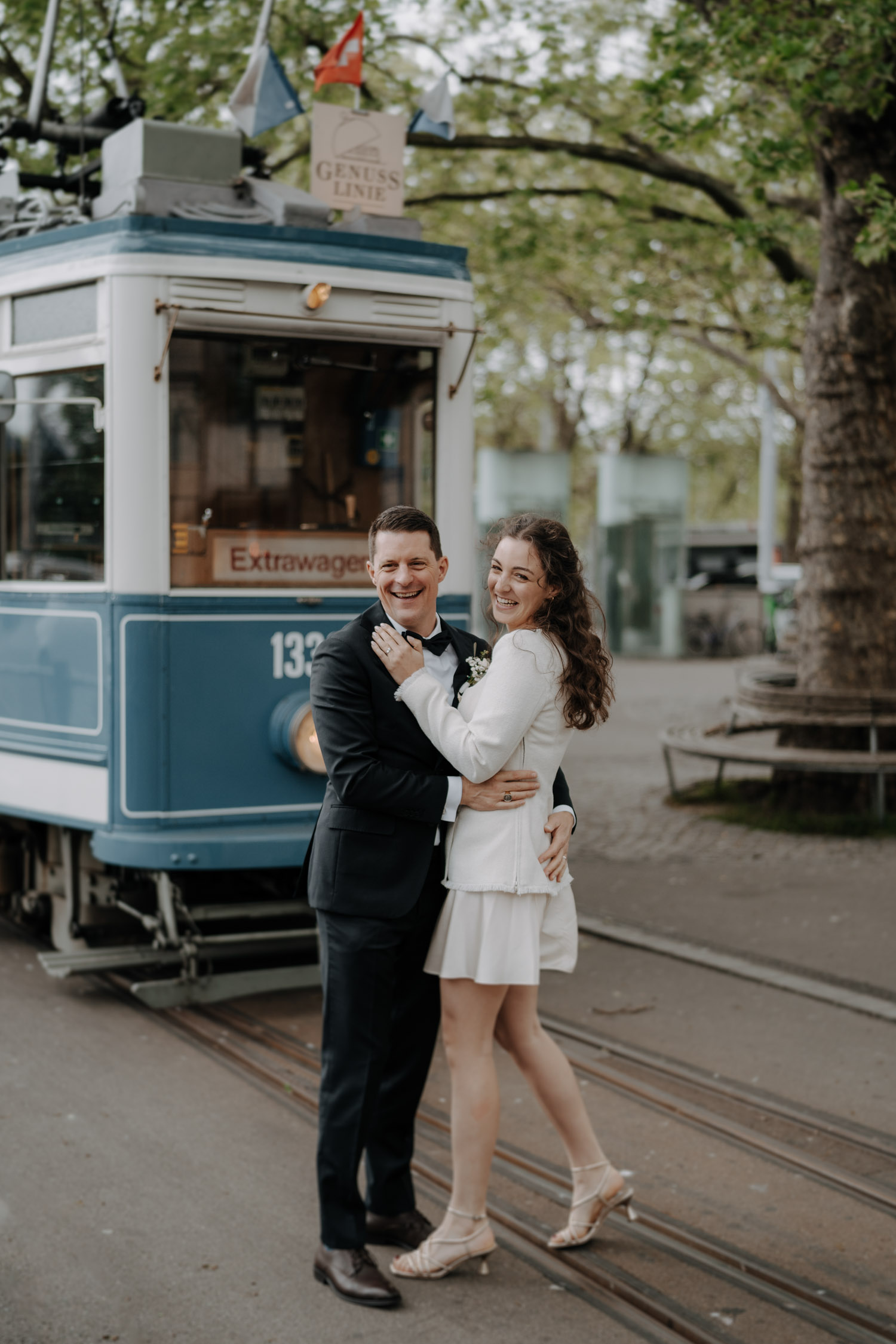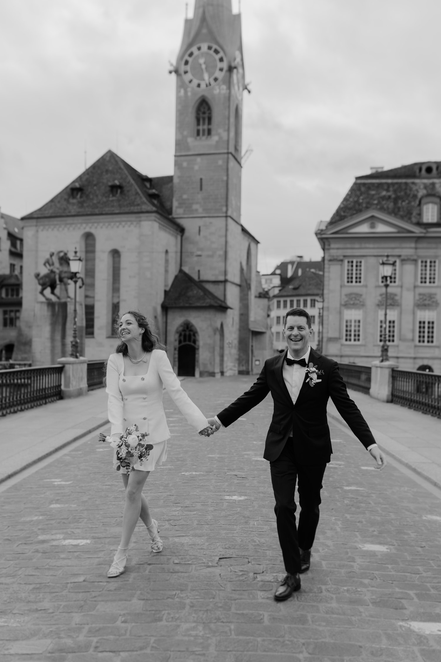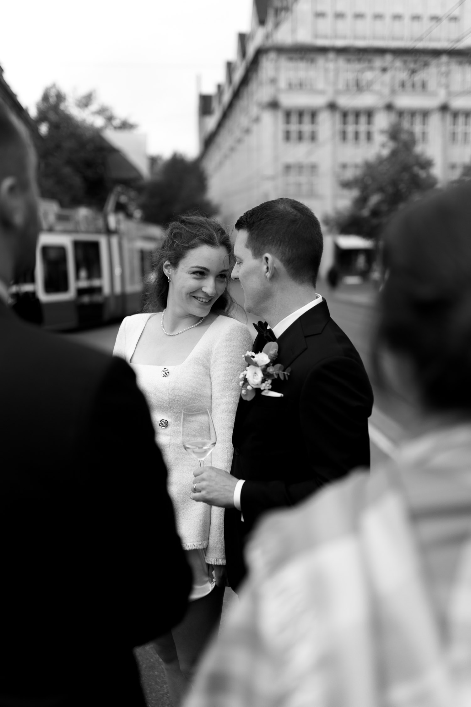 Hochzeiten in der Stadt mag ich je länger, je lieber. Alles lebt und bewegt sich, viele kleine Geschichten geschehen da und dort, und sowohl die engen Gassen einer Altstadt als auch die geschichtsträchtigen Gebäude einer Bahnhofsstrasse in Zürich passen sehr gut in das Geschehen einer Hochzeit von modernen Stadtmenschen. E & M sind in Zürich nicht nur zu Hause, sondern regelrecht verwurzelt. Das Wetter tat wider Erwarten das, was man sich erhoffte, und anders als gewöhnlich begann der Tag für mich erst nach der zivilen Trauung im Stadthaus Zürich. Ich lernte das Paar also kennen, als sie frisch getraut und über beide Ohren strahlend das Zivilstandsamt verliessen. Am Paradeplatz bestiegen wir ein altes Tram, am Bellevue stiess der Rest der Hochzeitsgesellschaft dazu, und so ging es dann auf eine ausgedehnte Tour durch diese schöne Stadt Zürich. Nach einem kurzen Paarshooting auf der Münsterbrücke (wo sonst) kehrte die Gesellschaft im Zunfthaus zur Waag ein, und für mich war es Zeit, den Heimweg anzutreten. Nur zwei Tage später war es Zeit für die grosse Hochzeit, dieses Mal aber in Engelberg. Und nur ein paar Wochen nach diesem Wochenende traf ich den Bräutigam zufällig in irgendeinem Lift in Zürich – man sieht sich eben doch immer dreimal im Leben. Vielleicht aber auch öfter, ich würde mich freuen. Danke E & M!