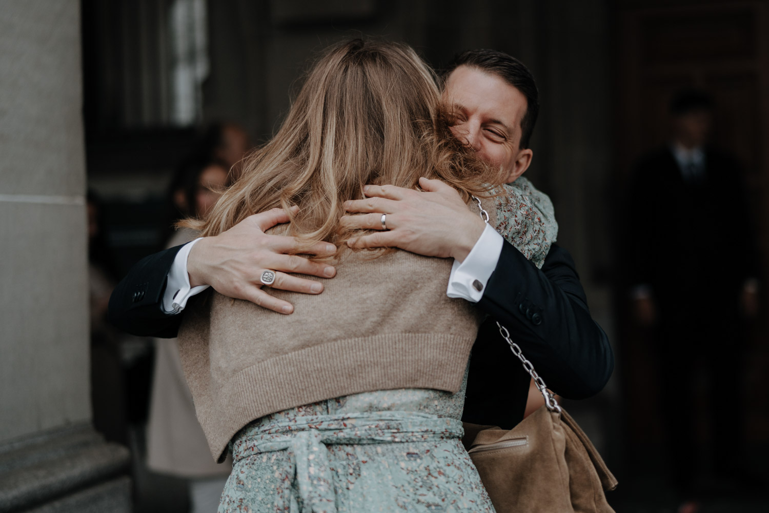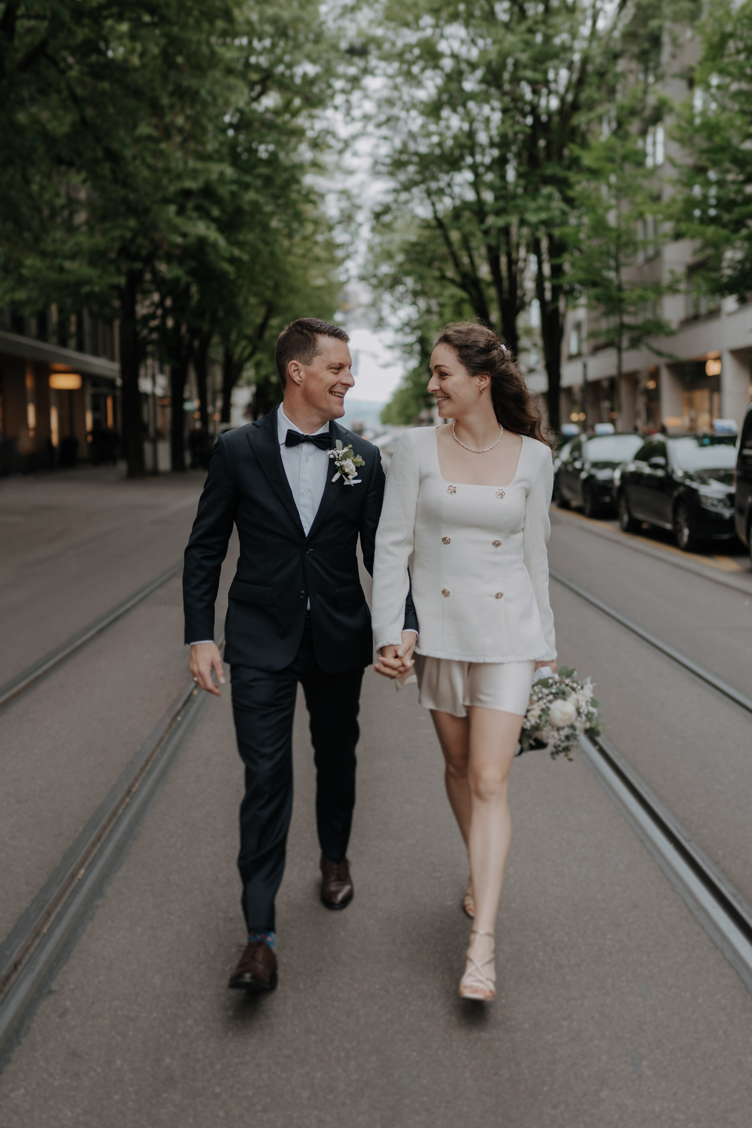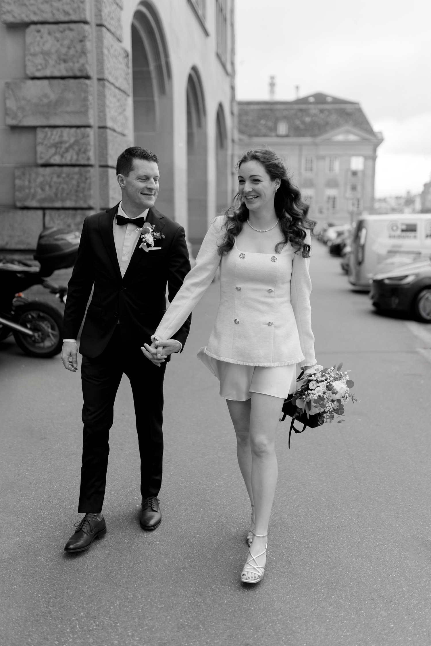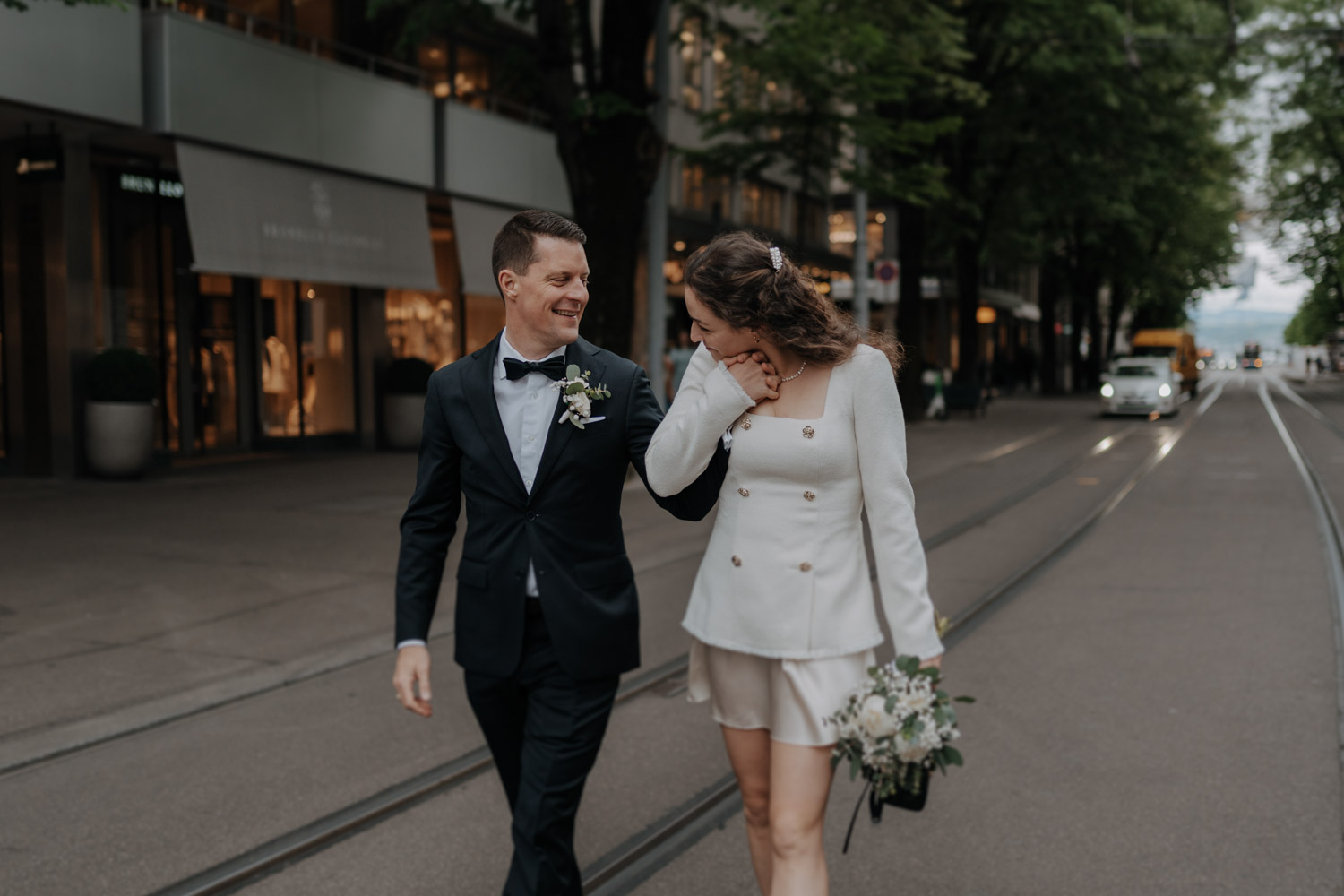 Hochzeiten in der Stadt mag ich je länger, je lieber. Alles lebt und bewegt sich, viele kleine Geschichten geschehen da und dort, und sowohl die engen Gassen einer Altstadt als auch die geschichtsträchtigen Gebäude einer Bahnhofsstrasse in Zürich passen sehr gut in das Geschehen einer Hochzeit von modernen Stadtmenschen. E & M sind in Zürich nicht nur zu Hause, sondern regelrecht verwurzelt. Das Wetter tat wider Erwarten das, was man sich erhoffte, und anders als gewöhnlich begann der Tag für mich erst nach der zivilen Trauung im Stadthaus Zürich. Ich lernte das Paar also kennen, als sie frisch getraut und über beide Ohren strahlend das Zivilstandsamt verliessen. Am Paradeplatz bestiegen wir ein altes Tram, am Bellevue stiess der Rest der Hochzeitsgesellschaft dazu, und so ging es dann auf eine ausgedehnte Tour durch diese schöne Stadt Zürich. Nach einem kurzen Paarshooting auf der Münsterbrücke (wo sonst) kehrte die Gesellschaft im Zunfthaus zur Waag ein, und für mich war es Zeit, den Heimweg anzutreten. Nur zwei Tage später war es Zeit für die grosse Hochzeit, dieses Mal aber in Engelberg. Und nur ein paar Wochen nach diesem Wochenende traf ich den Bräutigam zufällig in irgendeinem Lift in Zürich – man sieht sich eben doch immer dreimal im Leben. Vielleicht aber auch öfter, ich würde mich freuen. Danke E & M!