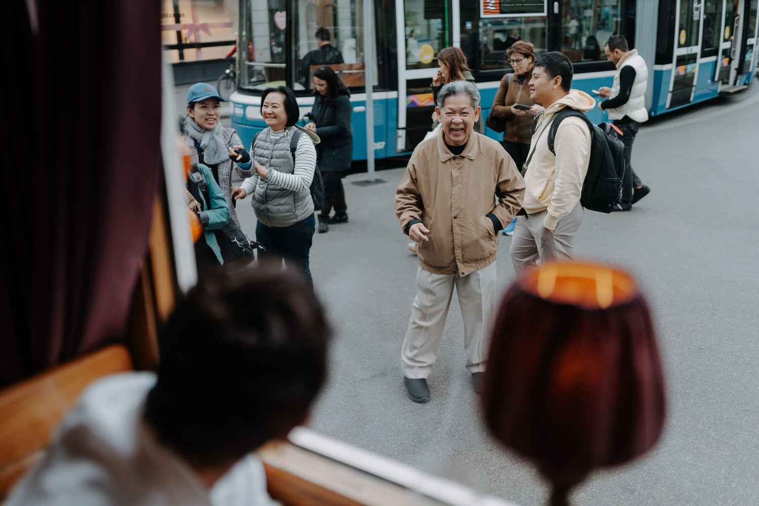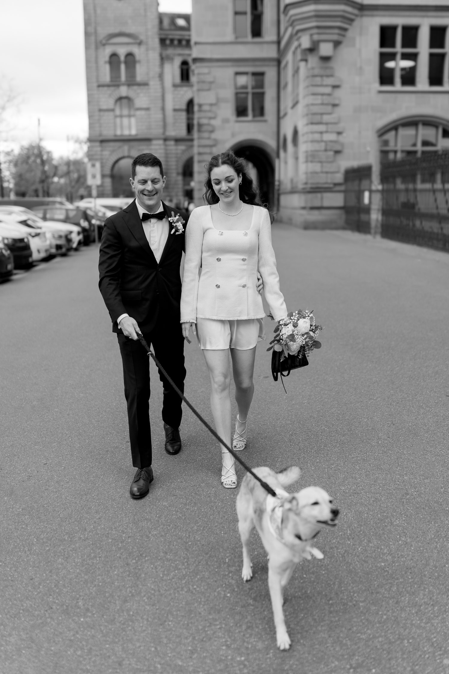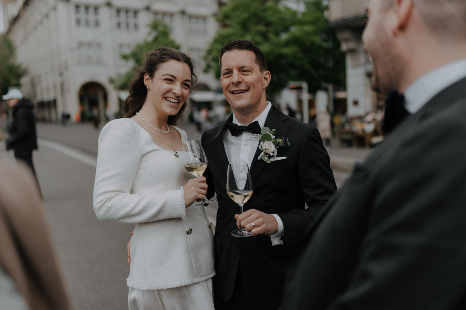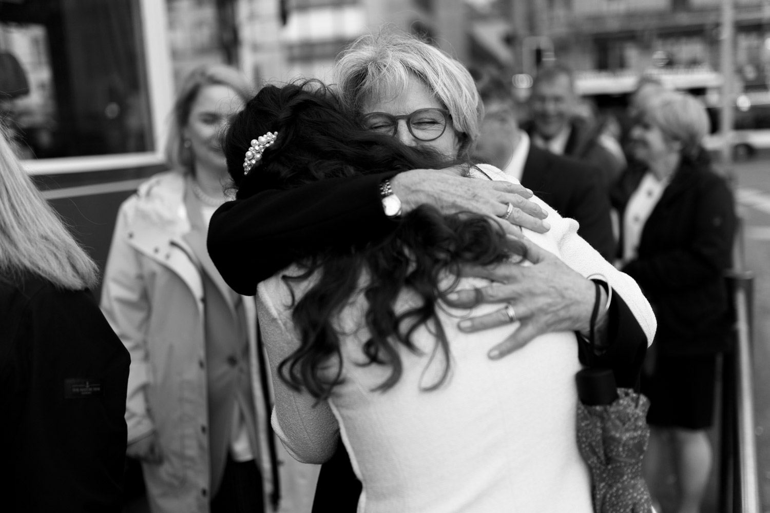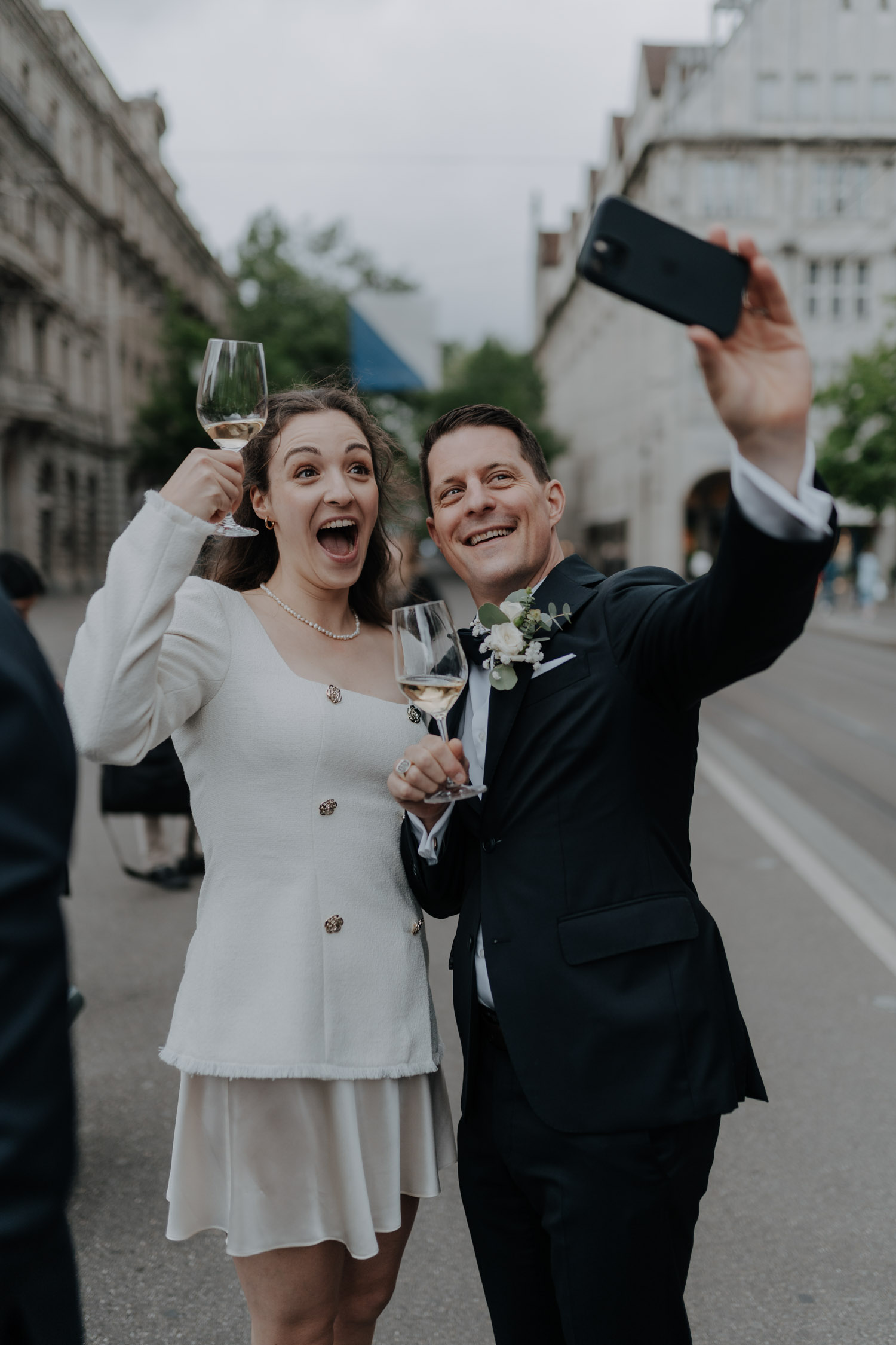 Hochzeiten in der Stadt mag ich je länger, je lieber. Alles lebt und bewegt sich, viele kleine Geschichten geschehen da und dort, und sowohl die engen Gassen einer Altstadt als auch die geschichtsträchtigen Gebäude einer Bahnhofsstrasse in Zürich passen sehr gut in das Geschehen einer Hochzeit von modernen Stadtmenschen. E & M sind in Zürich nicht nur zu Hause, sondern regelrecht verwurzelt. Das Wetter tat wider Erwarten das, was man sich erhoffte, und anders als gewöhnlich begann der Tag für mich erst nach der zivilen Trauung im Stadthaus Zürich. Ich lernte das Paar also kennen, als sie frisch getraut und über beide Ohren strahlend das Zivilstandsamt verliessen. Am Paradeplatz bestiegen wir ein altes Tram, am Bellevue stiess der Rest der Hochzeitsgesellschaft dazu, und so ging es dann auf eine ausgedehnte Tour durch diese schöne Stadt Zürich. Nach einem kurzen Paarshooting auf der Münsterbrücke (wo sonst) kehrte die Gesellschaft im Zunfthaus zur Waag ein, und für mich war es Zeit, den Heimweg anzutreten. Nur zwei Tage später war es Zeit für die grosse Hochzeit, dieses Mal aber in Engelberg. Und nur ein paar Wochen nach diesem Wochenende traf ich den Bräutigam zufällig in irgendeinem Lift in Zürich – man sieht sich eben doch immer dreimal im Leben. Vielleicht aber auch öfter, ich würde mich freuen. Danke E & M!